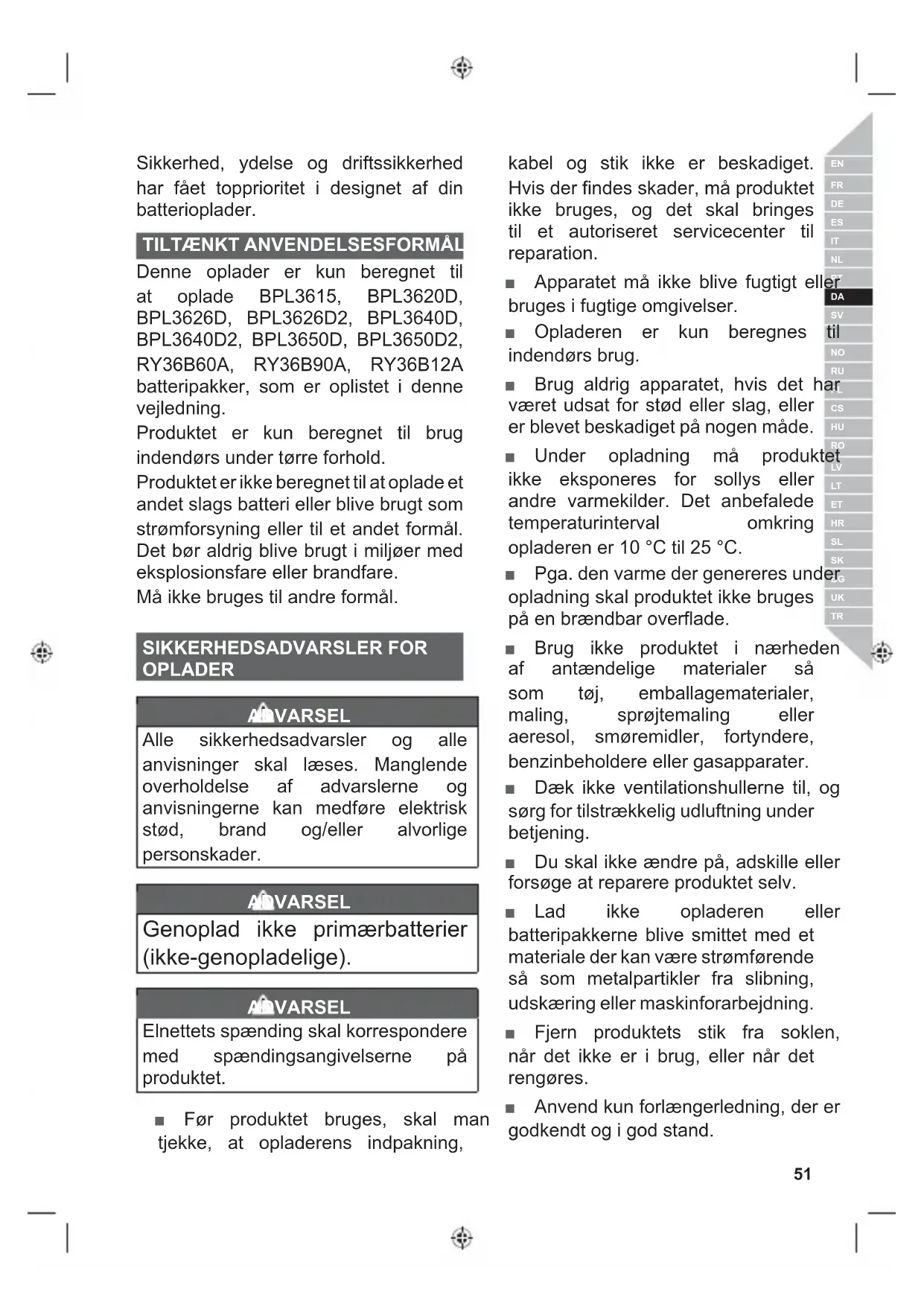 Denne oplader er kun beregnet til at oplade BPL3615, BPL3620D, BPL3626D, BPL3626D2, BPL3640D, BPL3640D2, BPL3650D, BPL3650D2, RY36B60A, RY36B90A, RY36B12A batteripakker, som er oplistet i denne vejledning. Produktet er kun beregnet til brug indendørs under tørre forhold. Produktet er ikke beregnet til at oplade et andet slags batteri eller blive brugt som strømforsyning eller til et andet formål. Det bør aldrig blive brugt i miljøer med eksplosionsfare eller brandfare. Må ikke bruges til andre formål. SIKKERHEDSADVARSLER FOR OPLADER ADVARSEL Alle sikkerhedsadvarsler og alle anvisninger skal læses. Manglende overholdelse af advarslerne og anvisningerne kan medføre elektrisk stød, brand og/eller alvorlige personskader. ADVARSEL Genoplad ikke primærbatterier (ikke-genopladelige). ADVARSEL Elnettets spænding skal korrespondere med spændingsangivelserne på produktet. ■ Før produktet bruges, skal man tjekke, at opladerens indpakning, kabel og stik ikke er beskadiget. Hvis der findes skader, må produktet ikke bruges, og det skal bringes til et autoriseret servicecenter til reparation. ■ Apparatet må ikke blive fugtigt eller bruges i fugtige omgivelser. ■ Opladeren er kun beregnes til indendørs brug. ■ Brug aldrig apparatet, hvis det har været udsat for stød eller slag, eller er blevet beskadiget på nogen måde. ■ Under opladning må produktet ikke eksponeres for sollys eller andre varmekilder. Det anbefalede temperaturinterval omkring opladeren er 10 °C til 25 °C. ■ Pga. den varme der genereres under opladning skal produktet ikke bruges på en brændbar overflade. ■ Brug ikke produktet i nærheden af antændelige materialer så som tøj, emballagematerialer, maling, sprøjtemaling eller aeresol, smøremidler, fortyndere, benzinbeholdere eller gasapparater. ■ Dæk ikke ventilationshullerne til, og sørg for tilstrækkelig udluftning under betjening. ■ Du skal ikke ændre på, adskille eller forsøge at reparere produktet selv. ■ Lad ikke opladeren eller batteripakkerne blive smittet med et materiale der kan være strømførende så som metalpartikler fra slibning, udskæring eller maskinforarbejdning. ■ Fjern produktets stik fra soklen, når det ikke er i brug, eller når det rengøres. ■ Anvend kun forlængerledning, der er godkendt og i god stand.52 | Dansk ■ Oplad ikke batteripakker, der viser tegn på lækage. De skal bortskaffes på ordentlig vis. ■ Oplad aldrig et beskadiget batterisæt. Udskift beskadigede batteripakker med det samme. ■ Inden hver brug skal man kontrollere elkablet for evt. beskadigelser. Hvis det opviser tegn på skader, skal det udskiftes af en autoriseret person på et autoriseret servicecenter for at undgå farlige situationer. YDERLIGERE SIKKERHEDSADVARSLER OM BATTERI ADVARSEL For at undgå risiko for brand, kvæstelser eller beskadigelse af produktet forårsaget af kortslutning må værktøjet, batteripakken eller opladeren ikke nedsænkes i vand. Sørg ligeledes for, at der ikke trænger væske ind i enhederne og batterierne. Korroderende eller ledende væsker, f.eks. saltvand, bestemte kemikalier, blegestoffer eller produkter, som indeholder blegemidler, kan forårsage kortslutning. MILJØBESKYTTELSE Råmaterialerne skal genvindes og ikke bortkastes med almindeligt affald. Af hensyn til miljøet skal redskab, tilbehør og emballage sorteres. VEKSELSTRØM BATTERIOPLADNING Batteripakker forsendes i lav opladet tilstand. Derfor bør du oplade dem før første brug. Hvis opladeren ikke oplader din batteripakke under normale omstændigheder, skal du returnere både batteripakken og opladeren til dit nærmeste autoriserede servicecenter. Undersøg om strømforsyningen nu også er 220-240 volt, 5060Hz, udelukkende vekselstrøm (strøm til almindelig privat brug). Kontroller, at batteripakkens pal klikker på plads, og at batteripakken er fastgjort i laderen inden opladning. BEMÆRK: Når batteriet bliver fuldt opladet, forbliver den grønne LED tændt. Det er normalt, at batteripakken bliver lidt varm at røre ved umder opladningen. Hverken oplader eller batteri må anbringes på steder med ekstrem varme eller kulde. De fungerer bedst ved normal rumtemperatur. BEMÆRK: Under opladning skal laderen og batteripakken anbringes på et sted, hvor temperaturen er mere end 10° C, men mindre end 25° C.