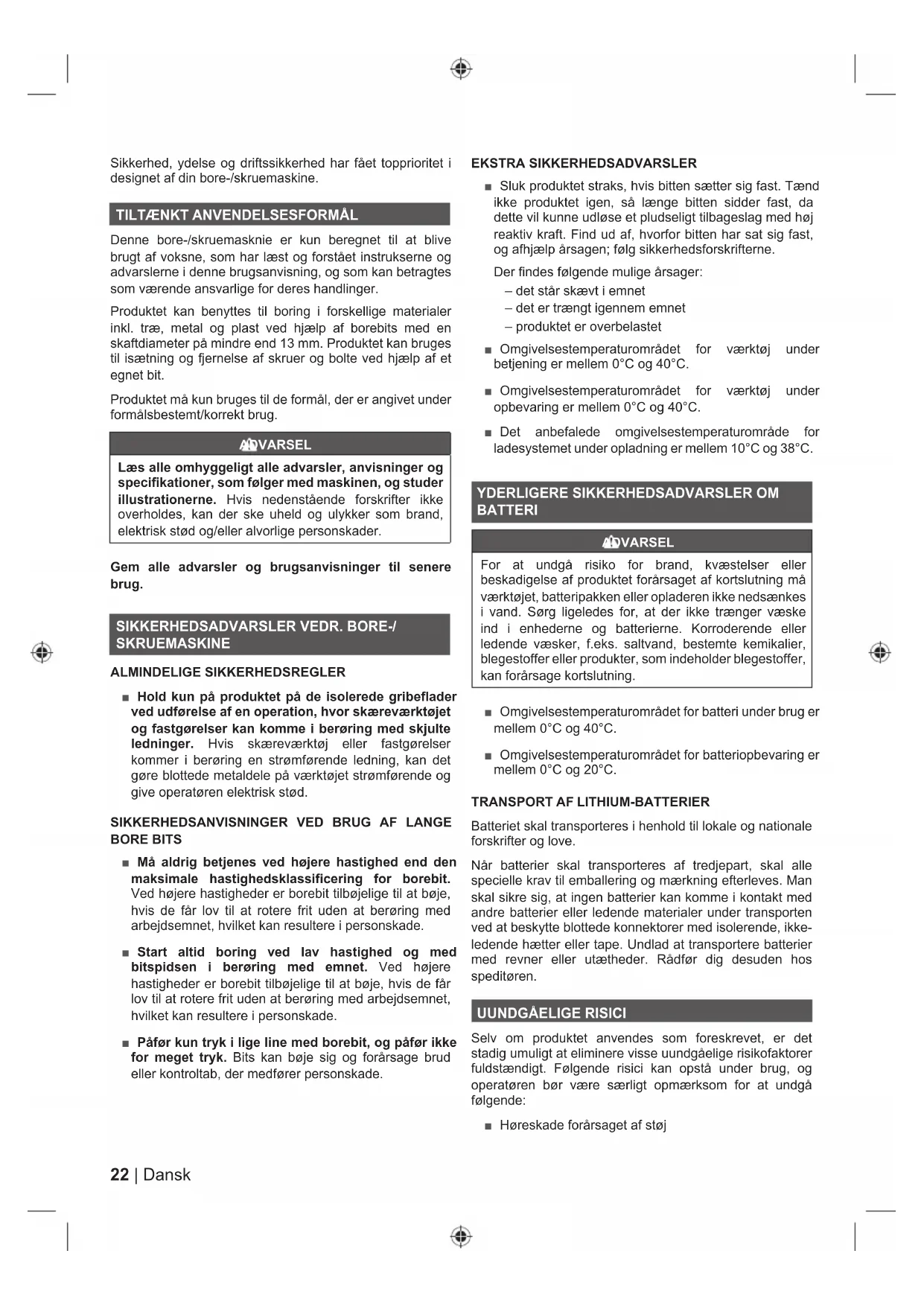 BORE BITS ■ Må aldrig betjenes ved højere hastighed end den maksimale hastighedsklassificering for borebit. Ved højere hastigheder er borebit tilbøjelige til at bøje, hvis de får lov til at rotere frit uden at berøring med arbejdsemnet, hvilket kan resultere i personskade. ■ Start altid boring ved lav hastighed og med bitspidsen i berøring med emnet. Ved højere hastigheder er borebit tilbøjelige til at bøje, hvis de får lov til at rotere frit uden at berøring med arbejdsemnet, hvilket kan resultere i personskade. ■ Påfør kun tryk i lige line med borebit, og påfør ikke for meget tryk. Bits kan bøje sig og forårsage brud eller kontroltab, der medfører personskade. EKSTRA SIKKERHEDSADVARSLER ■ Sluk produktet straks, hvis bitten sætter sig fast. Tænd ikke produktet igen, så længe bitten sidder fast, da dette vil kunne udløse et pludseligt tilbageslag med høj reaktiv kraft. Find ud af, hvorfor bitten har sat sig fast, og afhjælp årsagen; følg sikkerhedsforskrifterne. Der findes følgende mulige årsager: – det står skævt i emnet – det er trængt igennem emnet – produktet er overbelastet ■ Omgivelsestemperaturområdet for værktøj under betjening er mellem 0°C og 40°C. ■ Omgivelsestemperaturområdet for værktøj under opbevaring er mellem 0°C og 40°C. ■ Det anbefalede omgivelsestemperaturområde for ladesystemet under opladning er mellem 10°C og 38°C.
