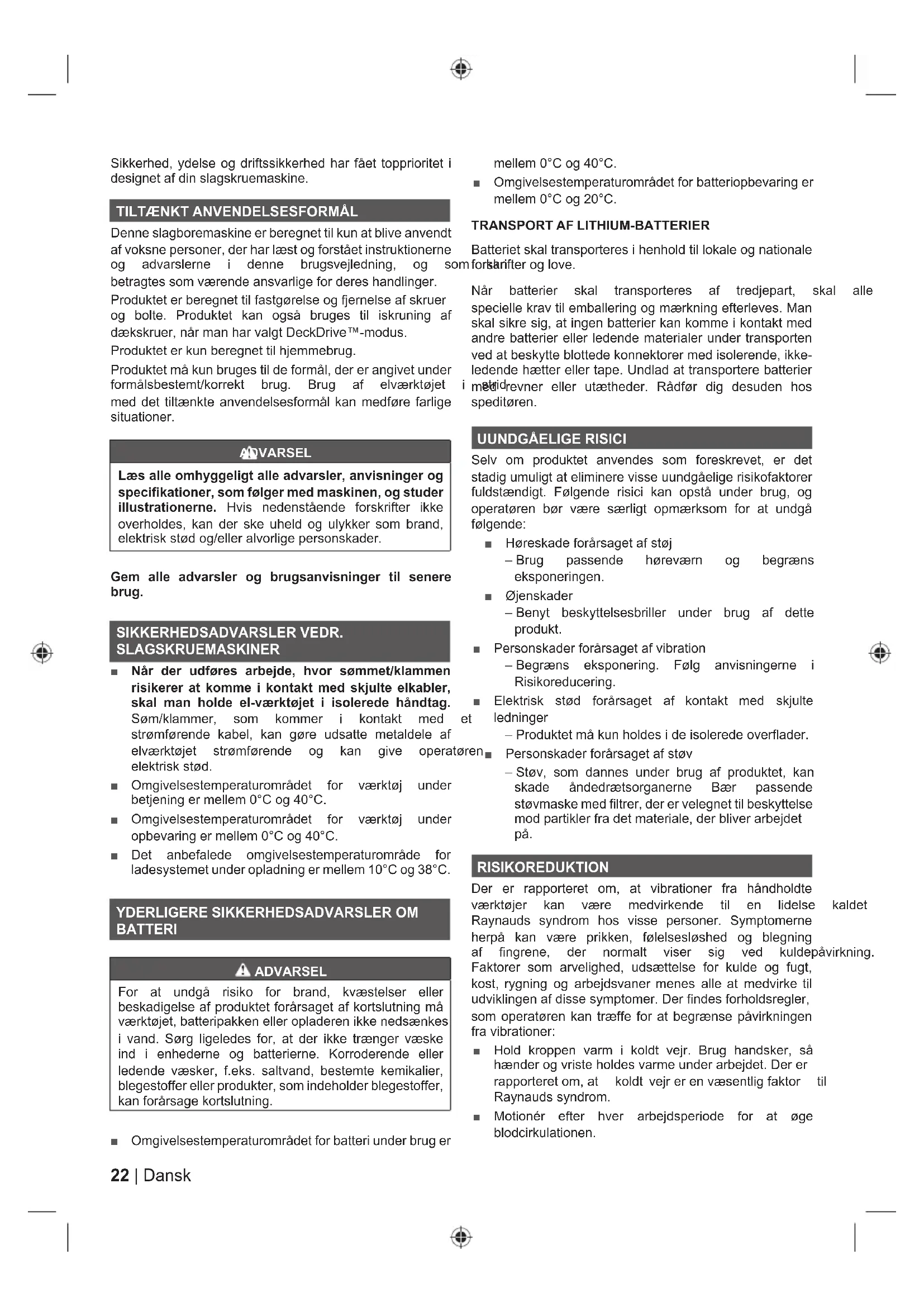 Denne slagboremaskine er beregnet til kun at blive anvendt af voksne personer, der har læst og forstået instruktionerne RJ DGYDUVOHUQH L GHQQH EUXJVYHMOHGQLQJ RJ VRP NDQ betragtes som værende ansvarlige for deres handlinger. 3URGXNWHWHUEHUHJQHWWLOIDVWJ¡UHOVHRJIMHUQHOVHDIVNUXHU og bolte. Produktet kan også bruges til iskruning af dækskruer, når man har valgt DeckDrive™-modus. 3URGXNWHWHUNXQEHUHJQHWWLOKMHPPHEUXJ Produktet må kun bruges til de formål, der er angivet under IRUPnOVEHVWHPWNRUUHNW EUXJ %UXJ DI HOYUNW¡MHW L VWULG med det tiltænkte anvendelsesformål kan medføre farlige situationer. ADVARSEL Læs alle omhyggeligt alle advarsler, anvisninger og specifikationer, som følger med maskinen, og studer illustrationerne. Hvis nedenstående forskrifter ikke overholdes, kan der ske uheld og ulykker som brand, HOHNWULVNVW¡GRJHOOHUDOYRUOLJHSHUVRQVNDGHU Gem alle advarsler og brugsanvisninger til senere brug. SIKKERHEDSADVARSLER VEDR. SLAGSKRUEMASKINER Ŷ Når der udføres arbejde, hvor sømmet/klammen risikerer at komme i kontakt med skjulte elkabler, skal man holde el-værktøjet i isolerede håndtag. 6¡PNODPPHU VRP NRPPHU L NRQWDNW PHG HW strømførende kabel, kan gøre udsatte metaldele af HOYUNW¡MHW VWU¡PI¡UHQGH RJ NDQ JLYH RSHUDW¡UHQ elektrisk stød. Ŷ 2PJLYHOVHVWHPSHUDWXURPUnGHW IRU YUNW¡M XQGHU EHWMHQLQJHUPHOOHP&RJ& Ŷ 2PJLYHOVHVWHPSHUDWXURPUnGHW IRU YUNW¡M XQGHU opbevaring er mellem 0°C og 40°C. Ŷ Det anbefalede omgivelsestemperaturområde for ladesystemet under opladning er mellem 10°C og 38°C.