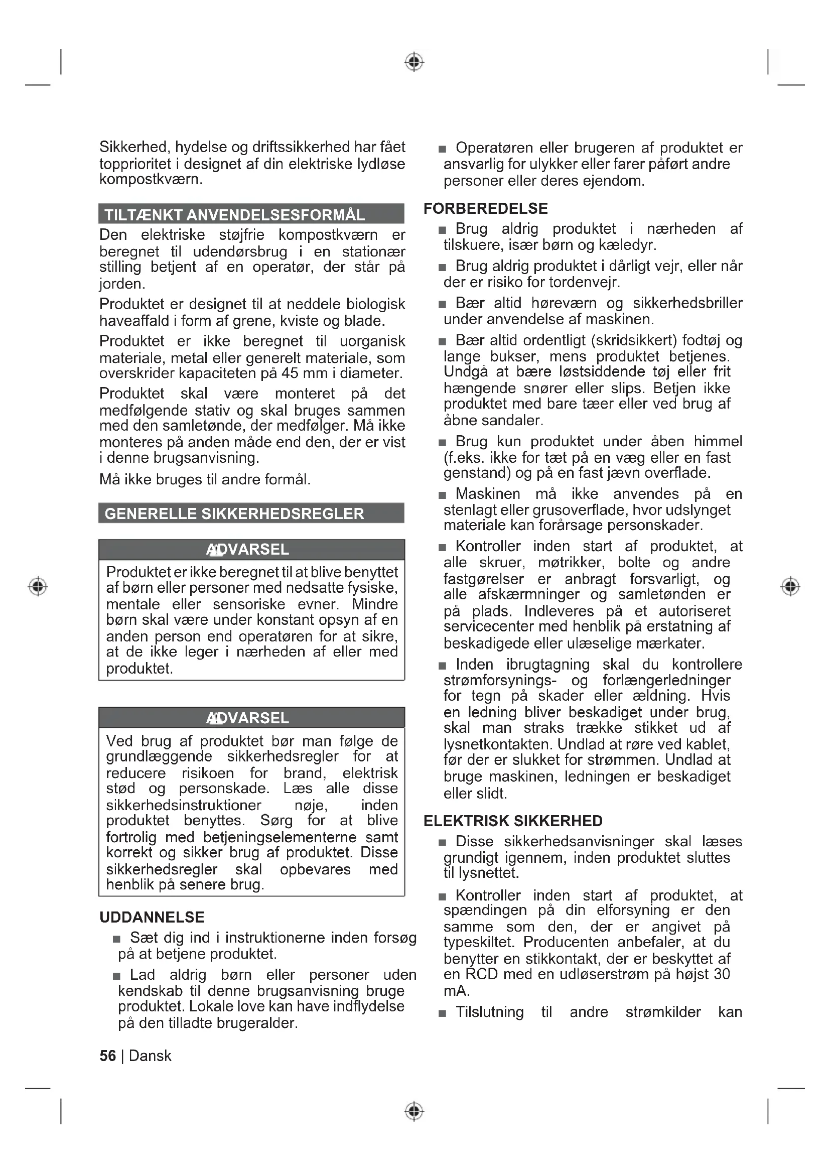 Den elektriske støjfrie kompostkværn er beregnet til udendørsbrug i en stationær stilling betjent af en operatør, der står på jorden. Produktet er designet til at neddele biologisk haveaffald i form af grene, kviste og blade. Produktet er ikke beregnet til uorganisk materiale, metal eller generelt materiale, som overskrider kapaciteten på 45 mm i diameter. Produktet skal være monteret på det medfølgende stativ og skal bruges sammen med den samletønde, der medfølger. Må ikke monteres på anden måde end den, der er vist i denne brugsanvisning. Må ikke bruges til andre formål. GENERELLE SIKKERHEDSREGLER ADVARSEL Produktet er ikke beregnet til at blive benyttet af børn eller personer med nedsatte fysiske, mentale eller sensoriske evner. Mindre børn skal være under konstant opsyn af en anden person end operatøren for at sikre, at de ikke leger i nærheden af eller med produktet. ADVARSEL Ved brug af produktet bør man følge de grundlæggende sikkerhedsregler for at reducere risikoen for brand, elektrisk stød og personskade. Læs alle disse sikkerhedsinstruktioner nøje, inden produktet benyttes. Sørg for at blive fortrolig med betjeningselementerne samt korrekt og sikker brug af produktet. Disse sikkerhedsregler skal opbevares med henblik på senere brug. UDDANNELSE ■ Sæt dig ind i instruktionerne inden forsøg på at betjene produktet. ■ Lad aldrig børn eller personer uden kendskab til denne brugsanvisning bruge produktet. Lokale love kan have indflydelse på den tilladte brugeralder. ■ Operatøren eller brugeren af produktet er ansvarlig for ulykker eller farer påført andre personer eller deres ejendom. FORBEREDELSE ■ Brug aldrig produktet i nærheden af tilskuere, især børn og kæledyr. ■ Brug aldrig produktet i dårligt vejr, eller når der er risiko for tordenvejr. ■ Bær altid høreværn og sikkerhedsbriller under anvendelse af maskinen. ■ Bær altid ordentligt (skridsikkert) fodtøj og lange bukser, mens produktet betjenes. Undgå at bære løstsiddende tøj eller frit hængende snører eller slips. Betjen ikke produktet med bare tæer eller ved brug af åbne sandaler. ■ Brug kun produktet under åben himmel (f.eks. ikke for tæt på en væg eller en fast genstand) og på en fast jævn overflade. ■ Maskinen må ikke anvendes på en stenlagt eller grusoverflade, hvor udslynget materiale kan forårsage personskader. ■ Kontroller inden start af produktet, at alle skruer, møtrikker, bolte og andre fastgørelser er anbragt forsvarligt, og alle afskærmninger og samletønden er på plads. Indleveres på et autoriseret servicecenter med henblik på erstatning af beskadigede eller ulæselige mærkater. ■ Inden ibrugtagning skal du kontrollere strømforsynings- og forlængerledninger for tegn på skader eller ældning. Hvis en ledning bliver beskadiget under brug, skal man straks trække stikket ud af lysnetkontakten. Undlad at røre ved kablet, før der er slukket for strømmen. Undlad at bruge maskinen, ledningen er beskadiget eller slidt. ELEKTRISK SIKKERHED ■ Disse sikkerhedsanvisninger skal læses grundigt igennem, inden produktet sluttes til lysnettet. ■ Kontroller inden start af produktet, at spændingen på din elforsyning er den samme som den, der er angivet på typeskiltet. Producenten anbefaler, at du benytter en stikkontakt, der er beskyttet af en RCD med en udløserstrøm på højst 30 mA. ■ Tilslutning til andre strømkilder kan57 Dansk |