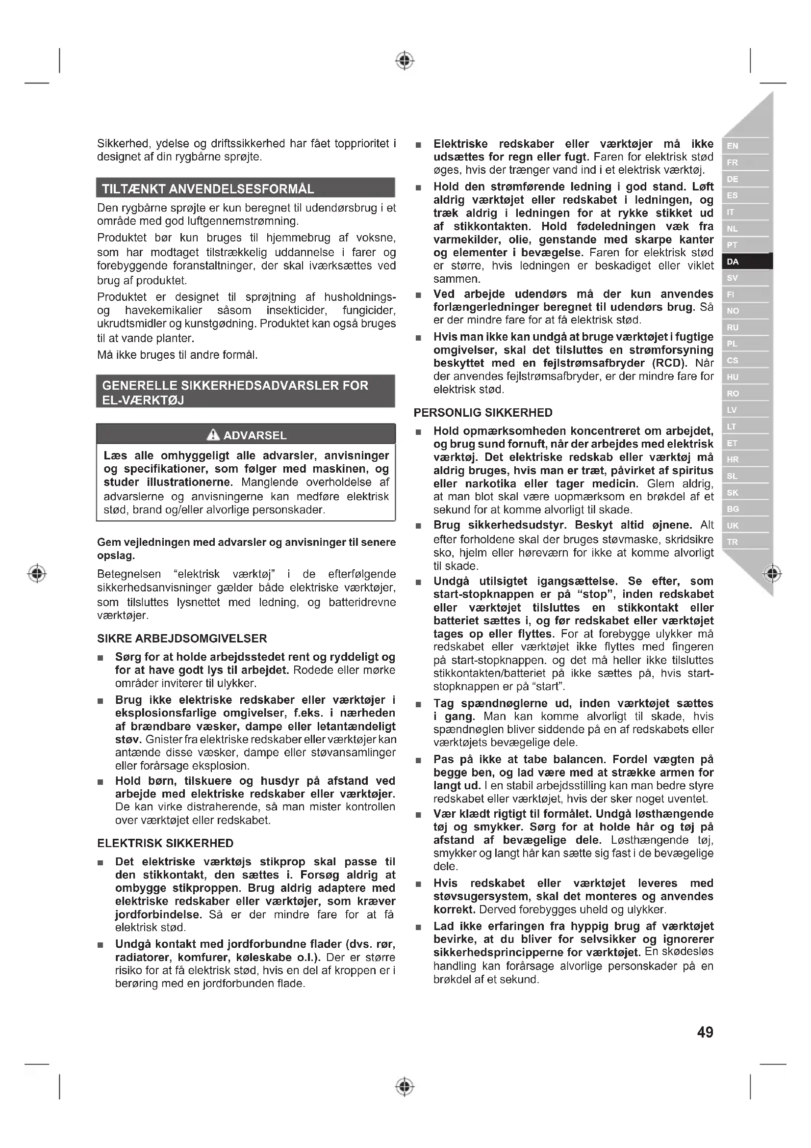 SPRØJTE ■ Læs brugsanvisningen omhyggeligt. Sørg for at blive fortrolig med betjeningselementerne samt den korrekte brug af produktet. ■ Kontroller altid, om der er lækager og reparer dem, før du anvender produktet. ■ Efterse altid produktet grundigt både indvendigt og udvendigt, og undersøg komponenterne inden brug. Vær opmærksom på revnede eller tærede slanger, utætheder, tilstoppede dyser eller manglende eller beskadigede dele. Hvis der konstateres skader, skal produktet repareres inden brug. Mange ulykker skyldes dårligt vedligeholdte produkter. ■ Brug aldrig produktet med defekte skærme, eller skjolde brug ej heller produktet uden påmonteret sikkerhedsudstyr. Brug aldrig et ufuldstændigt eller ændret produkt. Brug af et defekt, ufuldstændigt eller modificeret produkt kan være farligt. ■ Følg kemikalieproducentens instruktioner med hensyn til beskyttelsesudstyr. ■ Brug følgende udstyr til personlig beskyttelse, når du betjener produktet for at reducere risikoen for skader: ● Ansigtsmaske ● Handsker ● Sikkerhedssko ● Udstyr til beskyttelse af overkroppen ■ Bær korrekt beskyttelsesbeklædning og udstyr ved: ● påfyldning af sprøjtebeholderen med sprøjtemidler ● sprøjtning ● foretagelse af justeringer ● tømning og rengøring af sprøjtetanken ● udskiftning af sprøjtemidler ● servicering af produktet 50 | Dansk■ For at reducere risikoen for brand eller eksplosion skal du ikke sprøjte med brændbare væsker, såsom benzin. ■ Undladt at sprøjte i nærheden af gløder, ild eller andre antændelseskilder. ■ Produktet må kun bruges med plantebeskyttelsesmidler, der er godkendt af lokale/nationale tilsynsmyndigheder for plantebeskyttelsesmidler til brug med rygbåren sprøjte. Følg altid kemiproducentens anvisninger, som er trykt på produktetiketten, vedr. brug, rengøring og opbevaring. Opbevar kemikaler utilgængeligt for børn. ■ Udsprøjt ikke materiale med ukendte faremomenter. ■ Sluk med det samme, og fjern batteripakken i tilfælde af en ulykke eller et nedbrud. Betjen ikke produktet igen, før det er blevet kontrolleret fuldstændigt af et godkendt servicecenter. ■ Undlad at sprøjte i retning af personer eller dyr. Undgå at sprøjte, når det blæser. Sprøjtemidlet kan ved et uheld blive blæst over på planter eller genstande, der ikke skal sprøjtes. Der skal altid sprøjtes med vindretningen. ■ For at reducere risikoen for ulykker og skader på sprøjten, skal du aldrig betjene sprøjten, hvis den er fyldt med følgende: ● Brandfarlige væsker ● Viskose eller klæbende væsker ● Kaustiske eller ætsende kemikalier ● Væsker, der er varmere end 50° C ■ Undlat at bruge brændbare opløsningsmidler eller skurende rengøringsmidler til rengøring af produktet. ■ Hvis der ikke kommer noget spray ud af dysen, eller spraymængden er reduceret, kan slange- og rørsystemet være blokeret. Skyl og rengør alle dele af slangen og rørsystemet (sprøjtepistol, filter i beholderen, sprøjterør, slange) med rent vand. ■ Efter længere opbevaring eller efter vinteren, sprøjt produktet igennem med rent vand. Kontroller, om der er lækager eller revner. ■ Blæs aldrig med munden gennem dyserne eller andre komponenter. ■ Undgå kontakt med plantekontrolskemikalier, og skift omgående tøj, hvis det er blevet kontamineret med plantekontrolskemikalier. ADVARSEL Hold sprøjtemiddel bort fra øjnene. Hvis sprøjtemiddel kommer i kontakt med øjnene, skal man omgående skylle med rent vand. Hvis irritationen ikke forsvinder, kontaktes læge omgående. EKSTRA SIKKERHEDSADVARSLER ■ Produktet må aldrig benyttes af børn, personer med begrænsede fysiske, sensoriske eller mentale evner eller manglende erfaring og viden, eller af folk, der ikke er fortrolige med denne brugsanvisning. ■ Hold området fri for tilskuere, børn og dyr, så længe sprøjtningen pågår. ■ Vær opmærksom på evt. faremomenter i forbindelse med sprøjtemidler. Før man bruger pesticider eller andre sprøjtemidler med produktet, skal man omhyggeligt læse etiketten på den originale beholder og følge vejledningen. ■ Sørg for, at sprøjtelansen er sluttet korrekt til sprøjtelanse-håndtaget, før du bruger produktet. Om nødvendigt kan man benytte en tang til at fastgøre sprøjtelansen til sprøjtelanse-håndtaget. ■ Husk at montere og fastspænde sprøjtemiddeltankens låg, når der er hældt væske i sprøjtemiddeltanken. ■ Brug kun vandbaserede husholdnings- og havekemikalier. ■ Undlat at bruge kommercielle kemikalier eller kemikalier til kommercielle eller industrielle formål. ■ Undlad at bruge ikke kaustiske (alkaliske) selvopvarmende eller ætsende (syre) væsker med produktet. Disse kan korrodere metaldele eller svække tank og slange. ■ Undgå at efterlade rester eller sprøjtemiddel i sprøjtemiddeltanken efter brug af produktet. Rengør efter brug. ■ Undlad at hælde varme eller kogende væsker i sprøjtetanken. Disse kan svække eller beskadige slangen eller sprøjtemiddeltanken. ■ Undgå at overfylde tanken. ■ Sprøjteområdet skal være godt ventileret. ■ Undlat at ryge, spise eller drikke, mens du bruger produktet. ■ Sprøjtematerialer må ikke udledes direkte på huden. ■ Undgå hudkontkat med sprøjtemidlerne. I tilfælde af kontakt vaskes straks med sæbe og rigeligt vand. ■ Ret dysen direkte mod de planter eller genstande, der skal sprøjtes. ■ Kontrollér, at sprøjtemidlet rettes mod et område, som tåler sprøjtemidlet. ■ Fare for elektrisk stød. Undlad at sprøjte mod elkontakter. ■ Efter hver brug skal man omhyggeligt vaske hænderne samt ethvert hudområde, der har været udsat for sprøjtemidlet. ■ Fjern batteriet fra produktet, før udtømning, rengøring og opbevaring for at undgå utilsigtet start af produktet. En indikation af, at maskinen kan være underlagt nationale krav om regelmæssige inspektioner udført af udpegede myndigheder, som bestemt i Europa