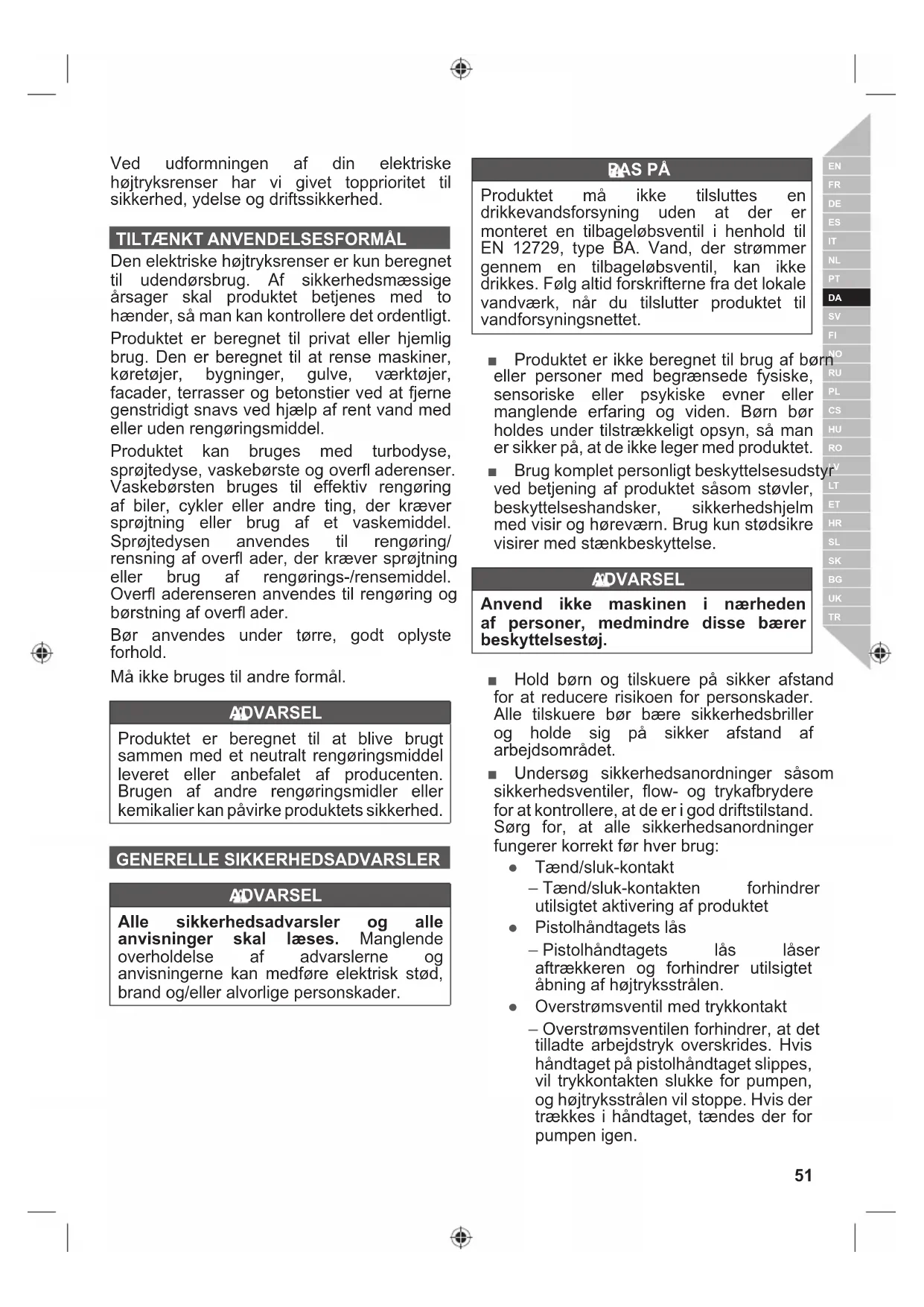 Den elektriske højtryksrenser er kun beregnet til udendørsbrug. Af sikkerhedsmæssige årsager skal produktet betjenes med to hænder, så man kan kontrollere det ordentligt. Produktet er beregnet til privat eller hjemlig brug. Den er beregnet til at rense maskiner, køretøjer, bygninger, gulve, værktøjer, facader, terrasser og betonstier ved at fjerne genstridigt snavs ved hjælp af rent vand med eller uden rengøringsmiddel. Produktet kan bruges med turbodyse, sprøjtedyse, vaskebørste og overfl aderenser. Vaskebørsten bruges til effektiv rengøring af biler, cykler eller andre ting, der kræver sprøjtning eller brug af et vaskemiddel. Sprøjtedysen anvendes til rengøring/ rensning af overfl ader, der kræver sprøjtning eller brug af rengørings-/rensemiddel. Overfl aderenseren anvendes til rengøring og børstning af overfl ader. Bør anvendes under tørre, godt oplyste forhold. Må ikke bruges til andre formål. ADVARSEL Produktet er beregnet til at blive brugt sammen med et neutralt rengøringsmiddel leveret eller anbefalet af producenten. Brugen af andre rengøringsmidler eller kemikalier kan påvirke produktets sikkerhed. GENERELLE SIKKERHEDSADVARSLER ADVARSEL Alle sikkerhedsadvarsler og alle anvisninger skal læses. Manglende overholdelse af advarslerne og anvisningerne kan medføre elektrisk stød, brand og/eller alvorlige personskader. PAS PÅ Produktet må ikke tilsluttes en drikkevandsforsyning uden at der er monteret en tilbageløbsventil i henhold til EN 12729, type BA. Vand, der strømmer gennem en tilbageløbsventil, kan ikke drikkes. Følg altid forskrifterne fra det lokale vandværk, når du tilslutter produktet til vandforsyningsnettet. ■ Produktet er ikke beregnet til brug af børn eller personer med begrænsede fysiske, sensoriske eller psykiske evner eller manglende erfaring og viden. Børn bør holdes under tilstrækkeligt opsyn, så man er sikker på, at de ikke leger med produktet. ■ Brug komplet personligt beskyttelsesudstyr ved betjening af produktet såsom støvler, beskyttelseshandsker, sikkerhedshjelm med visir og høreværn. Brug kun stødsikre visirer med stænkbeskyttelse. ADVARSEL Anvend ikke maskinen i nærheden af personer, medmindre disse bærer beskyttelsestøj. ■ Hold børn og tilskuere på sikker afstand for at reducere risikoen for personskader. Alle tilskuere bør bære sikkerhedsbriller og holde sig på sikker afstand af arbejdsområdet. ■ Undersøg sikkerhedsanordninger såsom sikkerhedsventiler, flow- og trykafbrydere for at kontrollere, at de er i god driftstilstand. Sørg for, at alle sikkerhedsanordninger fungerer korrekt før hver brug: ● Tænd/sluk-kontakt – Tænd/sluk-kontakten forhindrer utilsigtet aktivering af produktet ● Pistolhåndtagets lås – Pistolhåndtagets lås låser aftrækkeren og forhindrer utilsigtet åbning af højtryksstrålen. ● Overstrømsventil med trykkontakt – Overstrømsventilen forhindrer, at det tilladte arbejdstryk overskrides. Hvis håndtaget på pistolhåndtaget slippes, vil trykkontakten slukke for pumpen, og højtryksstrålen vil stoppe. Hvis der trækkes i håndtaget, tændes der for pumpen igen.52 | Dansk