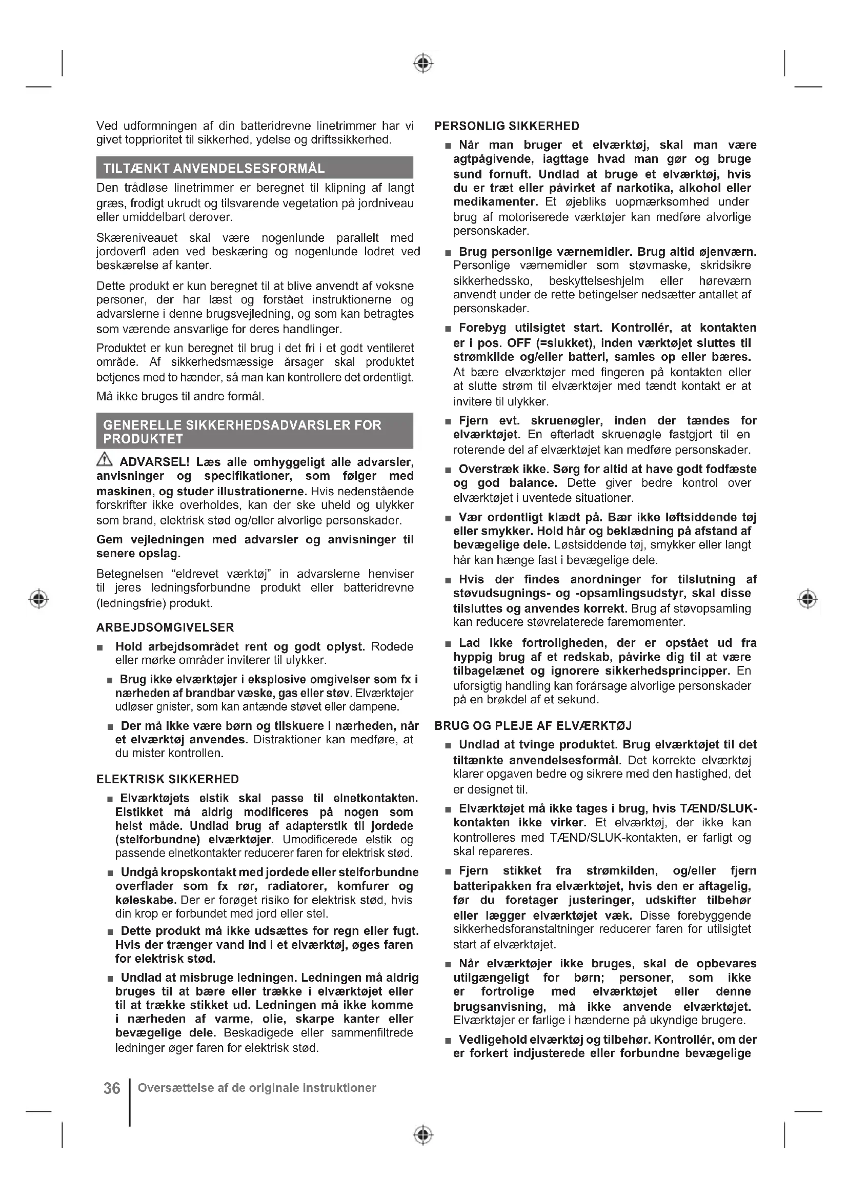 ■ Brug ikke maskinen under dårlige vejrforhold, især ikke når der er fare for lynnedslag. Dette mindsker risikoen for at blive ramt af lynet. ■ Inspicér grundigt området, hvor maskinen skal bruges, for vilde dyr. Dyr kan skades af maskinen under drift. ■ Undersøg grundigt området, hvor maskinen skal bruges, og fjern alle sten, pinde, ledninger, ben og andre fremmedelementer. Udkastede genstande kan forårsage personskade. ■ Inden brug af maskinen skal du altid inspicere produktet visuelt for at se, at skæret og skærets fastgørelseselementer ikke er beskadiget. Beskadigede dele øger risikoen for personskader. ■ Hold afskærmningerne på plads. Afskærmninger skal være i funktionsdygtig stand og korrekt monteret. En afskærmning, der er løs, beskadiget eller ikke fungerer korrekt, kan medføre personskade. ■ Hold alle køleluftindgange fri for affaldsstykker. Blokerede luftindtag og snavs kan medføre overophedning eller risiko for brand. ■ Brug øjenbeskyttelse og høreværn. Passende beskyttelsesudstyr vil reducere personskade. ■ Bær altid skridsikkert beskyttelsesfodtøj, mens maskinen betjenes. Undlad at bruge maskinen barfodet eller med åbne sandaler. Dette reducerer risikoen for, at fødderne kommer til skade ved kontakt med det bevægelige skær. ■ Bær altid tøj såsom bukser, der dækker operatørens ben under betjening af maskinen. Kontakt med det bevægelige skær eller line kan forårsage personskade. ■ Hold tilskuere på afstand under betjening af produktet. Udkastede grene og ting kan resultere i alvorlig personskade. ■ Betjen ikke maskinen over livhøjde. Dette hjælper med at forhindre utilsigtet kontakt med skæret og muliggør bedre kontrol af maskinen i uventede situationer. ■ Vær forsigtig, når du betjener maskinen i vådt græs. Gå, løb aldrig. Dette reducerer risikoen for at glide og falde, hvilket kan medføre personskade. ■ Betjen ikke maskinen på meget stejle skråninger. Dette reducerer risikoen for at miste kontrollen, glide og falde, hvilket kan resultere i personskade. ■ Når du arbejder på skråninger, skal du altid sikre dig et godt fodfæste, altid arbejde på tværs af skråninger, aldrig op eller ned og udvise ekstrem forsigtighed, når du skifter retning. Dette reducerer risikoen for at miste kontrollen, glide og falde, hvilket kan resultere i personskade. ■ Hold alle netledninger og kabler væk fra skæreområdet. Netledninger eller kabler kan være skjult i hække eller buske og kan ved et uheld blive overskåret eller beskadiget af linen eller skæret. ■ Hold alle kropsdele på afstand af det bevægelige trimmerskær eller line. Fjern ikke materialet fra maskinen, før den er blevet afbrudt fra strømkilden. Det bevægelige trimmerskær eller line kan resultere i alvorlig personskade. ■ Bær maskinen, mens den er slukket og væk fra din krop. Korrekt håndtering af maskinen vil reducere sandsynligheden for utilsigtet kontakt med en bevægelig trimmerklinge eller -line.38 Oversættelse af de originale instruktioner ■ Brug kun reservedelsskærehoveder og trimmerskær, der er specificeret af producenten. Udskift ikke trimmerskærene eller linjerne med metalledninger eller -klinger. Forkerte reservedele kan forårsage tab af kontrol, brud og personskade. EKSTRA SIKKERHEDSADVARSLER ■ Inden ibrugtagning og efter enhver ydre påvirkning skal man kontrollere, at der ikke findes beskadigede dele. En defekt kontakt eller en del, som er blevet beskadiget eller slidt, skal repareres ordentligt eller udskiftes på et autoriseret serviceværksted. ■ Den lille klinge, der sidder fast på afskærmningen, er beregnet til at afskære den fornyligt forlængede line til den korrekte længde af hensyn til sikkerheden og bedst mulige resultat. Kniven er meget skarp. Berør ikke kniven, især ikke når du rengører produktet. ■ Brug kun udskiftningstråd fra producenten. Der må ikke bruges andet skærende udstyr. ■ Kontrollér, at klippeudstyret er monteret korrekt og ordentligt fastgjort. ■ Produktet må aldrig benyttes, før alle skærme, deflektorer og håndtag er fastgjort ordentligt og sikkert. ■ Sørg for, at linjeafskæringsklingen på klingeafskærmningen er korrekt placeret og fastgjort før hver brug. ■ Hold hovedtilbehøret under livniveau. ■ Sluk med det samme, og fjern batteripakken i tilfælde af en ulykke eller et nedbrud. Betjen ikke produktet igen, før det er blevet kontrolleret fuldstændigt af et godkendt servicecenter. ■ Sluk altid for produktet, fjern batteripakken og lad begge dele køle af for at reducere risikoen for personskader ved kontakt med bevægelige dele. Kontrollér, at alle bevægelige dele er standset fuldstændigt: ● før betjening ● før rydning af en blokering ● inden kontrol, rengøring eller arbejde på produktet ● før der skiftes tilbehør ● efter at have ramt et fremmedelement ● når produktet efterlades uden opsyn ● under vedligeholdelse ● hvis produktet begynder at vibrere unormalt ■ Sørg for, at alle afskærmninger og håndtag er korrekt monteret og i god stand. ■ Hold produktet i de hertil indrettede håndtag, og begræns arbejdstiden og eksponeringen. ■ Pas på bortslyngede objekter fra klippeudstyr. Fjern affald som små sten, ral og andre fremmedlegemer fra arbejdsområdet, inden arbejdets start. Ledninger og snore kan blive viklet ind i klippeudstyret. ■ Sørg altid for, at ventilationsåbningerne er fri for affald. ■ Længere tids brug af et værktøj kan forårsage - eller forværre - personskader. Når du bruger produktet i længere perioder, skal du sørge for at tage regelmæssige pauser. ■ Brug kun produktet ved temperaturer mellem 0° C og 40° C. ■ Opbevar produktet et sted, hvor omgivelsestemperaturen er mellem 0° C og 40° C.