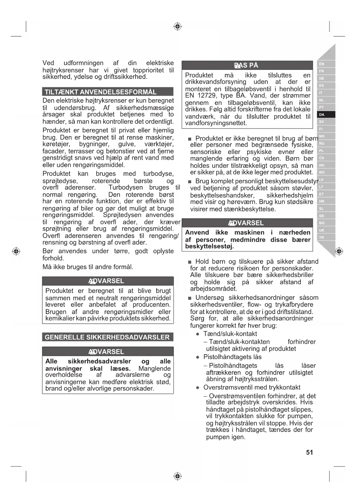 Hojtryksstraler kan vare farlige ved misbrug. Vandstralen ma ikke rettes mod personer, dyr, strømførende elektrisk udstyr eller delve produitet.