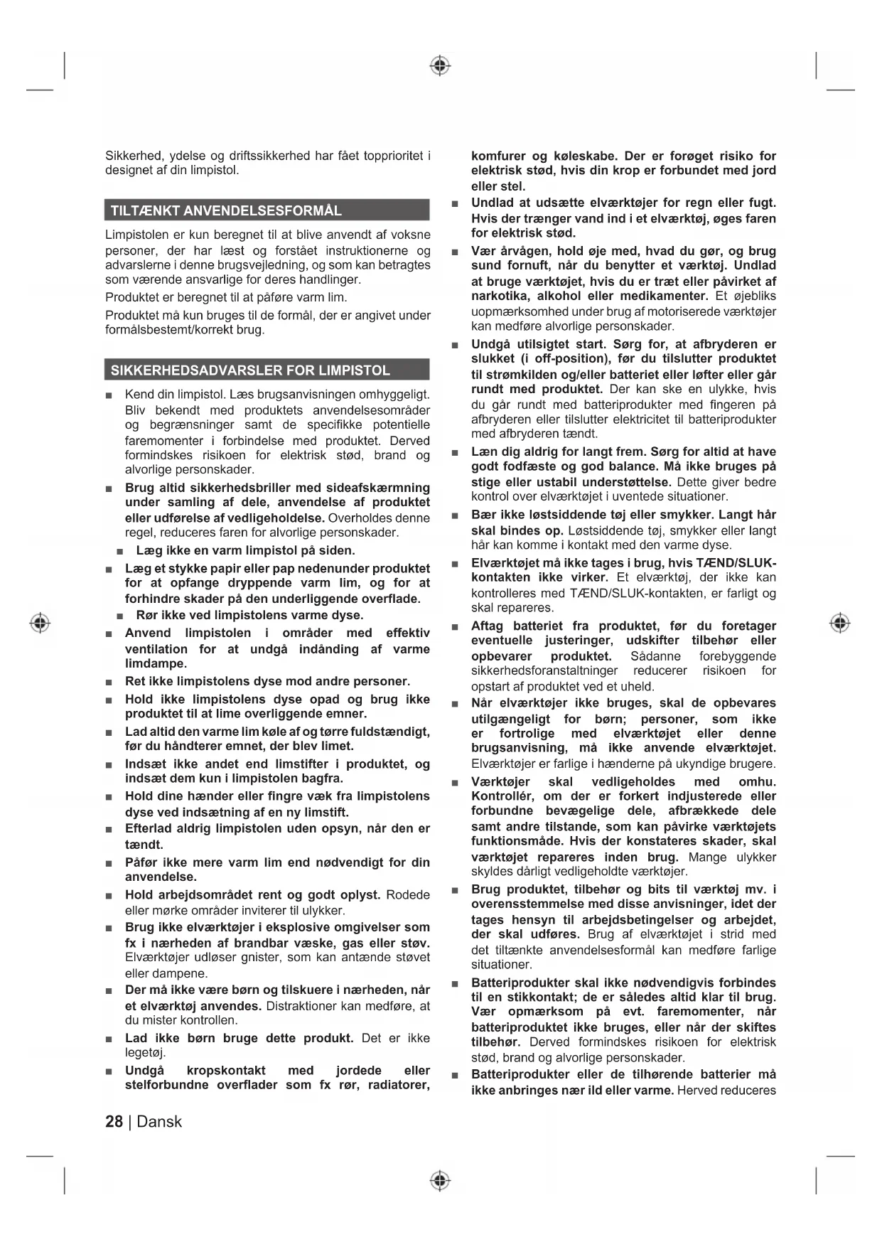 ■ Kend din limpistol. Læs brugsanvisningen omhyggeligt. Bliv bekendt med produktets anvendelsesområder og begrænsninger samt de specifikke potentielle faremomenter i forbindelse med produktet. Derved formindskes risikoen for elektrisk stød, brand og alvorlige personskader. ■ Brug altid sikkerhedsbriller med sideafskærmning under samling af dele, anvendelse af produktet eller udførelse af vedligeholdelse. Overholdes denne regel, reduceres faren for alvorlige personskader. ■ Læg ikke en varm limpistol på siden. ■ Læg et stykke papir eller pap nedenunder produktet for at opfange dryppende varm lim, og for at forhindre skader på den underliggende overflade. ■ Rør ikke ved limpistolens varme dyse. ■ Anvend limpistolen i områder med effektiv ventilation for at undgå indånding af varme limdampe. ■ Ret ikke limpistolens dyse mod andre personer. ■ Hold ikke limpistolens dyse opad og brug ikke produktet til at lime overliggende emner. ■ Lad altid den varme lim køle af og tørre fuldstændigt, før du håndterer emnet, der blev limet. ■ Indsæt ikke andet end limstifter i produktet, og indsæt dem kun i limpistolen bagfra. ■ Hold dine hænder eller fingre væk fra limpistolens dyse ved indsætning af en ny limstift. ■ Efterlad aldrig limpistolen uden opsyn, når den er tændt. ■ Påfør ikke mere varm lim end nødvendigt for din anvendelse. ■ Hold arbejdsområdet rent og godt oplyst. Rodede eller mørke områder inviterer til ulykker. ■ Brug ikke elværktøjer i eksplosive omgivelser som fx i nærheden af brandbar væske, gas eller støv. Elværktøjer udløser gnister, som kan antænde støvet eller dampene. ■ Der må ikke være børn og tilskuere i nærheden, når et elværktøj anvendes. Distraktioner kan medføre, at du mister kontrollen. ■ Lad ikke børn bruge dette produkt. Det er ikke legetøj. ■ Undgå kropskontakt med jordede eller stelforbundne overflader som fx rør, radiatorer, komfurer og køleskabe. Der er forøget risiko for elektrisk stød, hvis din krop er forbundet med jord eller stel. ■ Undlad at udsætte elværktøjer for regn eller fugt. Hvis der trænger vand ind i et elværktøj, øges faren for elektrisk stød. ■ Vær årvågen, hold øje med, hvad du gør, og brug sund fornuft, når du benytter et værktøj. Undlad at bruge værktøjet, hvis du er træt eller påvirket af narkotika, alkohol eller medikamenter. Et øjebliks uopmærksomhed under brug af motoriserede værktøjer kan medføre alvorlige personskader. ■ Undgå utilsigtet start. Sørg for, at afbryderen er slukket (i off-position), før du tilslutter produktet til strømkilden og/eller batteriet eller løfter eller går rundt med produktet. Der kan ske en ulykke, hvis du går rundt med batteriprodukter med fingeren på afbryderen eller tilslutter elektricitet til batteriprodukter med afbryderen tændt. ■ Læn dig aldrig for langt frem. Sørg for altid at have godt fodfæste og god balance. Må ikke bruges på stige eller ustabil understøttelse. Dette giver bedre kontrol over elværktøjet i uventede situationer. ■ Bær ikke løstsiddende tøj eller smykker. Langt hår skal bindes op. Løstsiddende tøj, smykker eller langt hår kan komme i kontakt med den varme dyse. ■ Elværktøjet må ikke tages i brug, hvis TÆND/SLUK- kontakten ikke virker. Et elværktøj, der ikke kan kontrolleres med TÆND/SLUK-kontakten, er farligt og skal repareres. ■ Aftag batteriet fra produktet, før du foretager eventuelle justeringer, udskifter tilbehør eller opbevarer produktet. Sådanne forebyggende sikkerhedsforanstaltninger reducerer risikoen for opstart af produktet ved et uheld. ■ Når elværktøjer ikke bruges, skal de opbevares utilgængeligt for børn; personer, som ikke er fortrolige med elværktøjet eller denne brugsanvisning, må ikke anvende elværktøjet. Elværktøjer er farlige i hænderne på ukyndige brugere. ■ Værktøjer skal vedligeholdes med omhu. Kontrollér, om der er forkert indjusterede eller forbundne bevægelige dele, afbrækkede dele samt andre tilstande, som kan påvirke værktøjets funktionsmåde. Hvis der konstateres skader, skal værktøjet repareres inden brug. Mange ulykker skyldes dårligt vedligeholdte værktøjer. ■ Brug produktet, tilbehør og bits til værktøj mv. i overensstemmelse med disse anvisninger, idet der tages hensyn til arbejdsbetingelser og arbejdet, der skal udføres. Brug af elværktøjet i strid med det tiltænkte anvendelsesformål kan medføre farlige situationer. ■ Batteriprodukter skal ikke nødvendigvis forbindes til en stikkontakt; de er således altid klar til brug. Vær opmærksom på evt. faremomenter, når batteriproduktet ikke bruges, eller når der skiftes tilbehør. Derved formindskes risikoen for elektrisk stød, brand og alvorlige personskader. ■ Batteriprodukter eller de tilhørende batterier må ikke anbringes nær ild eller varme. Herved reduceres29 Dansk |