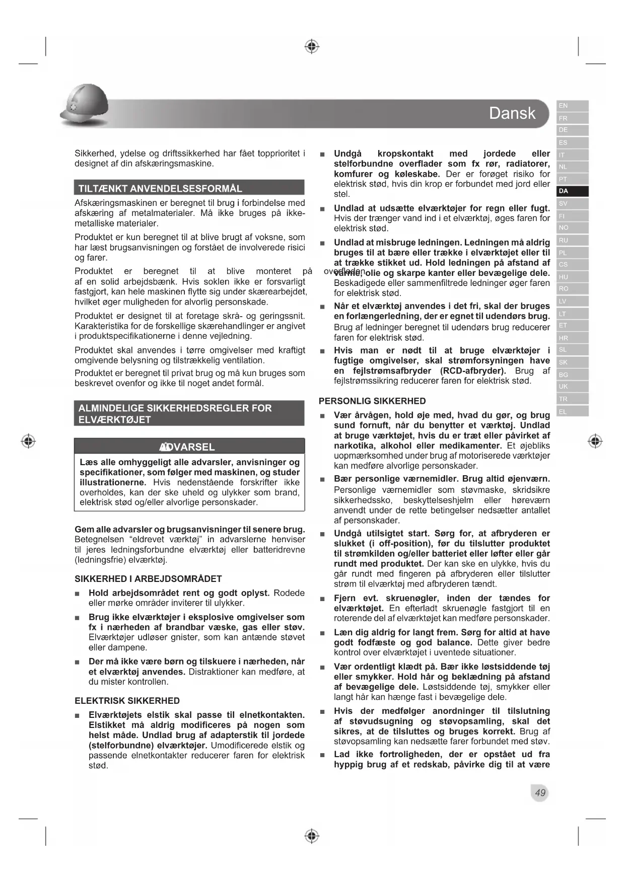 Afskæringsmaskinen er beregnet til brug i forbindelse med afskæring af metalmaterialer. Må ikke bruges på ikke- metalliske materialer. Produktet er kun beregnet til at blive brugt af voksne, som har læst brugsanvisningen og forstået de involverede risici og farer. 3URGXNWHW HU EHUHJQHW WLO DW EOLYH PRQWHUHW Sn RYHUÀDGHQ af en solid arbejdsbænk. Hvis soklen ikke er forsvarligt IDVWJMRUWNDQKHOHPDVNLQHQÀ\WWHVLJXQGHUVNUHDUEHMGHW hvilket øger muligheden for alvorlig personskade. Produktet er designet til at foretage skrå- og geringssnit. Karakteristika for de forskellige skærehandlinger er angivet LSURGXNWVSHFL¿NDWLRQHUQHLGHQQHYHMOHGQLQJ Produktet skal anvendes i tørre omgivelser med kraftigt omgivende belysning og tilstrækkelig ventilation. Produktet er beregnet til privat brug og må kun bruges som beskrevet ovenfor og ikke til noget andet formål.
