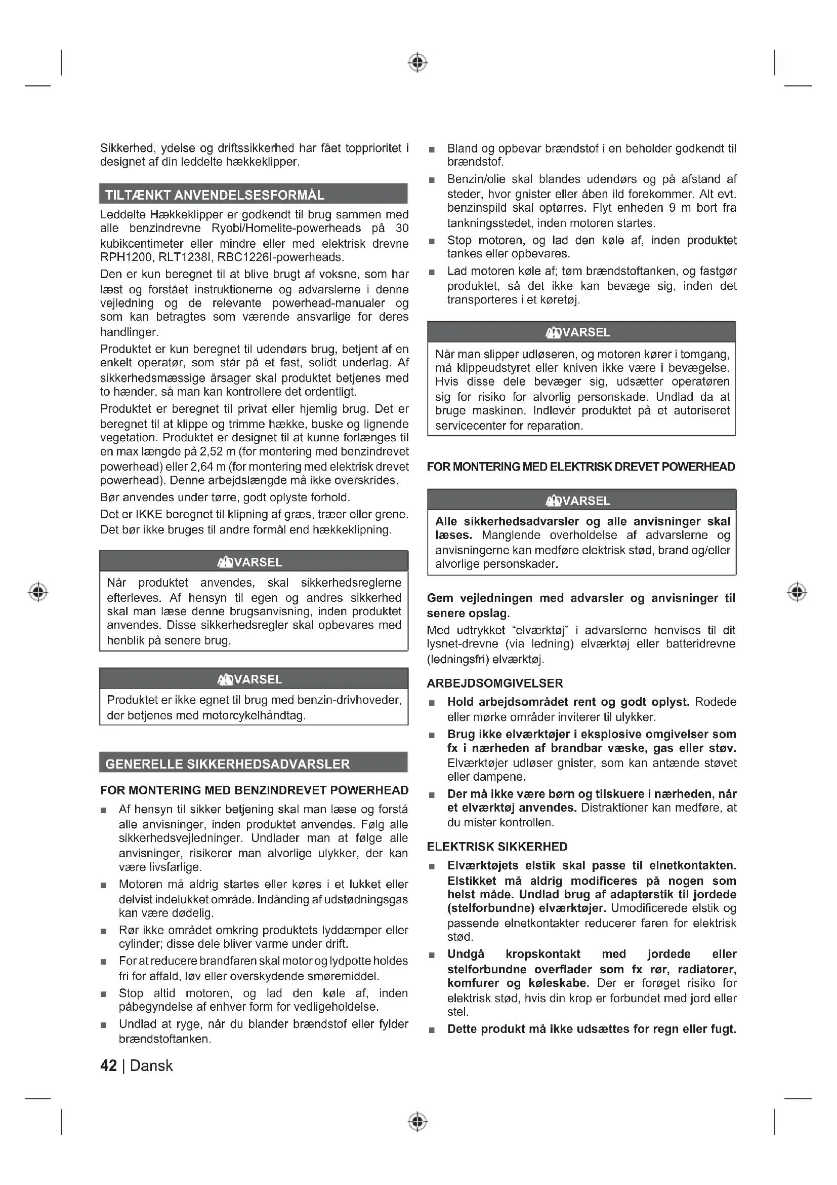 Leddelte Hækkeklipper er godkendt til brug sammen med alle benzindrevne Ryobi/Homelite-powerheads på 30 kubikcentimeter eller mindre eller med elektrisk drevne RPH1200, RLT1238I, RBC1226I-powerheads. Den er kun beregnet til at blive brugt af voksne, som har læst og forstået instruktionerne og advarslerne i denne vejledning og de relevante powerhead-manualer og som kan betragtes som værende ansvarlige for deres handlinger. Produktet er kun beregnet til udendørs brug, betjent af en enkelt operatør, som står på et fast, solidt underlag. Af sikkerhedsmæssige årsager skal produktet betjenes med to hænder, så man kan kontrollere det ordentligt. Produktet er beregnet til privat eller hjemlig brug. Det er beregnet til at klippe og trimme hække, buske og lignende vegetation. Produktet er designet til at kunne forlænges til en max længde på 2,52 m (for montering med benzindrevet powerhead) eller 2,64 m (for montering med elektrisk drevet powerhead). Denne arbejdslængde må ikke overskrides. Bør anvendes under tørre, godt oplyste forhold. Det er IKKE beregnet til klipning af græs, træer eller grene. Det bør ikke bruges til andre formål end hækkeklipning. ADVARSEL Når produktet anvendes, skal sikkerhedsreglerne efterleves. Af hensyn til egen og andres sikkerhed skal man læse denne brugsanvisning, inden produktet anvendes. Disse sikkerhedsregler skal opbevares med henblik på senere brug. ADVARSEL Produktet er ikke egnet til brug med benzin-drivhoveder, der betjenes med motorcykelhåndtag. GENERELLE SIKKERHEDSADVARSLER