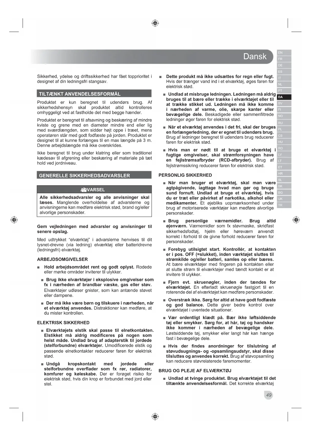 Produktet er kun beregnet til udendørs brug. Af sikkerhedshensyn skal produktet altid kontrolleres omhyggeligt ved at fastholde det med begge hænder. Produktet er beregnet til afsavning og beskæring af mindre kviste og grene med en diameter mindre end eller lig med sværdlængden, som sidder højt oppe i træet, mens operatøren står med godt fodfæste på jorden. Produktet er designet til at kunne forlænges til en max længde på 3 m. Denne arbejdslængde må ikke overskrides. Ikke beregnet til brug under klatring eller som traditionel kædesav til afgrening eller beskæring af materiale på tæt hold ved jordniveau. GENERELLE SIKKERHEDSADVARSLER ADVARSEL Alle sikkerhedsadvarsler og alle anvisninger skal læses. Manglende overholdelse af advarslerne og anvisningerne kan medføre elektrisk stød, brand og/eller alvorlige personskader. Gem vejledningen med advarsler og anvisninger til senere opslag. Med udtrykket “elværktøj” i advarslerne henvises til dit lysnet-drevne (via ledning) elværktøj eller batteridrevne (ledningsfri) elværktøj. ARBEJDSOMGIVELSER ■ Hold arbejdsområdet rent og godt oplyst. Rodede eller mørke områder inviterer til ulykker. ■ Brug ikke elværktøjer i eksplosive omgivelser som fx i nærheden af brandbar væske, gas eller støv. Elværktøjer udløser gnister, som kan antænde støvet eller dampene. ■ Der må ikke være børn og tilskuere i nærheden, når et elværktøj anvendes. Distraktioner kan medføre, at du mister kontrollen. ELEKTRISK SIKKERHED ■ Elværktøjets elstik skal passe til elnetkontakten. Elstikket må aldrig modificeres på nogen som helst måde. Undlad brug af adapterstik til jordede (stelforbundne) elværktøjer. Umodificerede elstik og passende elnetkontakter reducerer faren for elektrisk stød. ■ Undgå kropskontakt med jordede eller stelforbundne overflader som fx rør, radiatorer, komfurer og køleskabe. Der er forøget risiko for elektrisk stød, hvis din krop er forbundet med jord eller stel. ■ Dette produkt må ikke udsættes for regn eller fugt. Hvis der trænger vand ind i et elværktøj, øges faren for elektrisk stød. ■ Undlad at misbruge ledningen. Ledningen må aldrig bruges til at bære eller trække i elværktøjet eller til at trække stikket ud. Ledningen må ikke komme i nærheden af varme, olie, skarpe kanter eller bevægelige dele. Beskadigede eller sammenfiltrede ledninger øger faren for elektrisk stød. ■ Når et elværktøj anvendes i det fri, skal der bruges en forlængerledning, der er egnet til udendørs brug. Brug af ledninger beregnet til udendørs brug reducerer faren for elektrisk stød. ■ Hvis man er nødt til at bruge et elværktøj i fugtige omgivelser, skal strømforsyningen have en fejlstrømsafbryder (RCD-afbryder). Brug af fejlstrømssikring reducerer faren for elektrisk stød. PERSONLIG SIKKERHED ■ Når man bruger et elværktøj, skal man være agtpågivende, iagttage hvad man gør og bruge sund fornuft. Undlad at bruge et elværktøj, hvis du er træt eller påvirket af narkotika, alkohol eller medikamenter. Et øjebliks uopmærksomhed under brug af motoriserede værktøjer kan medføre alvorlige personskader. ■ Brug personlige værnemidler. Brug altid øjenværn. Værnemidler som fx støvmaske, skridfast sikkerhedsfodtøj, hjelm eller høreværn anvendt korrekt i forhold til de givne forhold reducerer faren for personskader. ■ Forebyg utilsigtet start. Kontrollér, at kontakten er i pos. OFF (=slukket), inden værktøjet sluttes til strømkilde og/eller batteri, samles op eller bæres. At bære elværktøjer med fingeren på kontakten eller at slutte strøm til elværktøjer med tændt kontakt er at invitere til ulykker. ■ Fjern evt. skruenøgler, inden der tændes for elværktøjet. En efterladt skruenøgle fastgjort til en roterende del af elværktøjet kan medføre personskader. ■ Overstræk ikke. Sørg for altid at have godt fodfæste og god balance. Dette giver bedre kontrol over elværktøjet i uventede situationer. ■ Vær ordentligt klædt på. Bær ikke løftsiddende tøj eller smykker. Sørg for, at hår, tøj og handsker ikke kommer i nærheden af bevægelige dele. Løstsiddende tøj, smykker eller langt hår kan hænge fast i bevægelige dele. ■ Hvis der findes anordninger for tilslutning af støvudsugnings- og -opsamlingsudstyr, skal disse tilsluttes og anvendes korrekt. Brug af støvopsamling kan reducere støvrelaterede faremomenter. BRUG OG PLEJE AF ELVÆRKTØJ ■ Undlad at tvinge produktet. Brug elværktøjet til det tiltænkte anvendelsesformål. Det korrekte elværktøjDansk