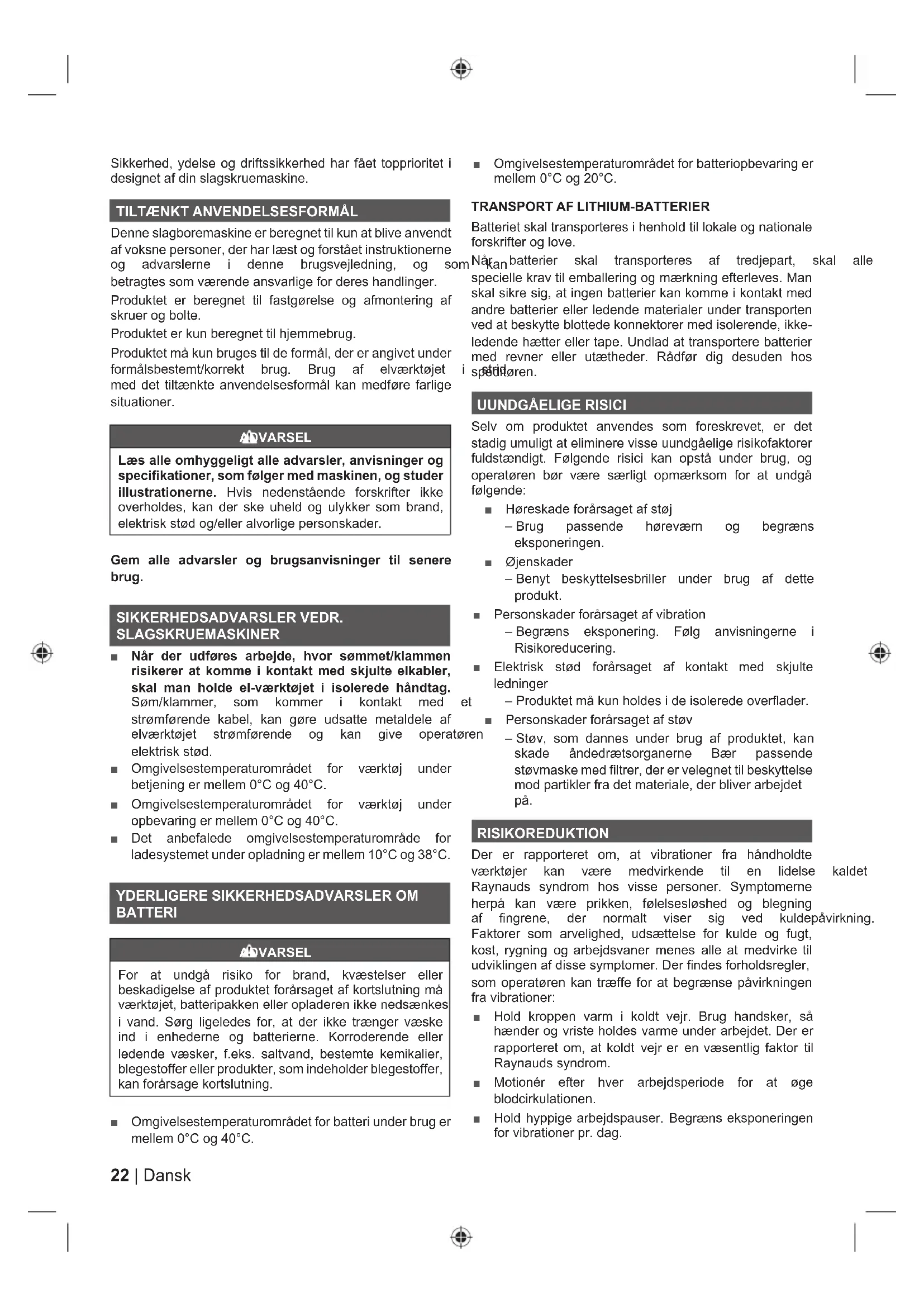 Denne slagboremaskine er beregnet til kun at blive anvendt af voksne personer, der har læst og forstået instruktionerne RJ DGYDUVOHUQH L GHQQH EUXJVYHMOHGQLQJ RJ VRP NDQ betragtes som værende ansvarlige for deres handlinger. Produktet er beregnet til fastgørelse og afmontering af skruer og bolte. 3URGXNWHWHUNXQEHUHJQHWWLOKMHPPHEUXJ Produktet må kun bruges til de formål, der er angivet under IRUPnOVEHVWHPWNRUUHNW EUXJ %UXJ DI HOYUNW¡MHW L VWULG med det tiltænkte anvendelsesformål kan medføre farlige situationer. ADVARSEL Læs alle omhyggeligt alle advarsler, anvisninger og specifikationer, som følger med maskinen, og studer illustrationerne. Hvis nedenstående forskrifter ikke overholdes, kan der ske uheld og ulykker som brand, HOHNWULVNVW¡GRJHOOHUDOYRUOLJHSHUVRQVNDGHU Gem alle advarsler og brugsanvisninger til senere brug. SIKKERHEDSADVARSLER VEDR. SLAGSKRUEMASKINER Ŷ Når der udføres arbejde, hvor sømmet/klammen risikerer at komme i kontakt med skjulte elkabler, skal man holde el-værktøjet i isolerede håndtag. 6¡PNODPPHU VRP NRPPHU L NRQWDNW PHG HW strømførende kabel, kan gøre udsatte metaldele af HOYUNW¡MHW VWU¡PI¡UHQGH RJ NDQ JLYH RSHUDW¡UHQ elektrisk stød. Ŷ 2PJLYHOVHVWHPSHUDWXURPUnGHW IRU YUNW¡M XQGHU EHWMHQLQJHUPHOOHP&RJ& Ŷ 2PJLYHOVHVWHPSHUDWXURPUnGHW IRU YUNW¡M XQGHU opbevaring er mellem 0°C og 40°C. Ŷ Det anbefalede omgivelsestemperaturområde for ladesystemet under opladning er mellem 10°C og 38°C.