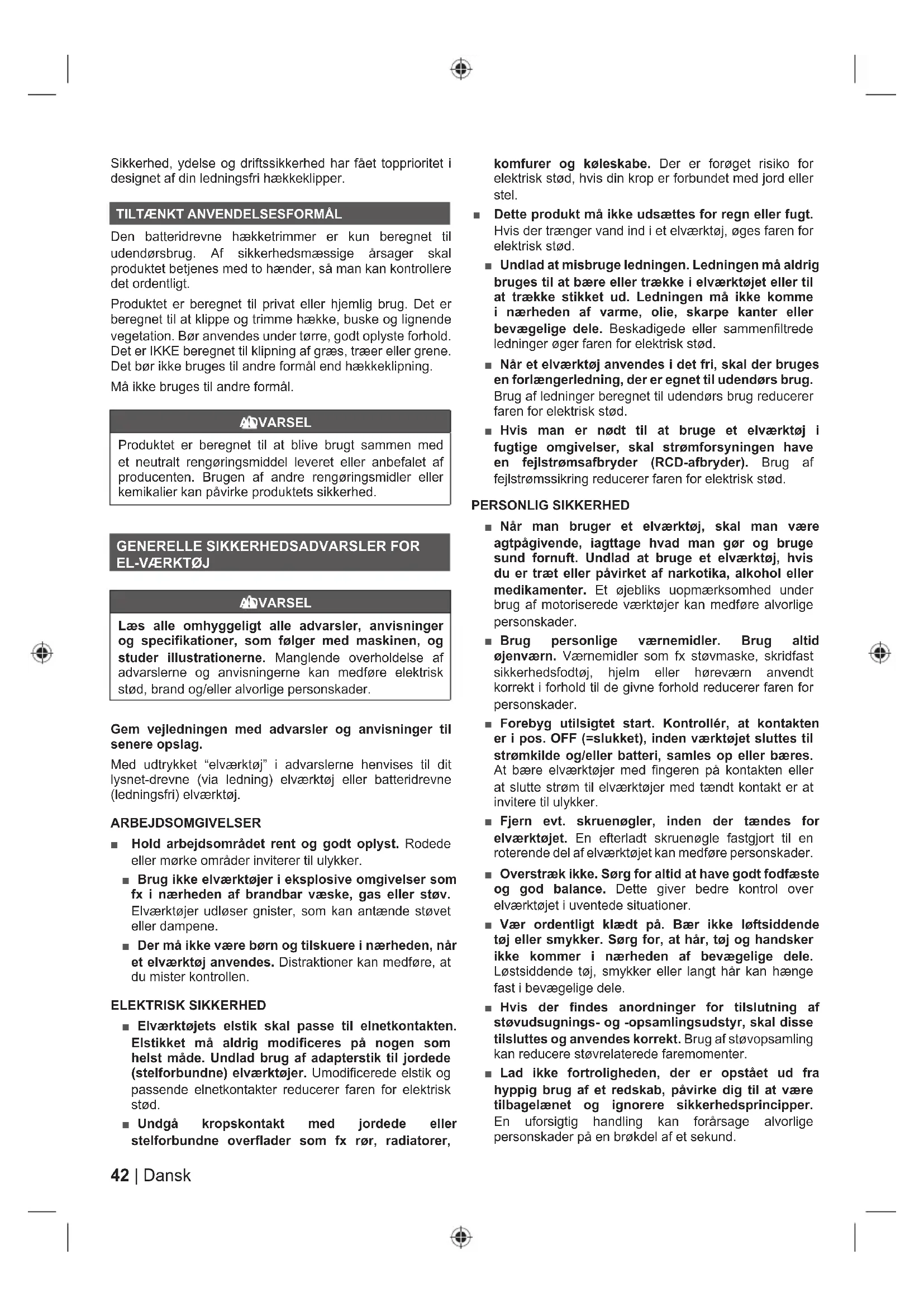 Den batteridrevne hækketrimmer er kun beregnet til udendørsbrug. Af sikkerhedsmæssige årsager skal produktet betjenes med to hænder, så man kan kontrollere det ordentligt. Produktet er beregnet til privat eller hjemlig brug. Det er beregnet til at klippe og trimme hække, buske og lignende vegetation. Bør anvendes under tørre, godt oplyste forhold. Det er IKKE beregnet til klipning af græs, træer eller grene. Det bør ikke bruges til andre formål end hækkeklipning. Må ikke bruges til andre formål. ADVARSEL Produktet er beregnet til at blive brugt sammen med et neutralt rengøringsmiddel leveret eller anbefalet af producenten. Brugen af andre rengøringsmidler eller kemikalier kan påvirke produktets sikkerhed.