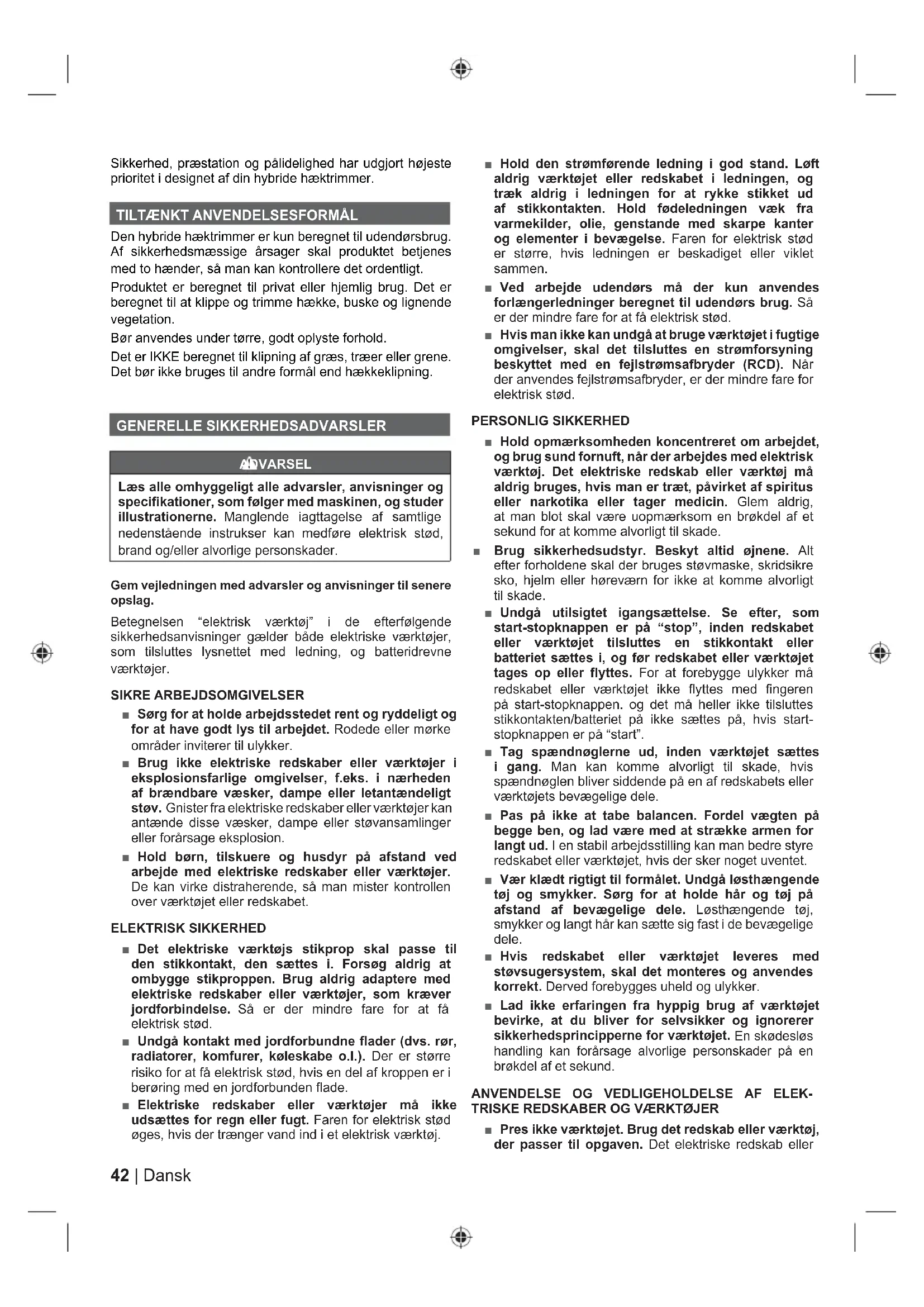 Den hybride hæktrimmer er kun beregnet til udendørsbrug. Af sikkerhedsmæssige årsager skal produktet betjenes med to hænder, så man kan kontrollere det ordentligt. Produktet er beregnet til privat eller hjemlig brug. Det er beregnet til at klippe og trimme hække, buske og lignende vegetation. Bør anvendes under tørre, godt oplyste forhold. Det er IKKE beregnet til klipning af græs, træer eller grene. Det bør ikke bruges til andre formål end hækkeklipning. GENERELLE SIKKERHEDSADVARSLER ADVARSEL Læs alle omhyggeligt alle advarsler, anvisninger og specifikationer, som følger med maskinen, og studer illustrationerne. Manglende iagttagelse af samtlige nedenstående instrukser kan medføre elektrisk stød, brand og/eller alvorlige personskader. Gem vejledningen med advarsler og anvisninger til senere opslag. Betegnelsen “elektrisk værktøj” i de efterfølgende sikkerhedsanvisninger gælder både elektriske værktøjer, som tilsluttes lysnettet med ledning, og batteridrevne værktøjer. SIKRE ARBEJDSOMGIVELSER ■ Sørg for at holde arbejdsstedet rent og ryddeligt og for at have godt lys til arbejdet. Rodede eller mørke områder inviterer til ulykker. ■ Brug ikke elektriske redskaber eller værktøjer i eksplosionsfarlige omgivelser, f.eks. i nærheden af brændbare væsker, dampe eller letantændeligt støv. Gnister fra elektriske redskaber eller værktøjer kan antænde disse væsker, dampe eller støvansamlinger eller forårsage eksplosion. ■ Hold børn, tilskuere og husdyr på afstand ved arbejde med elektriske redskaber eller værktøjer. De kan virke distraherende, så man mister kontrollen over værktøjet eller redskabet. ELEKTRISK SIKKERHED ■ Det elektriske værktøjs stikprop skal passe til den stikkontakt, den sættes i. Forsøg aldrig at ombygge stikproppen. Brug aldrig adaptere med elektriske redskaber eller værktøjer, som kræver jordforbindelse. Så er der mindre fare for at få elektrisk stød. ■ Undgå kontakt med jordforbundne flader (dvs. rør, radiatorer, komfurer, køleskabe o.l.). Der er større risiko for at få elektrisk stød, hvis en del af kroppen er i berøring med en jordforbunden flade. ■ Elektriske redskaber eller værktøjer må ikke udsættes for regn eller fugt. Faren for elektrisk stød øges, hvis der trænger vand ind i et elektrisk værktøj. ■ Hold den strømførende ledning i god stand. Løft aldrig værktøjet eller redskabet i ledningen, og træk aldrig i ledningen for at rykke stikket ud af stikkontakten. Hold fødeledningen væk fra varmekilder, olie, genstande med skarpe kanter og elementer i bevægelse. Faren for elektrisk stød er større, hvis ledningen er beskadiget eller viklet sammen. ■ Ved arbejde udendørs må der kun anvendes forlængerledninger beregnet til udendørs brug. Så er der mindre fare for at få elektrisk stød. ■ Hvis man ikke kan undgå at bruge værktøjet i fugtige omgivelser, skal det tilsluttes en strømforsyning beskyttet med en fejlstrømsafbryder (RCD). Når der anvendes fejlstrømsafbryder, er der mindre fare for elektrisk stød. PERSONLIG SIKKERHED ■ Hold opmærksomheden koncentreret om arbejdet, og brug sund fornuft, når der arbejdes med elektrisk værktøj. Det elektriske redskab eller værktøj må aldrig bruges, hvis man er træt, påvirket af spiritus eller narkotika eller tager medicin. Glem aldrig, at man blot skal være uopmærksom en brøkdel af et sekund for at komme alvorligt til skade. ■ Brug sikkerhedsudstyr. Beskyt altid øjnene. Alt efter forholdene skal der bruges støvmaske, skridsikre sko, hjelm eller høreværn for ikke at komme alvorligt til skade. ■ Undgå utilsigtet igangsættelse. Se efter, som start-stopknappen er på “stop”, inden redskabet eller værktøjet tilsluttes en stikkontakt eller batteriet sættes i, og før redskabet eller værktøjet tages op eller flyttes. For at forebygge ulykker må redskabet eller værktøjet ikke flyttes med fingeren på start-stopknappen. og det må heller ikke tilsluttes stikkontakten/batteriet på ikke sættes på, hvis start- stopknappen er på “start”. ■ Tag spændnøglerne ud, inden værktøjet sættes i gang. Man kan komme alvorligt til skade, hvis spændnøglen bliver siddende på en af redskabets eller værktøjets bevægelige dele. ■ Pas på ikke at tabe balancen. Fordel vægten på begge ben, og lad være med at strække armen for langt ud. I en stabil arbejdsstilling kan man bedre styre redskabet eller værktøjet, hvis der sker noget uventet. ■ Vær klædt rigtigt til formålet. Undgå løsthængende tøj og smykker. Sørg for at holde hår og tøj på afstand af bevægelige dele. Løsthængende tøj, smykker og langt hår kan sætte sig fast i de bevægelige dele. ■ Hvis redskabet eller værktøjet leveres med støvsugersystem, skal det monteres og anvendes korrekt. Derved forebygges uheld og ulykker. ■ Lad ikke erfaringen fra hyppig brug af værktøjet bevirke, at du bliver for selvsikker og ignorerer sikkerhedsprincipperne for værktøjet. En skødesløs handling kan forårsage alvorlige personskader på en brøkdel af et sekund.