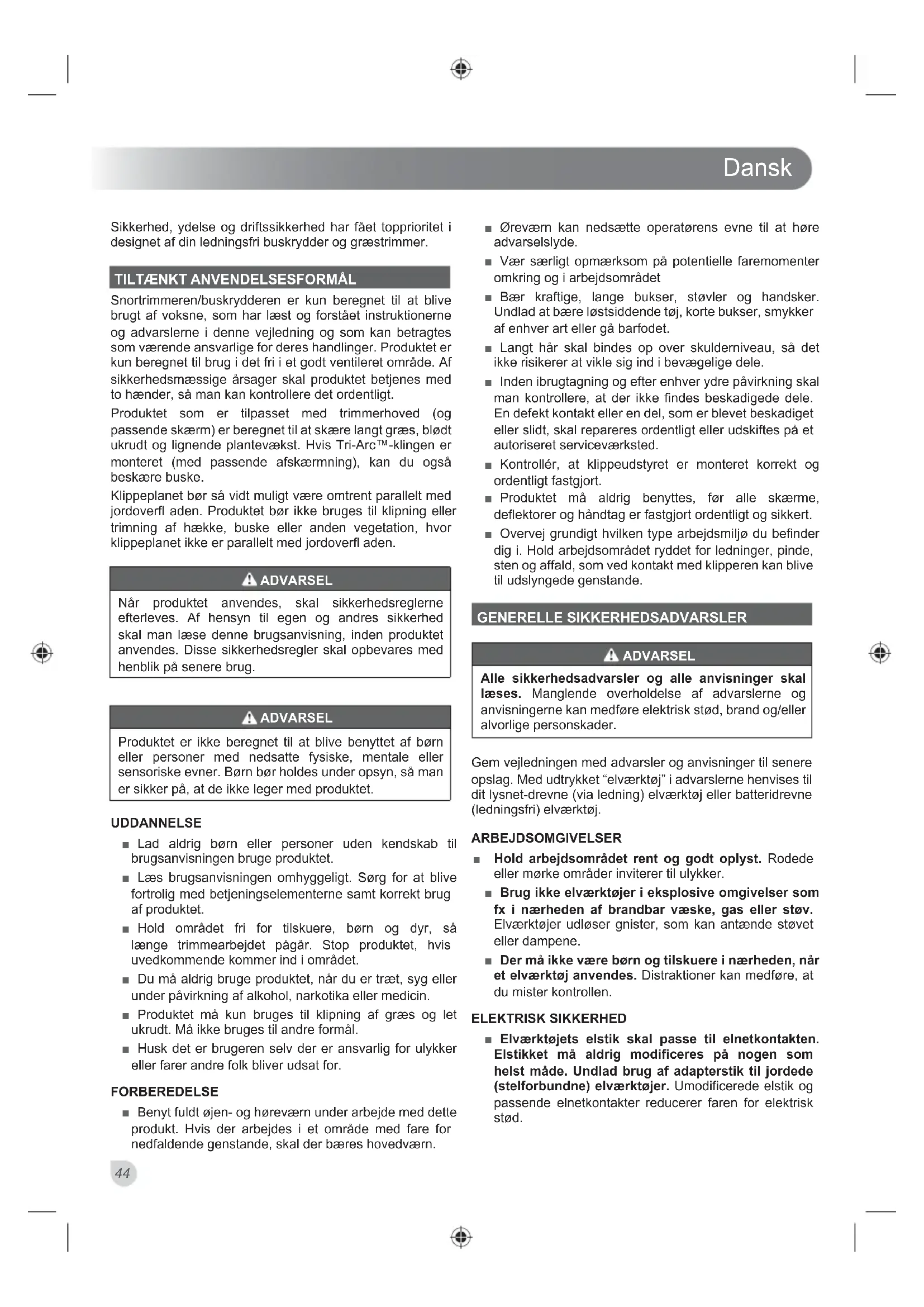 Snortrimmeren/buskrydderen er kun beregnet til at blive brugt af voksne, som har læst og forstået instruktionerne og advarslerne i denne vejledning og som kan betragtes som værende ansvarlige for deres handlinger. Produktet er kun beregnet til brug i det fri i et godt ventileret område. Af sikkerhedsmæssige årsager skal produktet betjenes med to hænder, så man kan kontrollere det ordentligt. Produktet som er tilpasset med trimmerhoved (og passende skærm) er beregnet til at skære langt græs, blødt ukrudt og lignende plantevækst. Hvis Tri-Arc™-klingen er monteret (med passende afskærmning), kan du også beskære buske. Klippeplanet bør så vidt muligt være omtrent parallelt med jordoverfl aden. Produktet bør ikke bruges til klipning eller trimning af hække, buske eller anden vegetation, hvor klippeplanet ikke er parallelt med jordoverfl aden. ADVARSEL Når produktet anvendes, skal sikkerhedsreglerne efterleves. Af hensyn til egen og andres sikkerhed skal man læse denne brugsanvisning, inden produktet anvendes. Disse sikkerhedsregler skal opbevares med henblik på senere brug. ADVARSEL Produktet er ikke beregnet til at blive benyttet af børn eller personer med nedsatte fysiske, mentale eller sensoriske evner. Børn bør holdes under opsyn, så man er sikker på, at de ikke leger med produktet. UDDANNELSE ■ Lad aldrig børn eller personer uden kendskab til brugsanvisningen bruge produktet. ■ Læs brugsanvisningen omhyggeligt. Sørg for at blive fortrolig med betjeningselementerne samt korrekt brug af produktet. ■ Hold området fri for tilskuere, børn og dyr, så længe trimmearbejdet pågår. Stop produktet, hvis uvedkommende kommer ind i området. ■ Du må aldrig bruge produktet, når du er træt, syg eller under påvirkning af alkohol, narkotika eller medicin. ■ Produktet må kun bruges til klipning af græs og let ukrudt. Må ikke bruges til andre formål. ■ Husk det er brugeren selv der er ansvarlig for ulykker eller farer andre folk bliver udsat for. FORBEREDELSE ■ Benyt fuldt øjen- og høreværn under arbejde med dette produkt. Hvis der arbejdes i et område med fare for nedfaldende genstande, skal der bæres hovedværn. ■ Øreværn kan nedsætte operatørens evne til at høre advarselslyde. ■ Vær særligt opmærksom på potentielle faremomenter omkring og i arbejdsområdet ■ Bær kraftige, lange bukser, støvler og handsker. Undlad at bære løstsiddende tøj, korte bukser, smykker af enhver art eller gå barfodet. ■ Langt hår skal bindes op over skulderniveau, så det ikke risikerer at vikle sig ind i bevægelige dele. ■ Inden ibrugtagning og efter enhver ydre påvirkning skal man kontrollere, at der ikke findes beskadigede dele. En defekt kontakt eller en del, som er blevet beskadiget eller slidt, skal repareres ordentligt eller udskiftes på et autoriseret serviceværksted. ■ Kontrollér, at klippeudstyret er monteret korrekt og ordentligt fastgjort. ■ Produktet må aldrig benyttes, før alle skærme, deflektorer og håndtag er fastgjort ordentligt og sikkert. ■ Overvej grundigt hvilken type arbejdsmiljø du befinder dig i. Hold arbejdsområdet ryddet for ledninger, pinde, sten og affald, som ved kontakt med klipperen kan blive til udslyngede genstande. GENERELLE SIKKERHEDSADVARSLER ADVARSEL Alle sikkerhedsadvarsler og alle anvisninger skal læses. Manglende overholdelse af advarslerne og anvisningerne kan medføre elektrisk stød, brand og/eller alvorlige personskader. Gem vejledningen med advarsler og anvisninger til senere opslag. Med udtrykket “elværktøj” i advarslerne henvises til dit lysnet-drevne (via ledning) elværktøj eller batteridrevne (ledningsfri) elværktøj. ARBEJDSOMGIVELSER ■ Hold arbejdsområdet rent og godt oplyst. Rodede eller mørke områder inviterer til ulykker. ■ Brug ikke elværktøjer i eksplosive omgivelser som fx i nærheden af brandbar væske, gas eller støv. Elværktøjer udløser gnister, som kan antænde støvet eller dampene. ■ Der må ikke være børn og tilskuere i nærheden, når et elværktøj anvendes. Distraktioner kan medføre, at du mister kontrollen. ELEKTRISK SIKKERHED ■ Elværktøjets elstik skal passe til elnetkontakten. Elstikket må aldrig modificeres på nogen som helst måde. Undlad brug af adapterstik til jordede (stelforbundne) elværktøjer. Umodificerede elstik og passende elnetkontakter reducerer faren for elektrisk stød.Dansk