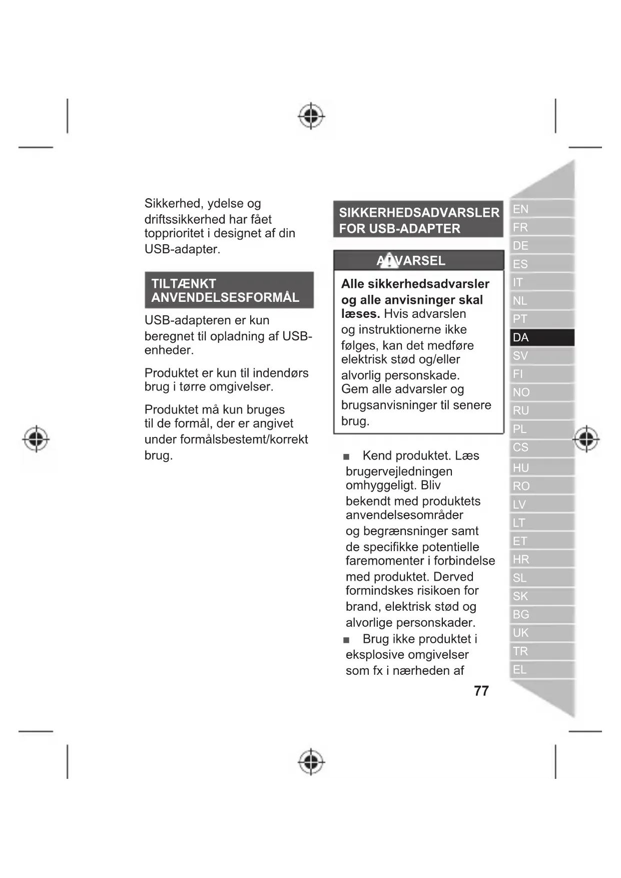 Sikkerhed, ydelse og driftssikkerhed har fået topprioritet i designet af din USB-adapter. TILTÆNKT ANVENDELSESFORMÅL USB-adapteren er kun beregnet til opladning af USB- enheder. Produktet er kun til indendørs brug i tørre omgivelser. Produktet må kun bruges til de formål, der er angivet under formålsbestemt/korrekt brug. SIKKERHEDSADVARSLER FOR USB-ADAPTER ADVARSEL Alle sikkerhedsadvarsler og alle anvisninger skal læses. Hvis advarslen og instruktionerne ikke følges, kan det medføre elektrisk stød og/eller alvorlig personskade. Gem alle advarsler og brugsanvisninger til senere brug. Ŷ Kend produktet. Læs brugervejledningen omhyggeligt. Bliv bekendt med produktets anvendelsesområder og begrænsninger samt de specifikke potentielle faremomenter i forbindelse med produktet. Derved formindskes risikoen for brand, elektrisk stød og alvorlige personskader. Ŷ Brug ikke produktet i eksplosive omgivelser som fx i nærheden af78 | Dansk brandbar væske, gas eller støv. Produktet kan udløse gnister, som kan antænde støvet eller dampene. Ŷ Undlad at bruge produktet nær vand. Ŷ Må kun rengøres med en tør klud. Brug aldrig bremsevæske, benzin, petroleumsbaserede produkter eller kraftige opløsningsmidler til rengøring af produktet. Iagttagelse af denne regel vil reducere faren for tab af kontrol og nedbrydning af indkapslingsplasten. Ŷ Undlad at blokere ventilationsåbninger. Skal installeres ifølge producentens vejledning. Ŷ Undlad at anbringe produktet i lukkede bogreoler eller reoler uden ordentlig ventilation. Oprethold en mindsteaftand på 5 cm til andre genstande. Ŷ Undlad at placere produktet i nærheden af varmekilder såsom radiatorer, varmeapparater, ovne eller andre produkter (herunder forstærkere), der udvikler varme. Ŷ Brug kun tilbehør og ekstraudstyr, der anbefales af producenten. Ŷ Enhver form for sevice skal udføres af autoriseret servicepersonale. Service er påkrævet, hvisr produktet er blevet beskadiget på nogen som helst måde, hvis der er spildt væske eller, eller hvis der er faldet genstande ind i produktet, hvis produktet er blevet udsat for regn eller fugt, ikke fungerer normalt eller er blevet tabt. Ŷ Ved service: Brug kun originale reservedele, ekstraudstyr og tilbehør fra producenten. Følg anvisningerne i afsnittet "Vedligeholdelse" i denne brugsanvisning. Brug af uautoriserede dele eller manglende overholdelse af vedligeholdelsesinstruktio- ner kan udgøre en risiko for79 Dansk |