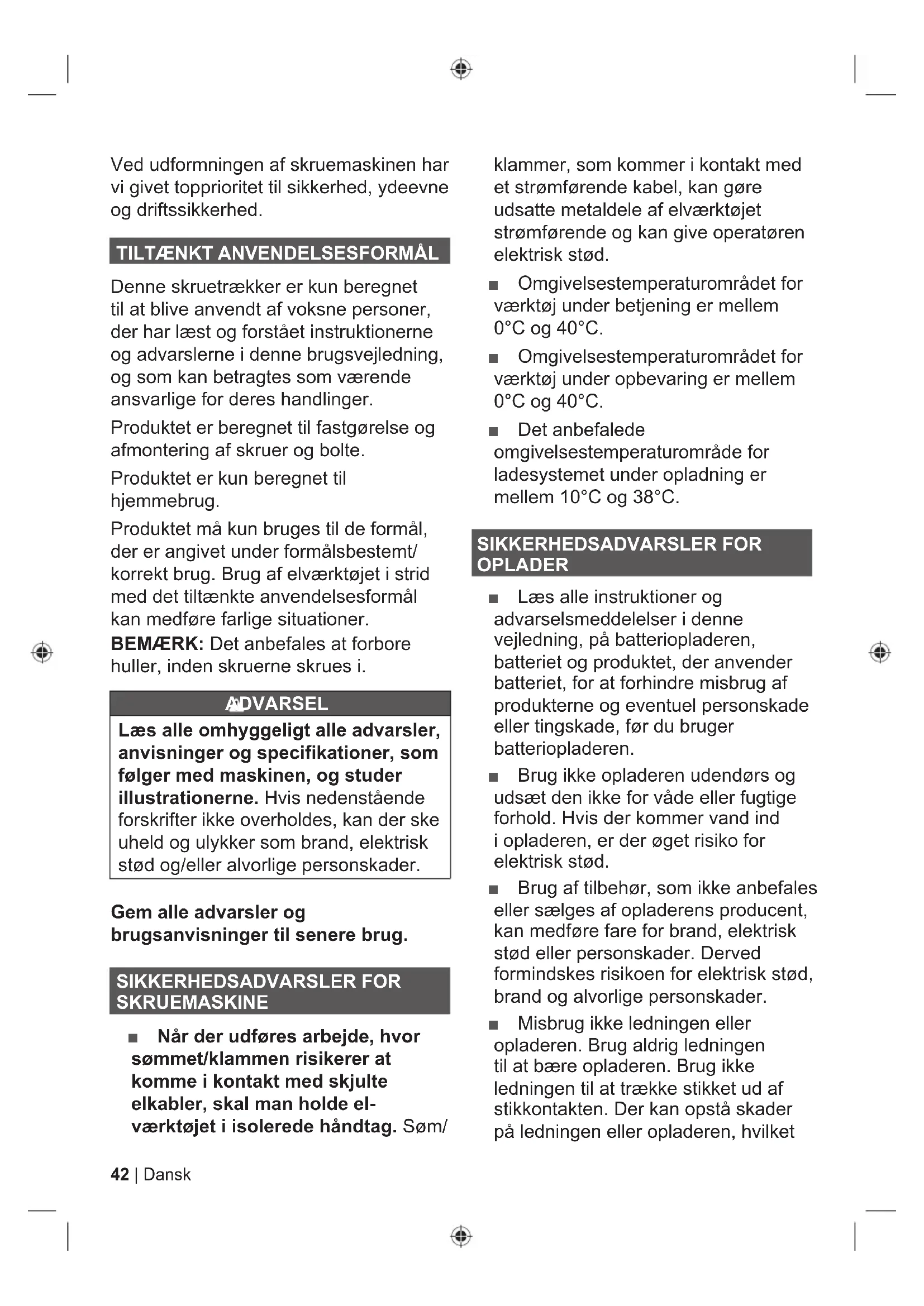Denne skruetrækker er kun beregnet til at blive anvendt af voksne personer, der har læst og forstået instruktionerne og advarslerne i denne brugsvejledning, og som kan betragtes som værende ansvarlige for deres handlinger. Produktet er beregnet til fastgørelse og afmontering af skruer og bolte. Produktet er kun beregnet til hjemmebrug. Produktet må kun bruges til de formål, der er angivet under formålsbestemt/ korrekt brug. Brug af elværktøjet i strid med det tiltænkte anvendelsesformål kan medføre farlige situationer. BEMÆRK: Det anbefales at forbore huller, inden skruerne skrues i. ADVARSEL Læs alle omhyggeligt alle advarsler, anvisninger og specifikationer, som følger med maskinen, og studer illustrationerne. Hvis nedenstående forskrifter ikke overholdes, kan der ske uheld og ulykker som brand, elektrisk stød og/eller alvorlige personskader. Gem alle advarsler og brugsanvisninger til senere brug. SIKKERHEDSADVARSLER FOR SKRUEMASKINE Ŷ Når der udføres arbejde, hvor sømmet/klammen risikerer at komme i kontakt med skjulte elkabler, skal man holde el- værktøjet i isolerede håndtag. Søm/ klammer, som kommer i kontakt med et strømførende kabel, kan gøre udsatte metaldele af elværktøjet strømførende og kan give operatøren elektrisk stød. Ŷ Omgivelsestemperaturområdet for værktøj under betjening er mellem 0°C og 40°C. Ŷ Omgivelsestemperaturområdet for værktøj under opbevaring er mellem 0°C og 40°C. Ŷ Det anbefalede omgivelsestemperaturområde for ladesystemet under opladning er mellem 10°C og 38°C. SIKKERHEDSADVARSLER FOR OPLADER Ŷ Læs alle instruktioner og advarselsmeddelelser i denne vejledning, på batteriopladeren, batteriet og produktet, der anvender batteriet, for at forhindre misbrug af produkterne og eventuel personskade eller tingskade, før du bruger batteriopladeren. Ŷ Brug ikke opladeren udendørs og udsæt den ikke for våde eller fugtige forhold. Hvis der kommer vand ind i opladeren, er der øget risiko for elektrisk stød. Ŷ Brug af tilbehør, som ikke anbefales eller sælges af opladerens producent, kan medføre fare for brand, elektrisk stød eller personskader. Derved formindskes risikoen for elektrisk stød, brand og alvorlige personskader. Ŷ Misbrug ikke ledningen eller opladeren. Brug aldrig ledningen til at bære opladeren. Brug ikke ledningen til at trække stikket ud af stikkontakten. Der kan opstå skader på ledningen eller opladeren, hvilket43 Dansk |