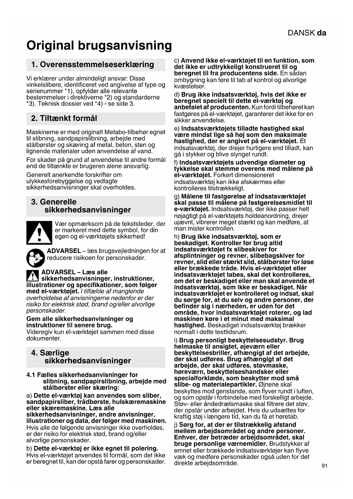 Original brugsanvisning Vi erklærer under almindeligt ansvar: Disse vinkelslibere, identificeret ved angivelse af type og serienummer *1), opfylder alle relevante bestemmelser i direktiverne *2) og standarderne *3). Teknisk dossier ved *4) - se side 3. Maskinerne er med originalt Metabo-tilbehør egnet til slibning, sandpapirslibning, arbejde med stålbørster og skæring af metal, beton, sten og lignende materialer uden anvendelse af vand. For skader på grund af anvendelse til andre formål end de tiltænkte er brugeren alene ansvarlig. Generelt anerkendte forskrifter om ulykkesforebyggelse og vedlagte sikkerhedsanvisninger skal overholdes. Vær opmærksom på de tekststeder, der er markeret med dette symbol, for din egen og el-værktøjets sikkerhed! ADVARSEL – læs brugsvejledningen for at reducere risikoen for personskader. ADVARSEL – Læs alle sikkerhedsanvisninger, instruktioner, illustrationer og specifikationer, som følger med el-værktøjet. I tilfælde af manglende overholdelse af anvisningerne nedenfor er der risiko for elektrisk stød, brand og/eller alvorlige personskader. Gem alle sikkerhedsanvisninger og instruktioner til senere brug. Videregiv kun el-værktøjet sammen med disse dokumenter.