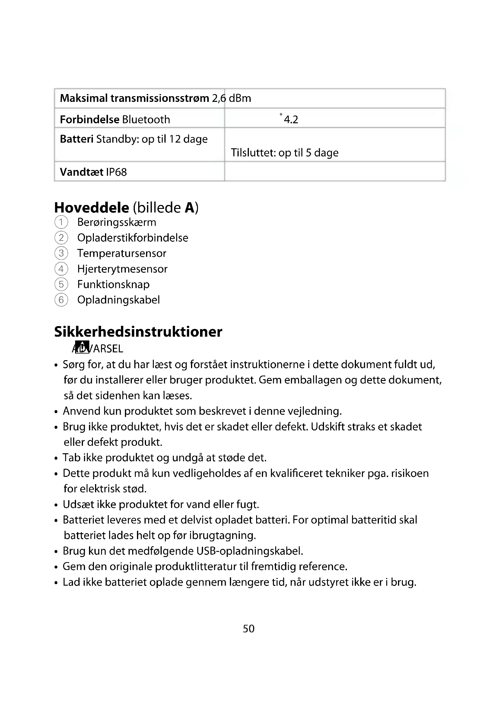 Batteri Standby: op til 12 dage Tilsluttet: op til 5 dage Vandtæt IP68 Hoveddele (billede A) 1 Berøringsskærm 2 Opladerstikforbindelse 3 Temperatursensor 4 Hjerterytmesensor 5 Funktionsknap 6 Opladningskabel Sikkerhedsinstruktioner