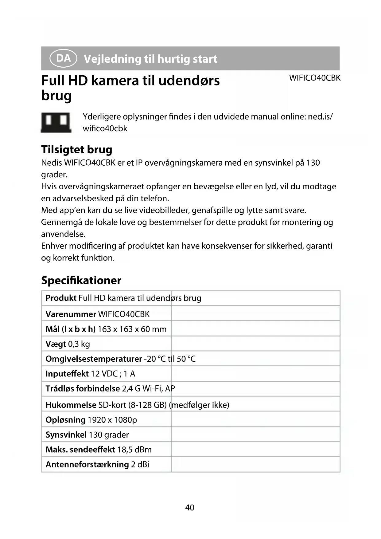 Vejledning til hurtig start Full HD kamera til udendørs brug WIFICO40CBK Yderligere oplysninger ndes i den udvidede manual online: ned.is/ wico40cbk Tilsigtet brug Nedis WIFICO40CBK er et IP overvågningskamera med en synsvinkel på 130 grader. Hvis overvågningskameraet opfanger en bevægelse eller en lyd, vil du modtage en advarselsbesked på din telefon. Med app’en kan du se live videobilleder, genafspille og lytte samt svare. Gennemgå de lokale love og bestemmelser for dette produkt før montering og anvendelse. Enhver modicering af produktet kan have konsekvenser for sikkerhed, garanti og korrekt funktion. Specikationer Produkt Full HD kamera til udendørs brug Varenummer WIFICO40CBK Mål (l x b x h) 163 x 163 x 60 mm Vægt 0,3 kg Omgivelsestemperaturer -20 °C til 50 °C Inputeekt 12 VDC ; 1 A Trådløs forbindelse 2,4 G Wi-Fi, AP Hukommelse SD-kort (8-128 GB) (medfølger ikke) Opløsning 1920 x 1080p Synsvinkel 130 grader Maks. sendeeekt 18,5 dBm Antenneforstærkning 2 dBi41 Frekvensinterval 2412 - 2472 MHz Vandtæt IP65 Hoveddele (billede A) 1 Strømadapter 2 Mikrofon 3 Kameralinse 4 Statusindikator LED 5 WiFi-antenne 6 Nulstillingsknap 7 Sprække til mikro SD-kort 8 Højttaler Sikkerhedsinstruktioner
