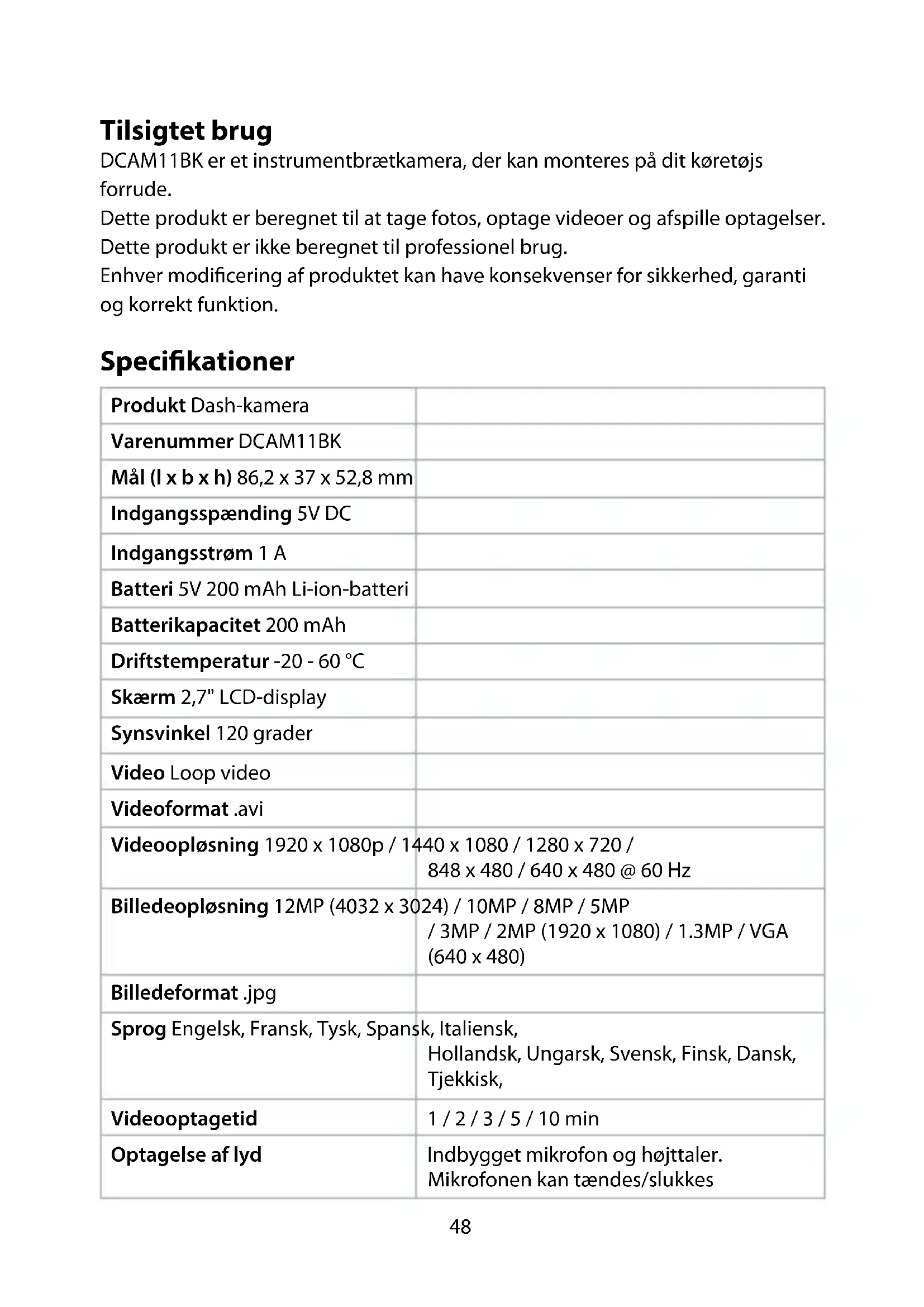 Vejledning til hurtig start Dash-kamera DCAM11BK Yderligere oplysninger ndes i den udvidede manual online: ned.is/dcam11bk48 Tilsigtet brug DCAM11BK er et instrumentbrætkamera, der kan monteres på dit køretøjs forrude. Dette produkt er beregnet til at tage fotos, optage videoer og afspille optagelser. Dette produkt er ikke beregnet til professionel brug. Enhver modicering af produktet kan have konsekvenser for sikkerhed, garanti og korrekt funktion. Specikationer Produkt Dash-kamera Varenummer DCAM11BK Mål (l x b x h) 86,2 x 37 x 52,8 mm Indgangsspænding 5V DC Indgangsstrøm 1 A Batteri 5V 200 mAh Li-ion-batteri Batterikapacitet 200 mAh Driftstemperatur -20 - 60 °C Skærm 2,7" LCD-display Synsvinkel 120 grader Video Loop video Videoformat .avi Videoopløsning 1920 x 1080p / 1440 x 1080 / 1280 x 720 / 848 x 480 / 640 x 480 @ 60 Hz Billedeopløsning 12MP (4032 x 3024) / 10MP / 8MP / 5MP / 3MP / 2MP (1920 x 1080) / 1.3MP / VGA (640 x 480) Billedeformat .jpg Sprog Engelsk, Fransk, Tysk, Spansk, Italiensk, Hollandsk, Ungarsk, Svensk, Finsk, Dansk, Tjekkisk, Videooptagetid 1 / 2 / 3 / 5 / 10 min Optagelse af lyd Indbygget mikrofon og højttaler. Mikrofonen kan tændes/slukkes49 Hukommelseskort Mikro SD-kort Hukommelseskortets kapacitet 1 - 32 GB USB-grænseade USB 2.0 Hoveddele (billede A)