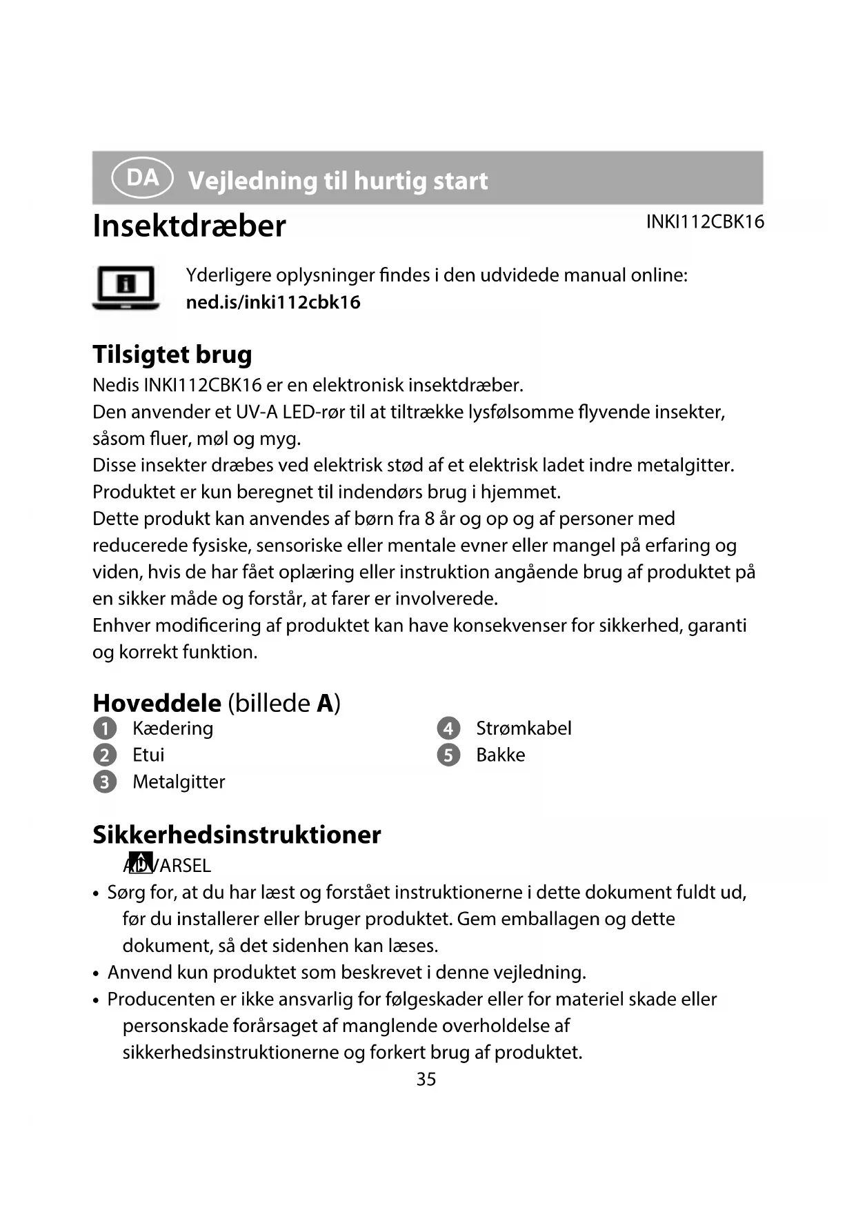 Vejledning til hurtig start Insektdræber INKI112CBK16Yderligere oplysninger ndes i den udvidede manual online: ned.is/inki112cbk16 Tilsigtet brug Nedis INKI112CBK16 er en elektronisk insektdræber.Den anvender et UV-A LED-rør til at tiltrække lysfølsomme yvende insekter, såsom uer, møl og myg.Disse insekter dræbes ved elektrisk stød af et elektrisk ladet indre metalgitter.Produktet er kun beregnet til indendørs brug i hjemmet.Dette produkt kan anvendes af børn fra 8 år og op og af personer med reducerede fysiske, sensoriske eller mentale evner eller mangel på erfaring og viden, hvis de har fået oplæring eller instruktion angående brug af produktet på en sikker måde og forstår, at farer er involverede.Enhver modicering af produktet kan have konsekvenser for sikkerhed, garanti og korrekt funktion. Hoveddele (billede A) 1 Kædering 2 Etui 3 Metalgitter 4 Strømkabel 5 Bakke Sikkerhedsinstruktioner