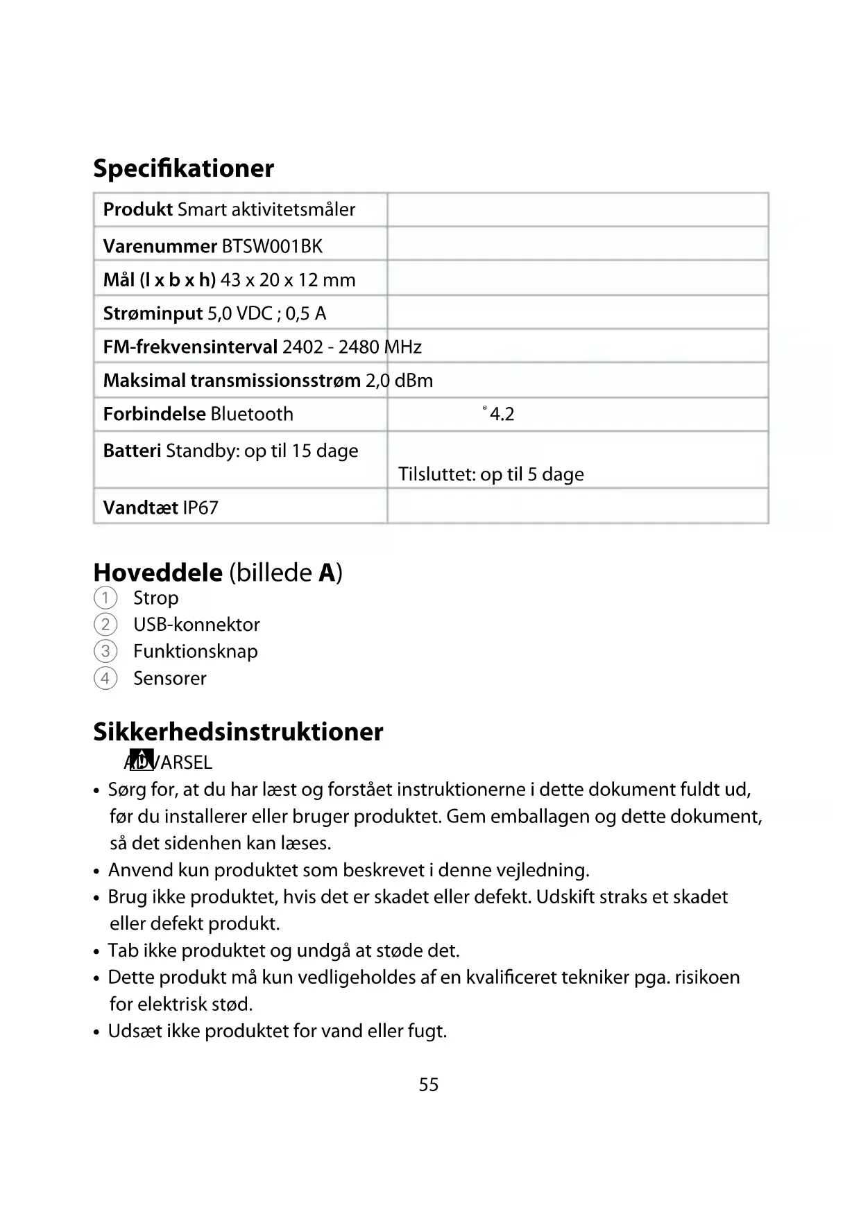 Batteri Standby: op til 15 dage Tilsluttet: op til 5 dage Vandtæt IP67 Hoveddele (billede A) 1 Strop 2 USB-konnektor 3 Funktionsknap 4 Sensorer Sikkerhedsinstruktioner
