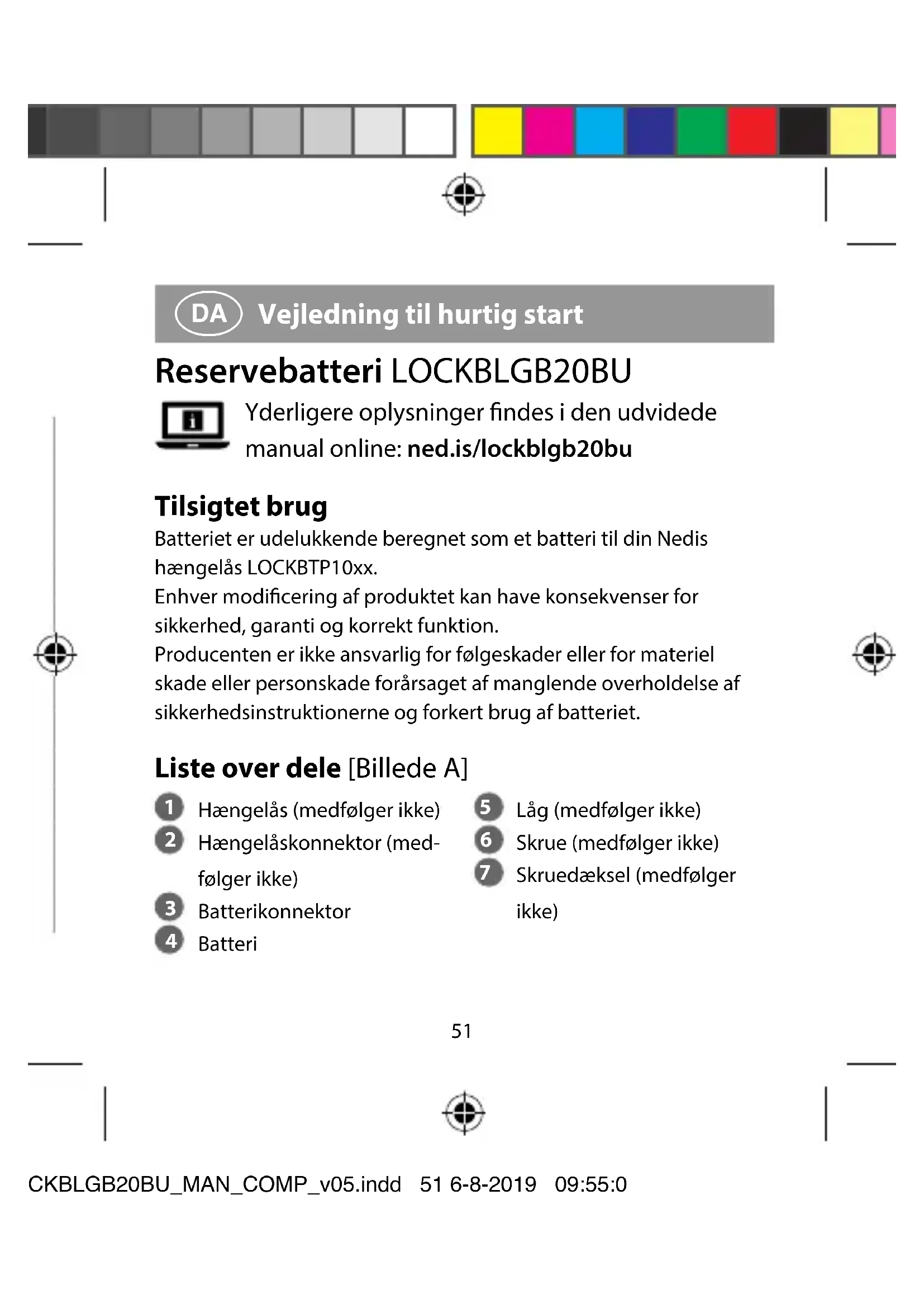 Vejledning til hurtig start Reservebatteri LOCKBLGB20BU Yderligere oplysninger ndes i den udvidede manual online: ned.is/lockblgb20bu Tilsigtet brug Batteriet er udelukkende beregnet som et batteri til din Nedis hængelås LOCKBTP10xx. Enhver modicering af produktet kan have konsekvenser for sikkerhed, garanti og korrekt funktion. Producenten er ikke ansvarlig for følgeskader eller for materiel skade eller personskade forårsaget af manglende overholdelse af sikkerhedsinstruktionerne og forkert brug af batteriet. Liste over dele [Billede A]