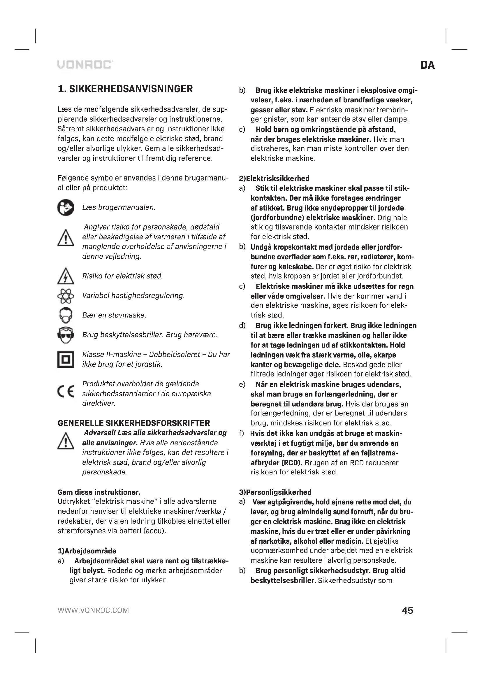 Kun for EU-lande Smid ikke el-værktøjer ud sammen med alminde- ligt affald. I henhold til de europæiske direktiver 2012/19/EU for elektrisk og elektronisk udstyr og er implementeret i henhold til nationale rettigheder, el-værktøj som ikke længere er anvendelig skal indsamles separat og genbruges på en miljøvenlig måde. GARANTIVILKÅR VONROC produkter er udviklet efter de højeste kvalitetsstandarder og er garanteret fri for mangler i såvel materialer som udførelse i den lovpligtige periode, der starter fra datoen for det oprindelige køb. Skulle produktet udvikle nogen fejl i løbet af denne periode på grund af defekte materialer og/ eller fabrikationsfejl, så kontakt VONROC direkte. De følgende forhold er udelukket fra denne garanti: