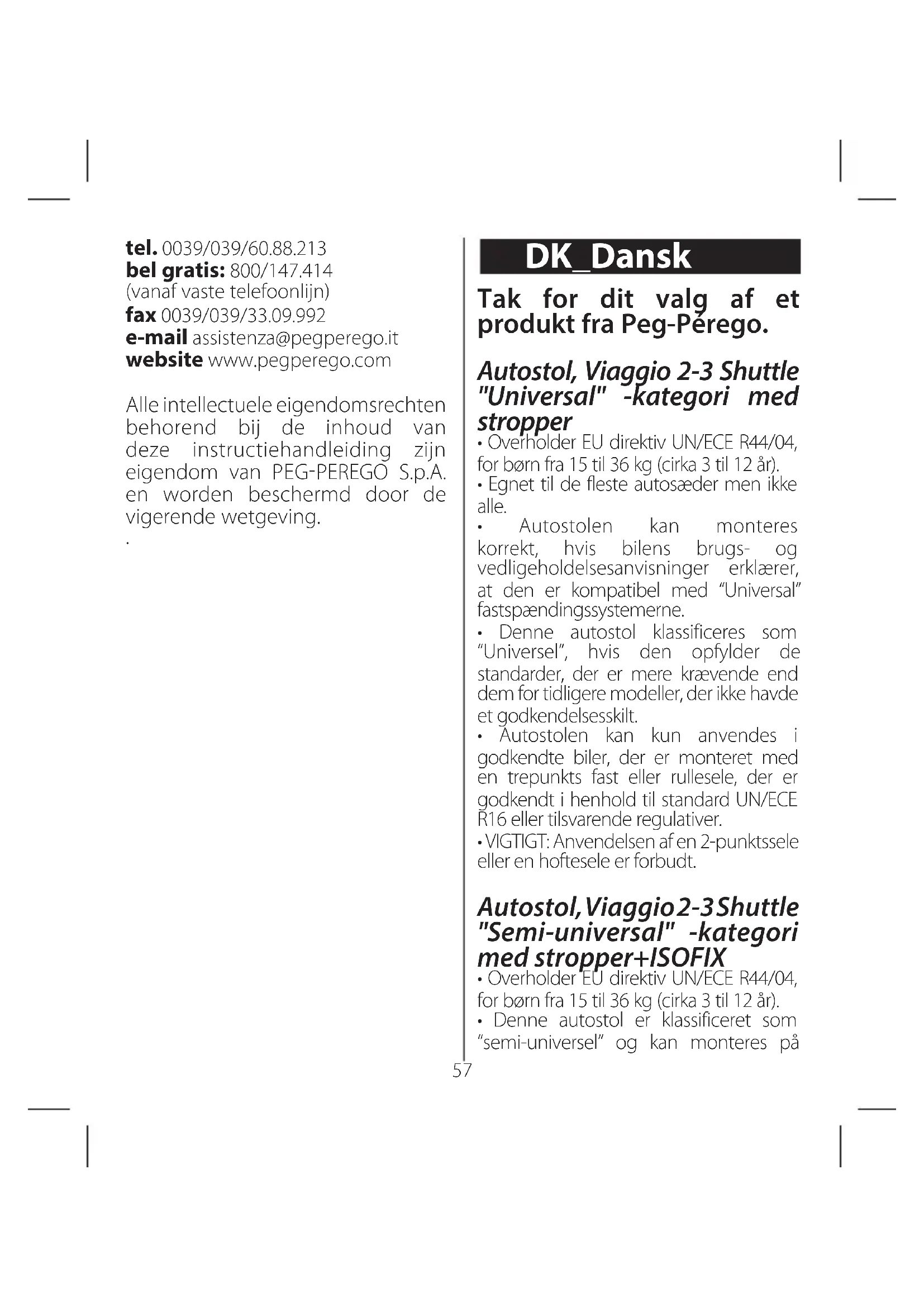 - Produktionsserienummer: Ved udstedelsen af typegodkendelsen identificeres den enkelte autostol med sit eget unikke nummer. PEG-PÉREGO S.p.A. Peg-Pérego SpA tager et kvalitetsstyringssystem i brug, der er certificeret af TÜV Italia Srl i henhold til ISO 9001 standarden. Peg-Pérego forbeholder sig retten til på ethvert tidspunkt at foretage ændringer af de heri beskrevne modeller af tekniske eller forretningsmæssige grunde. Peg-Pérego efter-salgsservice Hvis nogen af produktets dele mistes eller beskadiges, må du kun bruge originale reservedele fra Peg-Pérego. Kontakt Peg-Pérego Assistance Service vedrørende eventuelle reparationer, udskiftninger, oplysninger om produkterne og salg af originale reservedele og tilbehør. Oplys produktets serienummer, hvis det er tilstede. Tlf. 0039/039/60.88.213 Gratis nummer: 800/147.414 (kan kontaktes på fastnettelefon) Fax 0039/039/33.09.992 E-mail: assistenza@pegperego.it Websted: www.pegperego.com Al intellektuel ejendomsret på indholdet i denne vejledning tilhører PEGPEREGO S.p.A. og er under beskyttelse af gældende lovgivning.63 Kiitos Peg-Pérego -tuotteen valinnasta. Turvaistuin, Viaggio 2-3 Shuttle"Kaikkiin autoihin sopiva" -luokka, hihnallinen