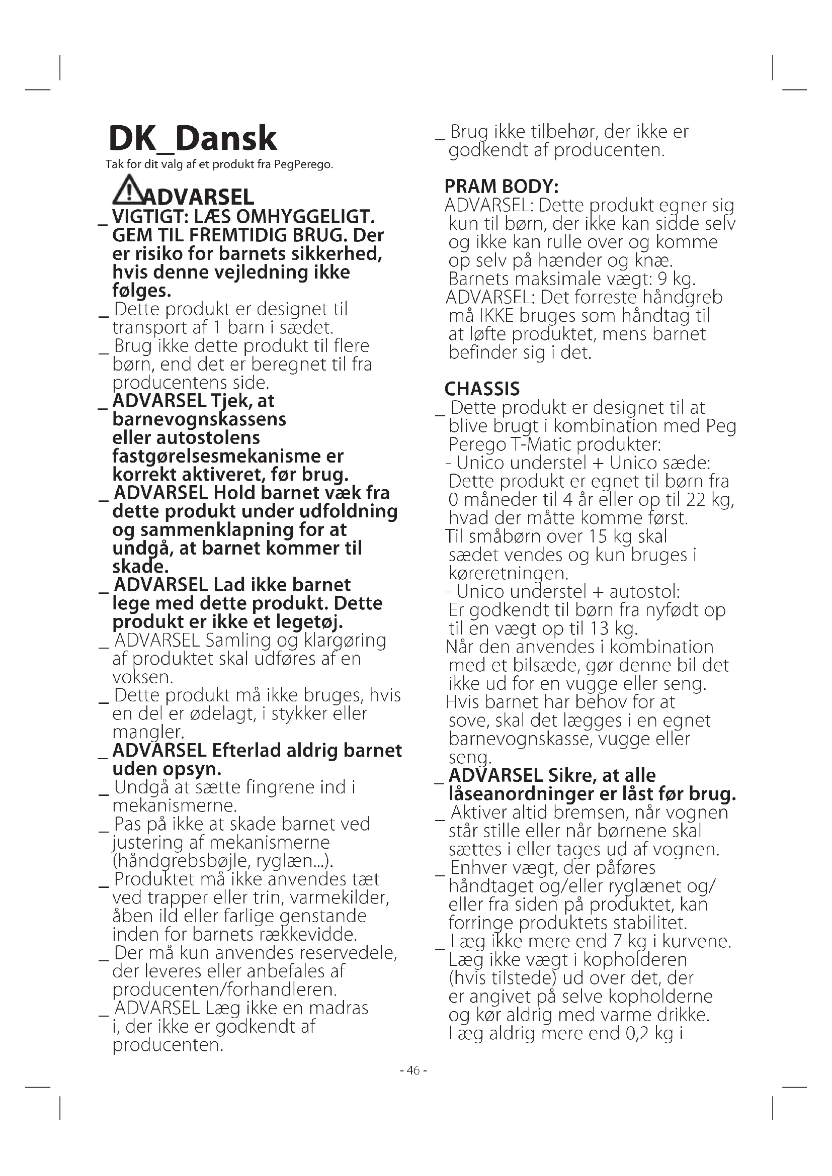 Indien delen van het model per ongeluk kwijtraken of beschadigd raken, dient u alleen originele reserveonderdelen van PegPerego te gebruiken. Voor eventuele reparaties aan, vervanging van of informatie over de producten, verkoop van originele reserveonderdelen en accessoires, kunt u contact opnemen met de Assistentiedienst van PegPerego. Vermeld hierbij, indien mogelijk, het serienummer van het product. tel. 0039/039/60.88.213 e-mail assistenza@pegpergo.com site internet www.pegperego.com Alle intellectuele eigendomsrechten op de inhoud van deze gebruiksaanwijzing zijn eigendom van PegPerego S.p.A. en worden beschermd volgens de van toepassing zijnde wetten.- 46 - _ Brug ikke tilbehør, der ikke er godkendt af producenten. PRAM BODY: ADVARSEL: Dette produkt egner sig kun til børn, der ikke kan sidde selv og ikke kan rulle over og komme op selv på hænder og knæ. Barnets maksimale vægt: 9 kg. ADVARSEL: Det forreste håndgreb må IKKE bruges som håndtag til at løfte produktet, mens barnet befinder sig i det. CHASSIS _ Dette produkt er designet til at blive brugt i kombination med Peg Perego T-Matic produkter: - Unico understel + Unico sæde: Dette produkt er egnet til børn fra 0 måneder til 4 år eller op til 22 kg, hvad der måtte komme først. Til småbørn over 15 kg skal sædet vendes og kun bruges i køreretningen. - Unico understel + autostol: Er godkendt til børn fra nyfødt op til en vægt op til 13 kg. Når den anvendes i kombination med et bilsæde, gør denne bil det ikke ud for en vugge eller seng. Hvis barnet har behov for at sove, skal det lægges i en egnet barnevognskasse, vugge eller seng. _ ADVARSEL Sikre, at alle låseanordninger er låst før brug. _ Aktiver altid bremsen, når vognen står stille eller når børnene skal sættes i eller tages ud af vognen. _ Enhver vægt, der påføres håndtaget og/eller ryglænet og/ eller fra siden på produktet, kan forringe produktets stabilitet. _ Læg ikke mere end 7 kg i kurvene. Læg ikke vægt i kopholderen (hvis tilstede) ud over det, der er angivet på selve kopholderne og kør aldrig med varme drikke. Læg aldrig mere end 0,2 kg i DK_Dansk Tak for dit valg af et produkt fra PegPerego. ADVARSEL _ VIGTIGT: LÆS OMHYGGELIGT. GEM TIL FREMTIDIG BRUG. Der er risiko for barnets sikkerhed, hvis denne vejledning ikke følges. _ Dette produkt er designet til transport af 1 barn i sædet. _ Brug ikke dette produkt til flere børn, end det er beregnet til fra producentens side. _ ADVARSEL Tjek, at barnevognskassens eller autostolens fastgørelsesmekanisme er korrekt aktiveret, før brug. _ ADVARSEL Hold barnet væk fra dette produkt under udfoldning og sammenklapning for at undgå, at barnet kommer til skade. _ ADVARSEL Lad ikke barnet lege med dette produkt. Dette produkt er ikke et legetøj. _ ADVARSEL Samling og klargøring af produktet skal udføres af en voksen. _ Dette produkt må ikke bruges, hvis en del er ødelagt, i stykker eller mangler. _ ADVARSEL Efterlad aldrig barnet uden opsyn. _ Undgå at sætte fingrene ind i mekanismerne. _ Pas på ikke at skade barnet ved justering af mekanismerne (håndgrebsbøjle, ryglæn...). _ Produktet må ikke anvendes tæt ved trapper eller trin, varmekilder, åben ild eller farlige genstande inden for barnets rækkevidde. _ Der må kun anvendes reservedele, der leveres eller anbefales af producenten/forhandleren. _ ADVARSEL Læg ikke en madras i, der ikke er godkendt af producenten.- 47 - kalechelommerne (hvis de er tilstede). _ ADVARSEL Dette produkt er ikke egnet til løb eller rulleskøjteløb. SEAT _ Unico-SÆDET er beregnet til brug sammen med Unico understellet. _ ADVARSEL: Brug altid selen. Brug altid fempunktsselen. Lås altid maveselen med skridtremmen. _ Frontbøjlen er ikke beregnet til at bære barnets vægt. Frontbøjlen er ikke beregnet til at løfte sædet med barnets vægt. Frontbøjlen kan ikke erstatte sikkerhedsselen. _ ADVARSEL: Brug ikke regnslaget (hvis tilstede) inden døre og kontroller, at barnet ikke har det for varmt. Efterlad det ikke tæt på varmekilder, og holde det borte fra cigaretter. Regnslaget må ikke bruges på en klapvogn uden kaleche eller parasol, som den kan sættes fast på. Brug kun regnslaget under overvågning af en voksen. Kontroller, at regnslaget ikke kommer i klemme i nogen bevægelig mekanisme på understellet eller klapvognen. Aftag regnslaget, før understellet eller klapvognen klappes sammen. Billederne, der er tilknyttet tekstiloplysningerne, kan adskille sig fra den købte kollektion. Se flere oplysninger på vores websted: www.pegperego.com VEJLEDNING UNICO UNDERSTEL 1 ÅBNING: Før du åbner stellet, og hvis det er tilstede, skal du fjerne al udstanset pap (uden brug af knive). VAROITUS!: _ TRÆK IKKE OG TVING IKKE BESLAGENE MERE END DE KAN HOLDE TIL. _ BRUG IKKE BESLAGENE SOM BÆREHÅNDTAG TIL TRANSPORT ELLER TIL AT BÆRE VÆGT. HÆNG IKKE TASKER ELLER ANDET TILBEHØR PÅ DENNE DEL. Tryk sidemonteringsbeslaget opad, grib de øverste ender af håndgrebsbøjlen og drej dem mod dig, til understellet er helt åbnet (fig_a). Åbnet understel (fig_b). Understellet er åbnet korrekt, hvis du hører et klik, der kommer fra fastgørelsen af håndgrebsbøjlen - se illustrationen. 2 MONTERING AF HJULENE: Før baghjulets tværstykke ind over benene (fig_a), og sørg for at det vender den rigtige vej, påsæt derefter baghjulene, så de klikker på plads (fig_b). Forhjulene monteres ved at sætte dem ind i noterne, til de klikker på plads (fig_c). 3 PÅSÆTNING AF HÅNDTAGET: Hvis håndtagsrøret vender opad kan man indstille det efter klapvognen (fig_a). Fastgør håndtaget til stellet, som vist i figuren (fig_b). For at færdiggøre handlingen skal man trykke på de to sideknapper på håndtaget (fig_c) for at sikre, at håndtaget er skubbet helt ind, indtil det klikker på plads (fig_d). 4 KURV: Montering af kurvens forreste del. Fastgør kurvens øjer til knapperne på hver side af understellet (fig_1). Påmonteringen af kurven afs