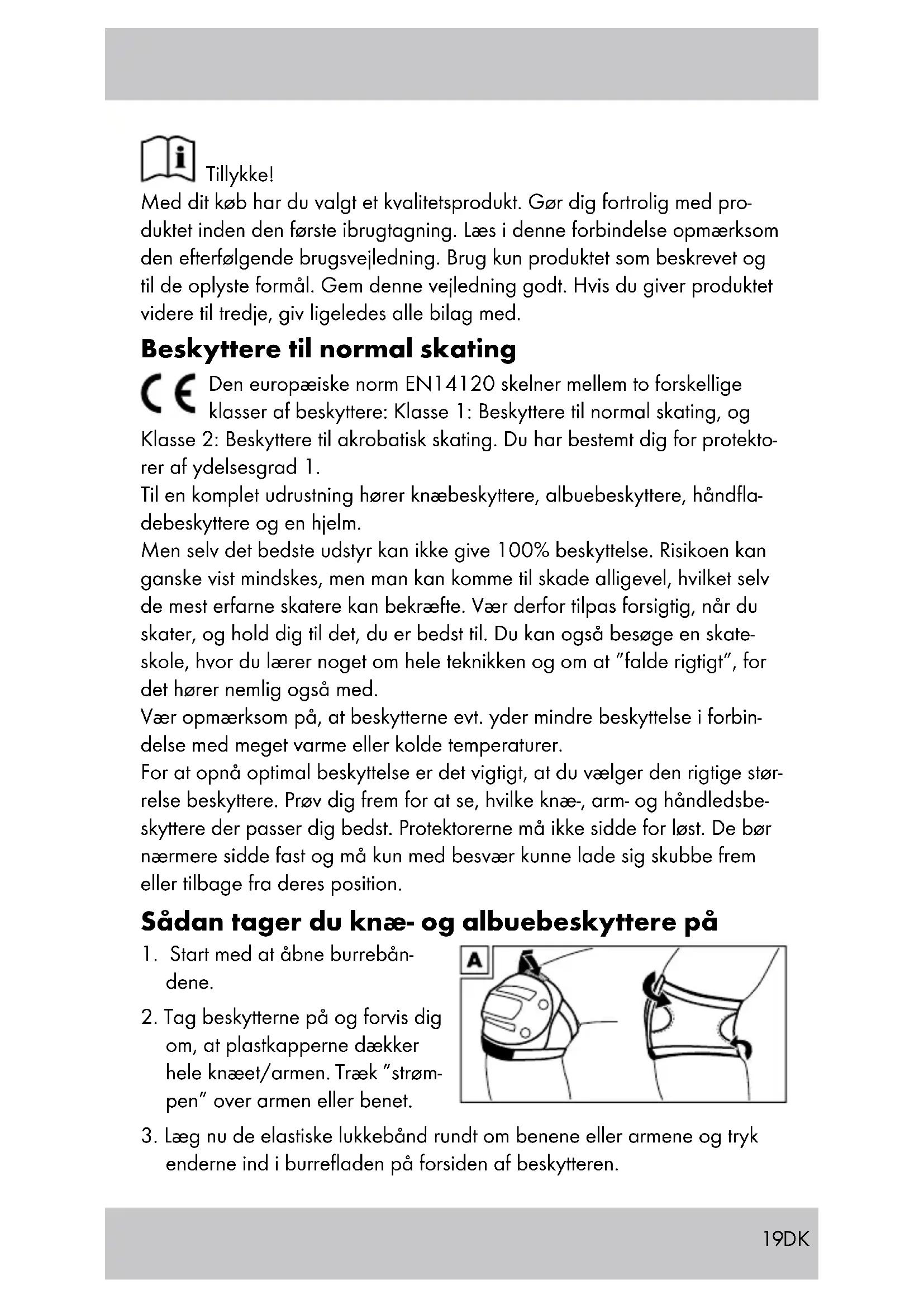 Wragekamp 6, D-22397 Hamburg Tillverkningsår: 2015 EU utfallsprov enligt EN 14120:2003 + A1:2007 Nivå 1 (protektorer för normala sportrullar) Nivå A (protektorer för användare under 25 kg kroppsvikt) för 3-7 år (100 -130 cm) Nivå B (skydd för användare med en kroppsvikt på 25-50 kg) för 8-12 år (130 -160 cm) Kontrollerad av TÜV Rheinland LGA Products GmbH Tillystr. 2, D-90431 Nürnberg, Germany Meddelandenummer 019719DK Tillykke! Med dit køb har du valgt et kvalitetsprodukt. Gør dig fortrolig med pro- duktet inden den første ibrugtagning. Læs i denne forbindelse opmærksom den efterfølgende brugsvejledning. Brug kun produktet som beskrevet og til de oplyste formål. Gem denne vejledning godt. Hvis du giver produktet videre til tredje, giv ligeledes alle bilag med. Beskyttere til normal skating Den europæiske norm EN14120 skelner mellem to forskellige klasser af beskyttere: Klasse 1: Beskyttere til normal skating, og Klasse2: Beskyttere til akrobatisk skating. Du har bestemt dig for protekto- rer af ydelsesgrad 1. Til en komplet udrustning hører knæbeskyttere, albuebeskyttere, håndfla- debeskyttere og en hjelm. Men selv det bedste udstyr kan ikke give 100% beskyttelse. Risikoen kan ganske vist mindskes, men man kan komme til skade alligevel, hvilket selv de mest erfarne skatere kan bekræfte. Vær derfor tilpas forsigtig, når du skater, og hold dig til det, du er bedst til. Du kan også besøge en skate- skole, hvor du lærer noget om hele teknikken og om at ”falde rigtigt”, for det hører nemlig også med. Vær opmærksom på, at beskytterne evt. yder mindre beskyttelse i forbin- delse med meget varme eller kolde temperaturer. For at opnå optimal beskyttelse er det vigtigt, at du vælger den rigtige stør- relse beskyttere. Prøv dig frem for at se, hvilke knæ-, arm- og håndledsbe- skyttere der passer dig bedst. Protektorerne må ikke sidde for løst. De bør nærmere sidde fast og må kun med besvær kunne lade sig skubbe frem eller tilbage fra deres position. Sådan tager du knæ- og albuebeskyttere på