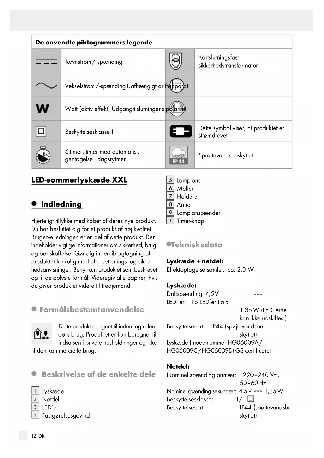 Timer-knap Tekniske data Lyskæde + netdel: Effektoptagelse samlet: ca. 2,0 W Lyskæde: Driftspænding: 4,5 V LED´er: 15 LED‘er i alt: 1,35 W (LED´erne kan ikke udskiftes.) Beskyttelsesart: IP44 (spøjtevandsbe- skyttet) Lyskæde (modelnummer HG06009A / HG06009C / HG06009D