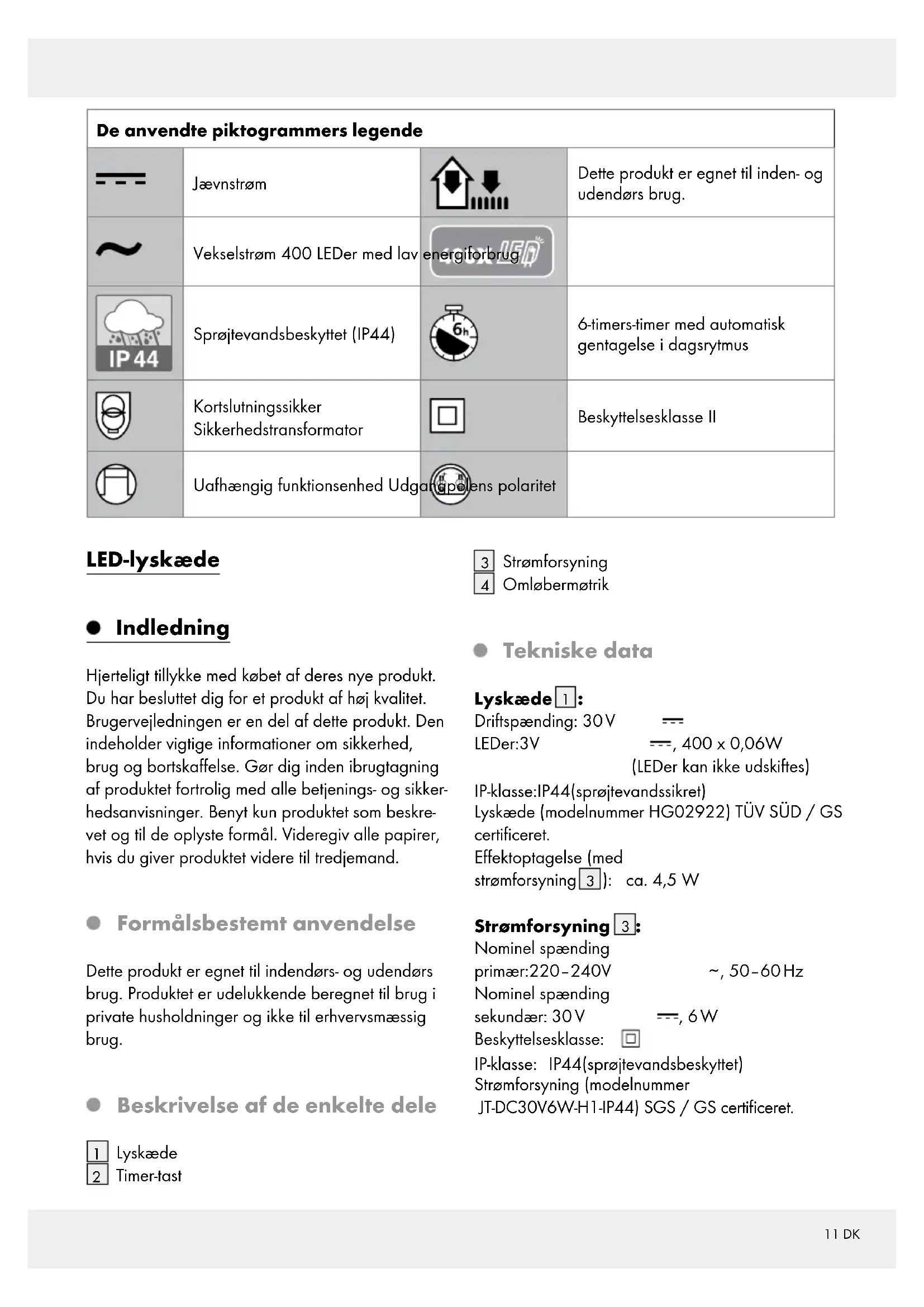 , 50–60 Hz Nominel spænding sekundær: 30 V , 6 W Beskyttelsesklasse: IP-klasse: IP44 (sprøjtevandsbeskyttet) Strømforsyning (modelnummer JT-DC30V6W-H1-IP44) SGS / GS certificeret.12 DK Leverede dele 1 lyskæde 1 strømforsyning 1 betjeningsvejledning Sikkerhedshenvisninger GØR DIG FORTROLIG MED ALLE BETJENINGS-