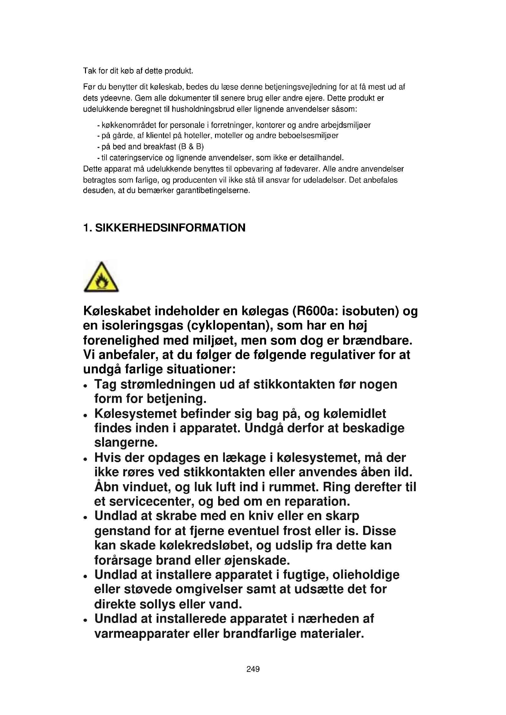 Køleskabet indeholder en kølegas (R600a: isobuten) og en isoleringsgas (cyklopentan), som har en høj forenelighed med miljøet, men som dog er brændbare. Vi anbefaler, at du følger de følgende regulativer for at undgå farlige situationer: