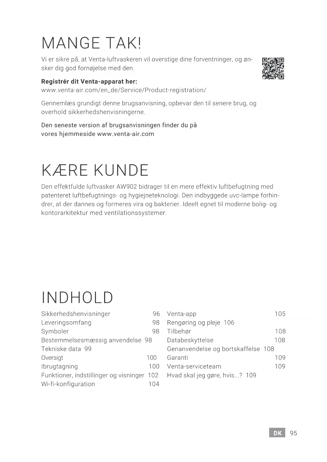Si es preciso, actualice el sistema operativo de su teléfono móvil o tableta.95DE 95DK Sikkerhedshenvisninger 96 Leveringsomfang 98 Symboler 98 Bestemmelsesmæssig anvendelse 98 Tekniske data 99 Oversigt 100 Ibrugtagning 100 Funktioner, indstillinger og visninger 102 Wi-fi-konfiguration 104 Venta-app 105 Rengøring og pleje 106 Tilbehør 108 Databeskyttelse 108 Genanvendelse og bortskaffelse 108 Garanti 109 Venta-serviceteam 109 Hvad skal jeg gøre, hvis...? 109 MANGE TAK! Vi er sikre på, at Venta-luftvaskeren vil overstige dine forventninger, og øn- sker dig god fornøjelse med den. Registrér dit Venta-apparat her: www.venta-air.com/en_de/Service/Product-registration/ Gennemlæs grundigt denne brugsanvisning, opbevar den til senere brug, og overhold sikkerhedshenvisningerne. Den seneste version af brugsanvisningen finder du på vores hjemmeside www.venta-air.com