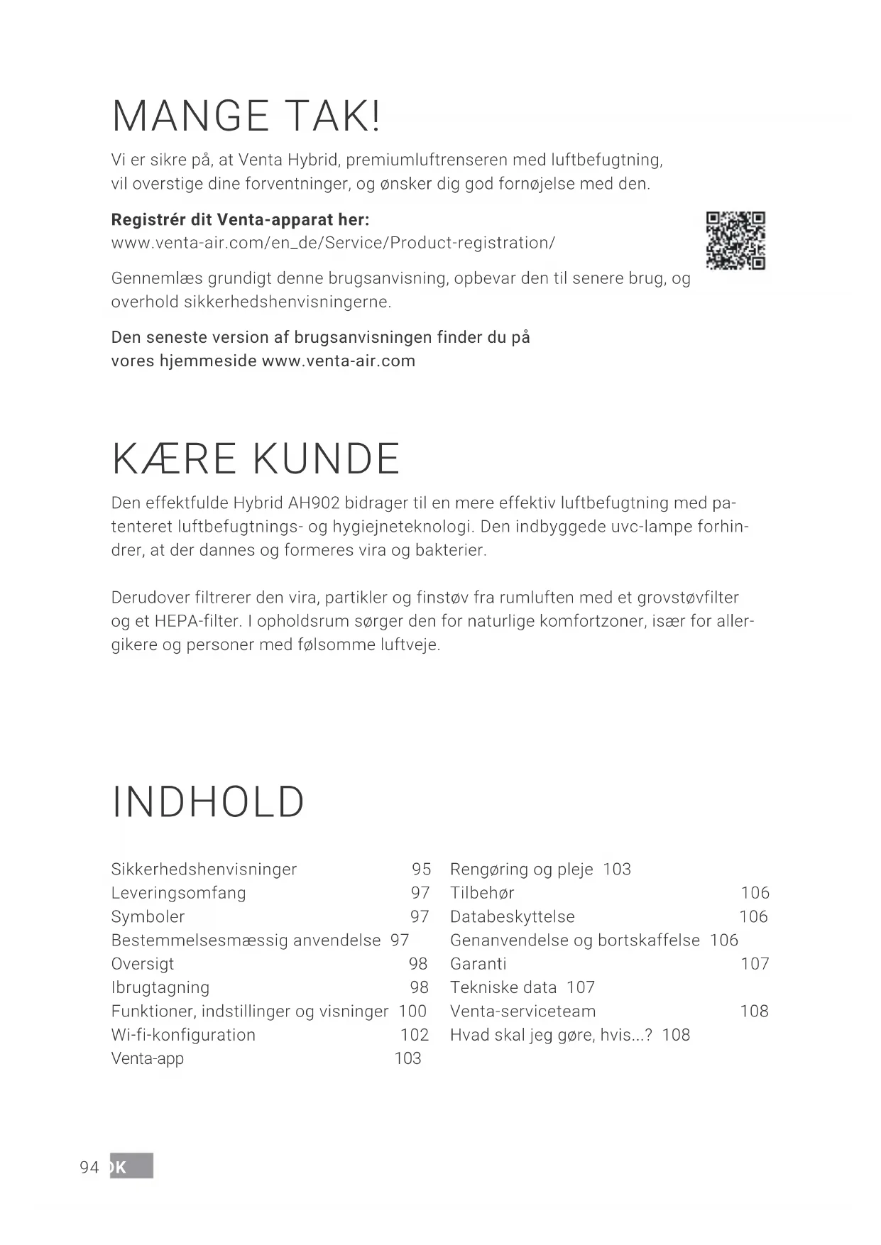 Werk indien nodig het besturingssysteem van uw smartphone of tablet bij.94 DK MANGE TAK! Vi er sikre på, at Venta Hybrid, premiumluftrenseren med luftbefugtning, vil overstige dine forventninger, og ønsker dig god fornøjelse med den. Registrér dit Venta-apparat her: www.venta-air.com/en_de/Service/Product-registration/ Gennemlæs grundigt denne brugsanvisning, opbevar den til senere brug, og overhold sikkerhedshenvisningerne. Den seneste version af brugsanvisningen finder du på vores hjemmeside www.venta-air.com