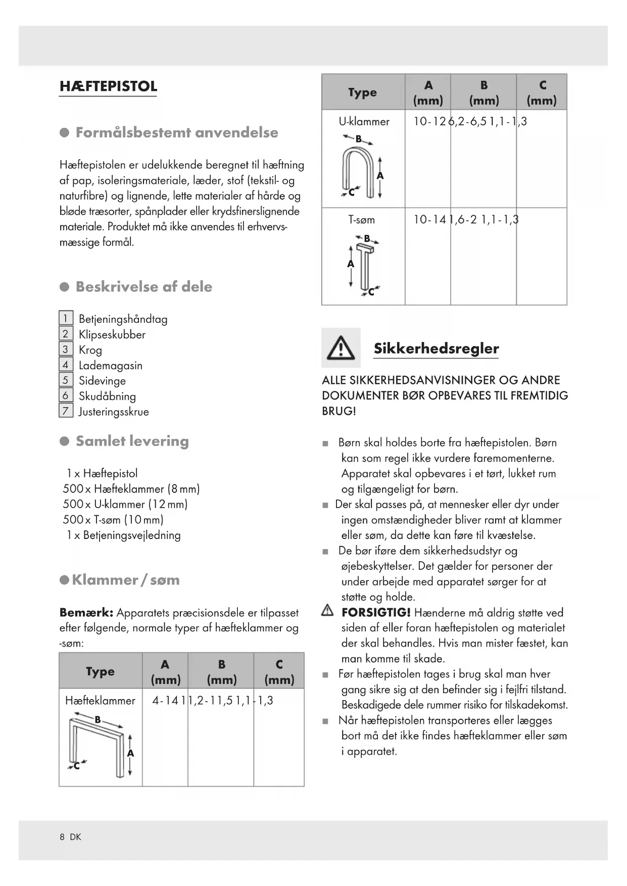 BRUG! J Børn skal holdes borte fra hæftepistolen. Børn kan som regel ikke vurdere faremomenterne. Apparatet skal opbevares i et tørt, lukket rum og tilgængeligt for børn. J Der skal passes på, at mennesker eller dyr under ingen omstændigheder bliver ramt at klammer eller søm, da dette kan føre til kvæstelse. J De bør iføre dem sikkerhedsudstyr og øjebeskyttelser. Det gælder for personer der under arbejde med apparatet sørger for at støtte og holde. FORSIGTIG! Hænderne må aldrig støtte ved siden af eller foran hæftepistolen og materialet der skal behandles. Hvis man mister fæstet, kan man komme til skade. J Før hæftepistolen tages i brug skal man hver gang sikre sig at den befinder sig i fejlfri tilstand. Beskadigede dele rummer risiko for tilskadekomst. J Når hæftepistolen transporteres eller lægges bort må det ikke findes hæfteklammer eller søm i apparatet.9 DK