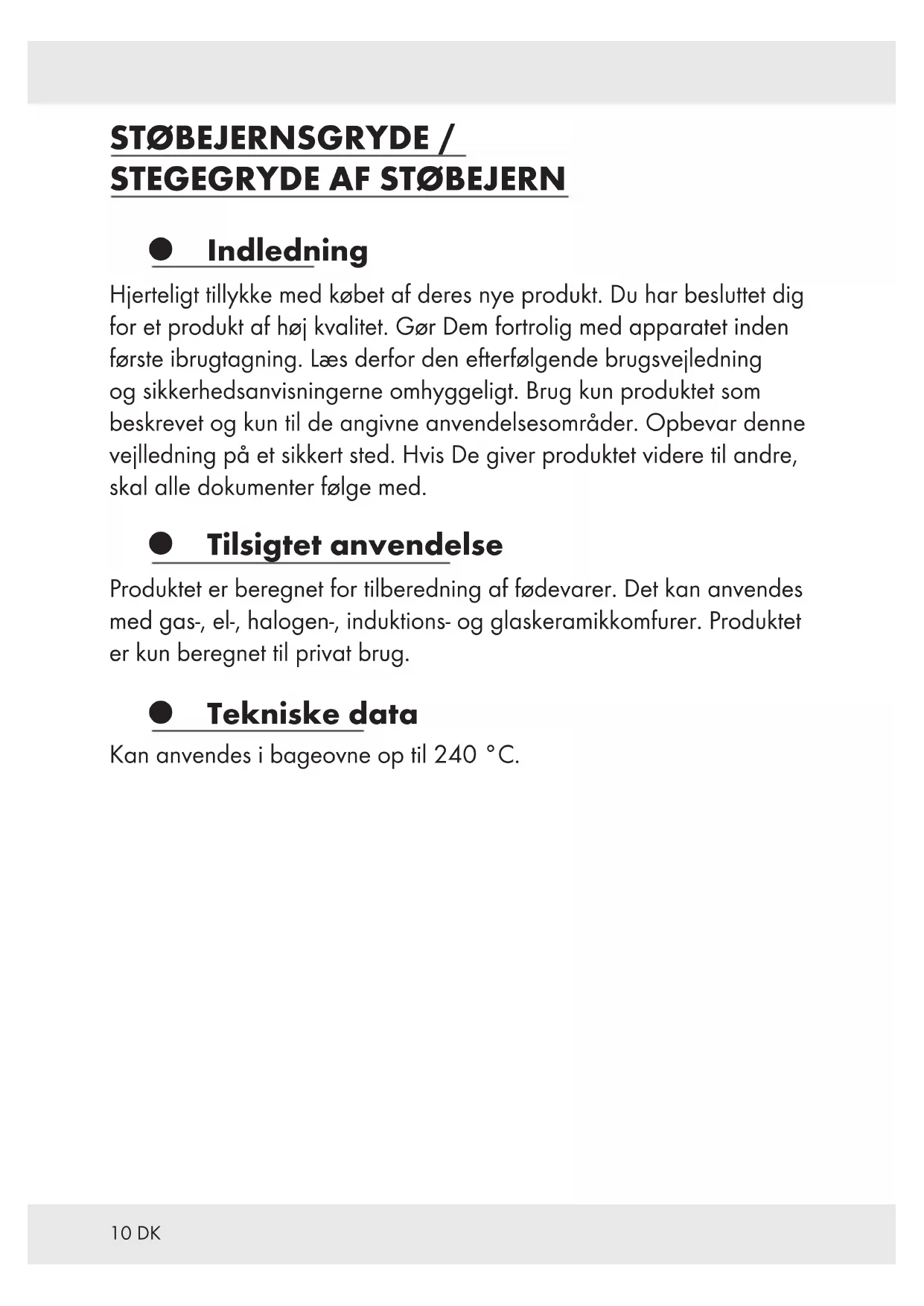 Indledning Hjerteligt tillykke med købet af deres nye produkt. Du har besluttet dig for et produkt af høj kvalitet. Gør Dem fortrolig med apparatet inden første ibrugtagning. Læs derfor den efterfølgende brugsvejledning og sikkerhedsanvisningerne omhyggeligt. Brug kun produktet som beskrevet og kun til de angivne anvendelsesområder. Opbevar denne vejlledning på et sikkert sted. Hvis De giver produktet videre til andre, skal alle dokumenter følge med. Tilsigtet anvendelse Produktet er beregnet for tilberedning af fødevarer. Det kan anvendes med gas-, el-, halogen-, induktions- og glaskeramikkomfurer. Produktet er kun beregnet til privat brug. Tekniske data Kan anvendes i bageovne op til 240 °C.11DK Sikkerhedsvejledninger