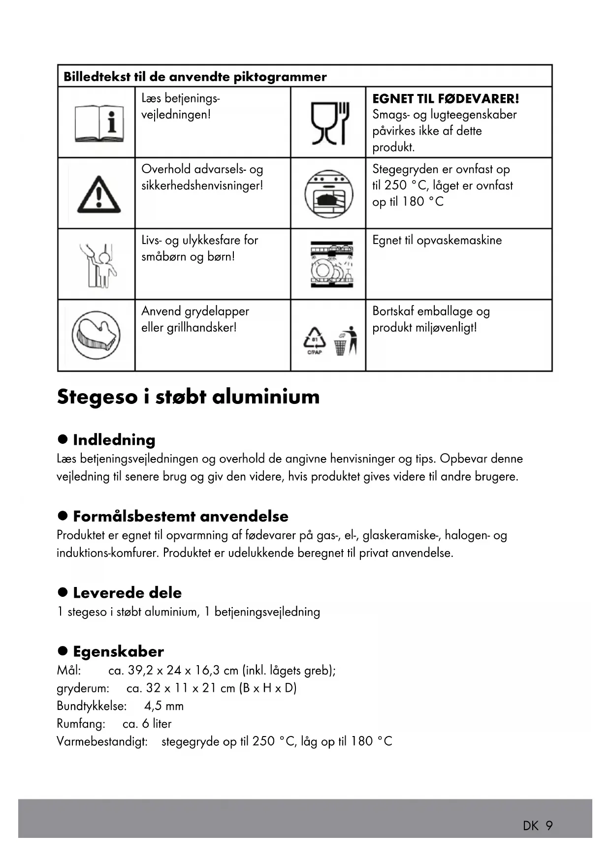 Entsorgung Die Verpackung besteht aus umweltfreundlichen Materialien, die Sie über die örtlichen Recyc- lingstellen entsorgen können. Möglichkeiten zur Entsorgung des ausgedienten Produkts erfahren Sie bei Ihrer Gemeinde oder Stadtverwaltung. 8 DE/AT/CHBilledtekst til de anvendte piktogrammer Læs betjenings- vejledningen! EGNET TIL FØDEVARER! Smags- og lugteegenskaber påvirkes ikke af dette produkt. Overhold advarsels- og sikkerhedshenvisninger! Stegegryden er ovnfast op til 250 °C, låget er ovnfast op til 180 °C Livs- og ulykkesfare for småbørn og børn! Egnet til opvaskemaskine Anvend grydelapper eller grillhandsker! Bortskaf emballage og produkt miljøvenligt! Stegeso i støbt aluminium l Indledning Læs betjeningsvejledningen og overhold de angivne henvisninger og tips. Opbevar denne vejledning til senere brug og giv den videre, hvis produktet gives videre til andre brugere. l Formålsbestemt anvendelse Produktet er egnet til opvarmning af fødevarer på gas-, el-, glaskeramiske-, halogen- og induktions-komfurer. Produktet er udelukkende beregnet til privat anvendelse. l Leverede dele 1 stegeso i støbt aluminium, 1 betjeningsvejledning l Egenskaber Mål: ca. 39,2 x 24 x 16,3 cm (inkl. lågets greb); gryderum: ca. 32 x 11 x 21 cm (B x H x D) Bundtykkelse: 4,5 mm Rumfang: ca. 6 liter Varmebestandigt: stegegryde op til 250 °C, låg op til 180 °C DK 9Egnet til følgende omgivelser: Gaskomfur Induktion El-komfur Halogen kogeplade Glaskeramisk kogeplade