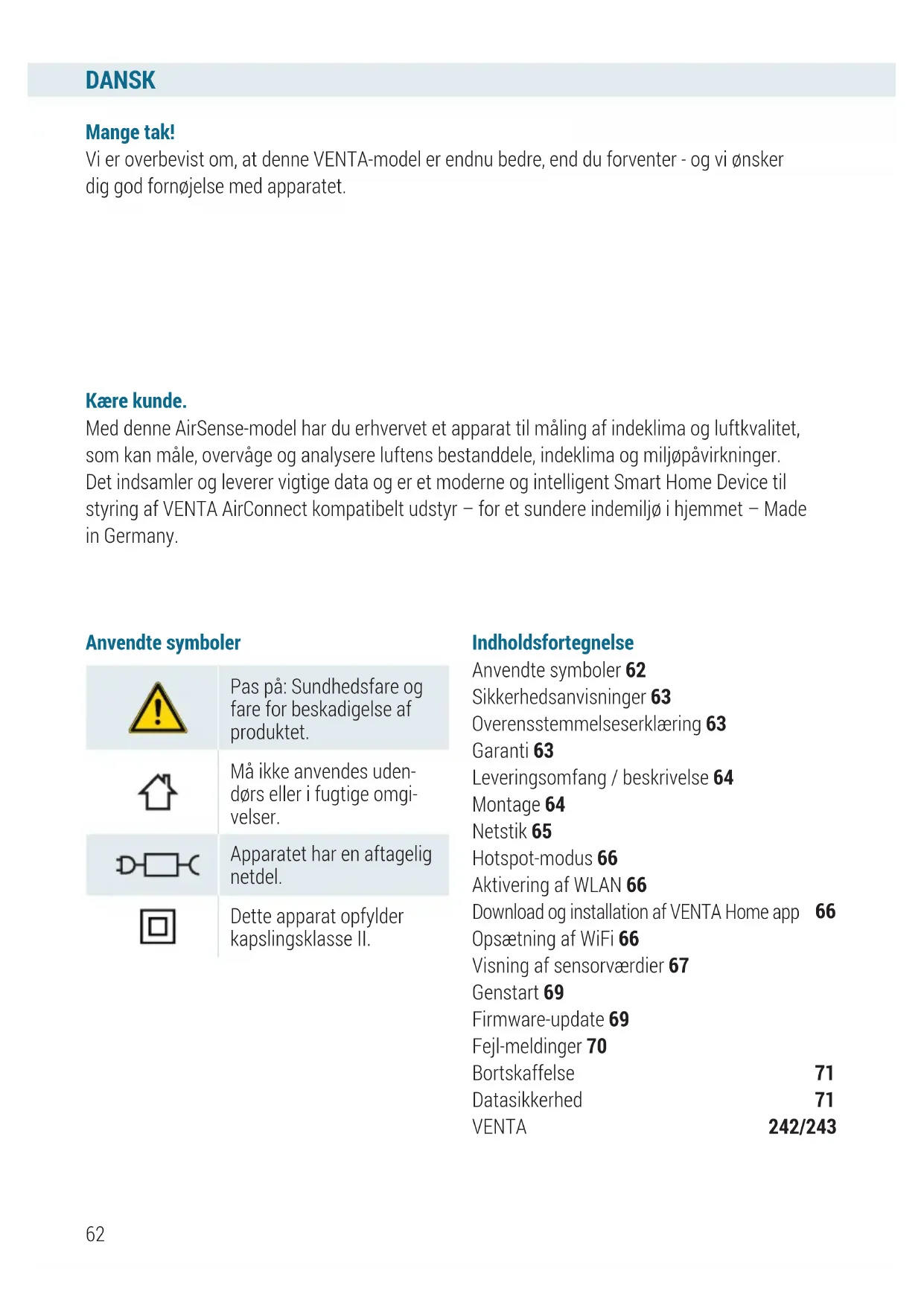 Anvendte symboler Mange tak! Vi er overbevist om, at denne VENTA-model er endnu bedre, end du forventer - og vi ønsker dig god fornøjelse med apparatet. Kære kunde. Med denne AirSense-model har du erhvervet et apparat til måling af indeklima og luftkvalitet, som kan måle, overvåge og analysere luftens bestanddele, indeklima og miljøpåvirkninger. Det indsamler og leverer vigtige data og er et moderne og intelligent Smart Home Device til styring af VENTA AirConnect kompatibelt udstyr – for et sundere indemiljø i hjemmet – Made in Germany. Pas på: Sundhedsfare og fare for beskadigelse af produktet. Må ikke anvendes uden- dørs eller i fugtige omgi- velser. Apparatet har en aftagelig netdel. Dette apparat opfylder kapslingsklasse II. Indholdsfortegnelse Anvendte symboler 62 Sikkerhedsanvisninger 63 Overensstemmelseserklæring 63 Garanti 63 Leveringsomfang / beskrivelse 64 Montage 64 Netstik 65 Hotspot-modus 66 Aktivering af WLAN 66 Download og installation af VENTA Home app