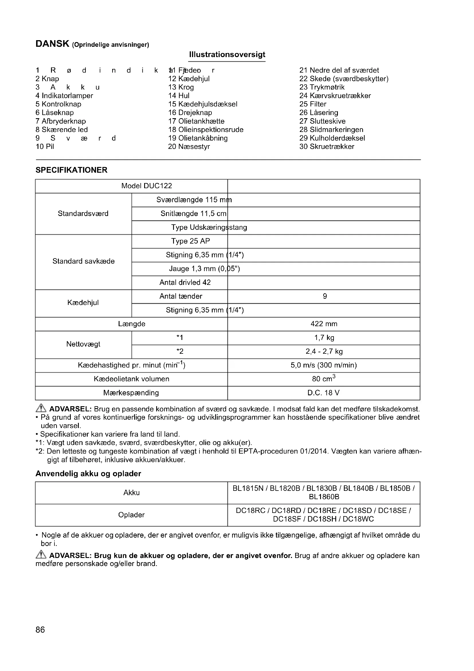 Apenas para os países europeus As Declarações de conformidade estão incluídas no Anexo A deste manual de instruções.86 DANSK (Oprindelige anvisninger) Illustrationsoversigt 1Rød indikator 2 Knap 3Akku 4 Indikatorlamper 5 Kontrolknap 6 Låseknap 7 Afbryderknap 8 Skærende led 9Sværd 10 Pil 11 Fjeder 12 Kædehjul 13 Krog 14 Hul 15 Kædehjulsdæksel 16 Drejeknap 17 Olietankhætte 18 Olieinspektionsrude 19 Olietankåbning 20 Næsestyr 21 Nedre del af sværdet 22 Skede (sværdbeskytter) 23 Trykmøtrik 24 Kærvskruetrækker 25 Filter 26 Låsering 27 Slutteskive 28 Slidmarkeringen 29 Kulholderdæksel 30 Skruetrækker SPECIFIKATIONER ADVARSEL: Brug en passende kombination af sværd og savkæde. I modsat fald kan det medføre tilskadekomst.