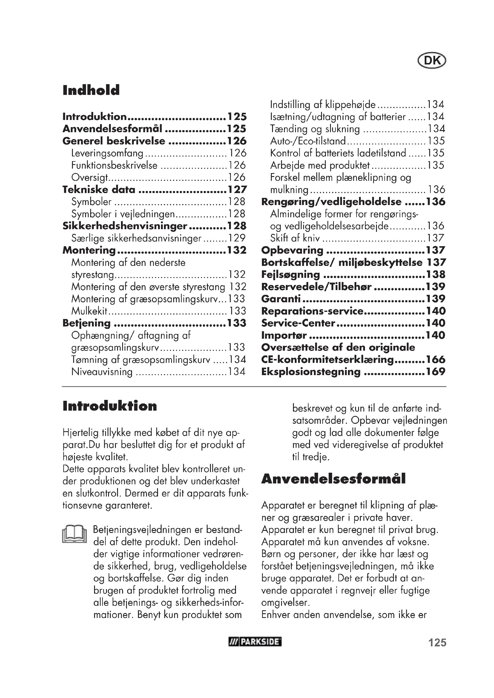 - Importør beskrevet og kun til de anførte ind- satsområder. Opbevar vejledningen godt og lad alle dokumenter følge med ved videregivelse af produktet til tredje. Anvendelsesformål Apparatet er beregnet til klipning af plæ- ner og græsarealer i private haver. Apparatet er kun beregnet til privat brug. Apparatet må kun anvendes af voksne. Børn og personer, der ikke har læst og forstået betjeningsvejledningen, må ikke bruge apparatet. Det er forbudt at an- vende apparatet i regnvejr eller fugtige omgivelser. Enhver anden anvendelse, som ikke er126 p. 140
