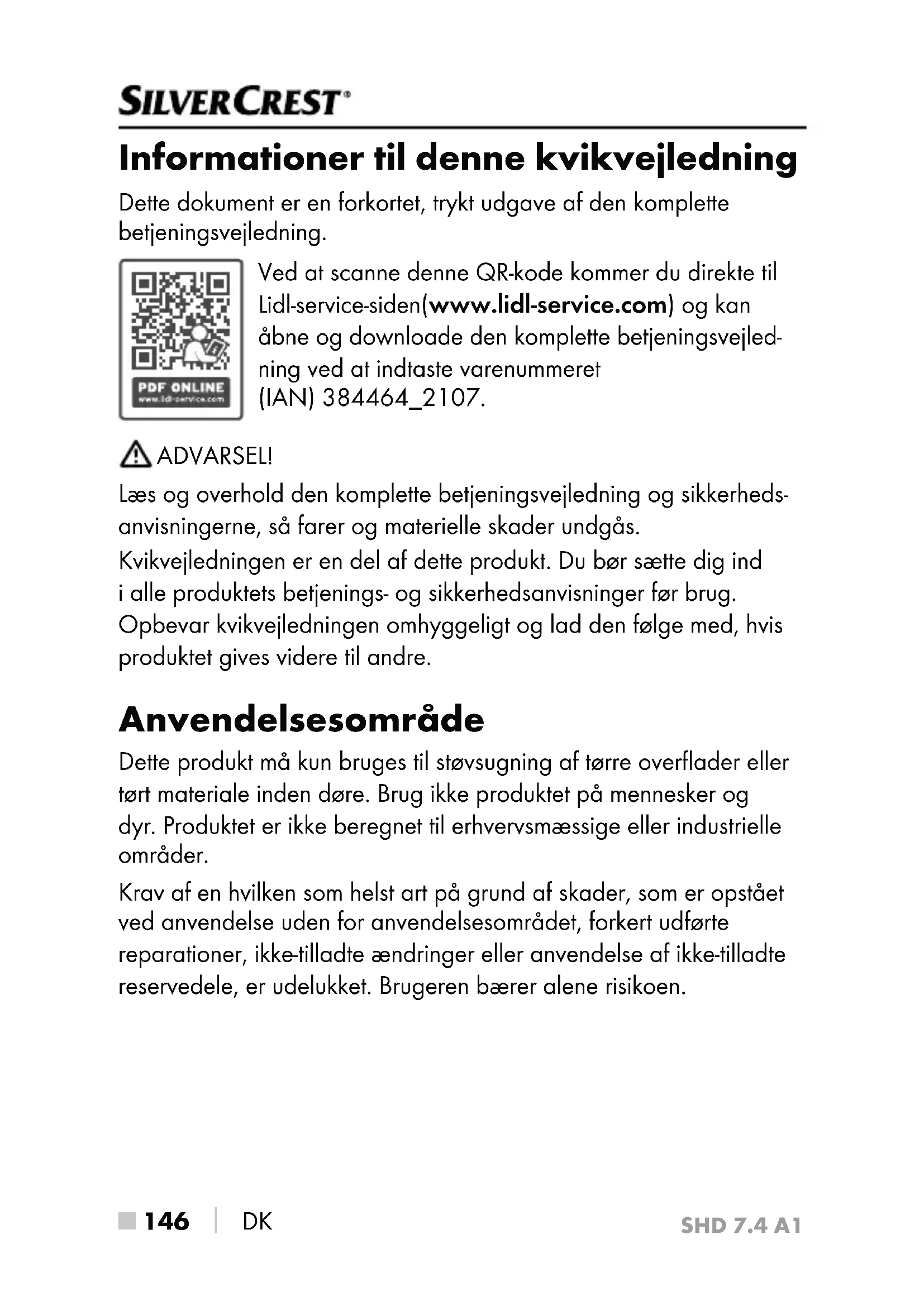 DK Informationer til denne kvikvejledning Dette dokument er en forkortet, trykt udgave af den komplette betjeningsvejledning. Ved at scanne denne QR-kode kommer du direkte til Lidl-service-siden (www.lidl-service.com) og kan åbne og downloade den komplette betjeningsvejled- ning ved at indtaste varenummeret (IAN) 384464_2107. ADVARSEL! Læs og overhold den komplette betjeningsvejledning og sikkerheds- anvisningerne, så farer og materielle skader undgås. Kvikvejledningen er en del af dette produkt. Du bør sætte dig ind i alle produktets betjenings- og sikkerhedsanvisninger før brug. Opbevar kvikvejledningen omhyggeligt og lad den følge med, hvis produktet gives videre til andre. Anvendelsesområde Dette produkt må kun bruges til støvsugning af tørre overflader eller tørt materiale inden døre. Brug ikke produktet på mennesker og dyr