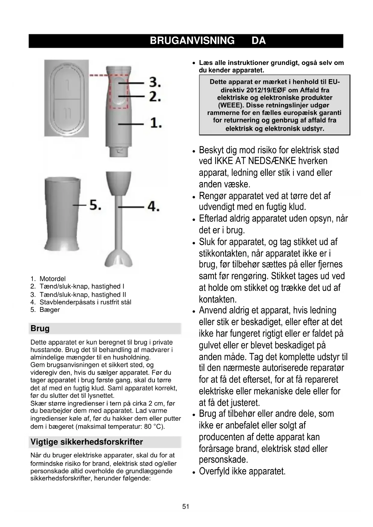 Brug Dette apparatet er kun beregnet til brug i private husstande. Brug det til behandling af madvarer i almindelige mængder til en husholdning. Gem brugsanvisningen et sikkert sted, og videregiv den, hvis du sælger apparatet. Før du tager apparatet i brug første gang, skal du tørre det af med en fugtig klud. Saml apparatet korrekt, før du slutter det til lysnettet. Skær større ingredienser i tern på cirka 2 cm, før du bearbejder dem med apparatet. Lad varme ingredienser køle af, før du hakker dem eller putter dem i bægeret (maksimal temperatur: 80 °C). Vigtige sikkerhedsforskrifter Når du bruger elektriske apparater, skal du for at formindske risiko for brand, elektrisk stød og/eller personskade altid overholde de grundlæggende sikkerhedsforskrifter, herunder følgende: