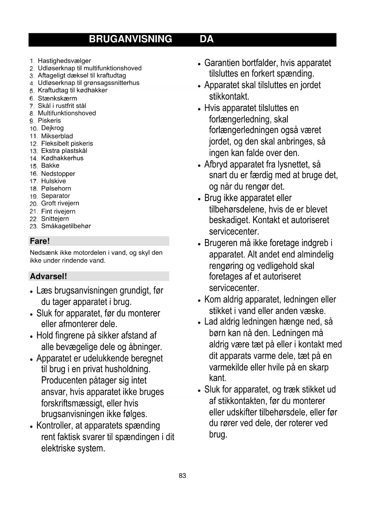 CET APPAREIL ! Nous nous réservons le droit de procéder sans préavis à toute modification utile.83 BRUGANVISNING DA Hastighedsvælger Udløserknap til multifunktionshoved Aftageligt dæksel til kraftudtag Udløserknap til grønsagssnitterhus Kraftudtag til kødhakker Stænkskærm Skål i rustfrit stål Multifunktionshoved Piskeris Dejkrog Mikserblad Fleksibelt piskeris Ekstra plastskål Kødhakkerhus Bakke Nedstopper Hulskive Pølsehorn Separator Groft rivejern Fint rivejern Snittejern Småkagetilbehør Fare! Nedsænk ikke motordelen i vand, og skyl den ikke under rindende vand. Advarsel!
