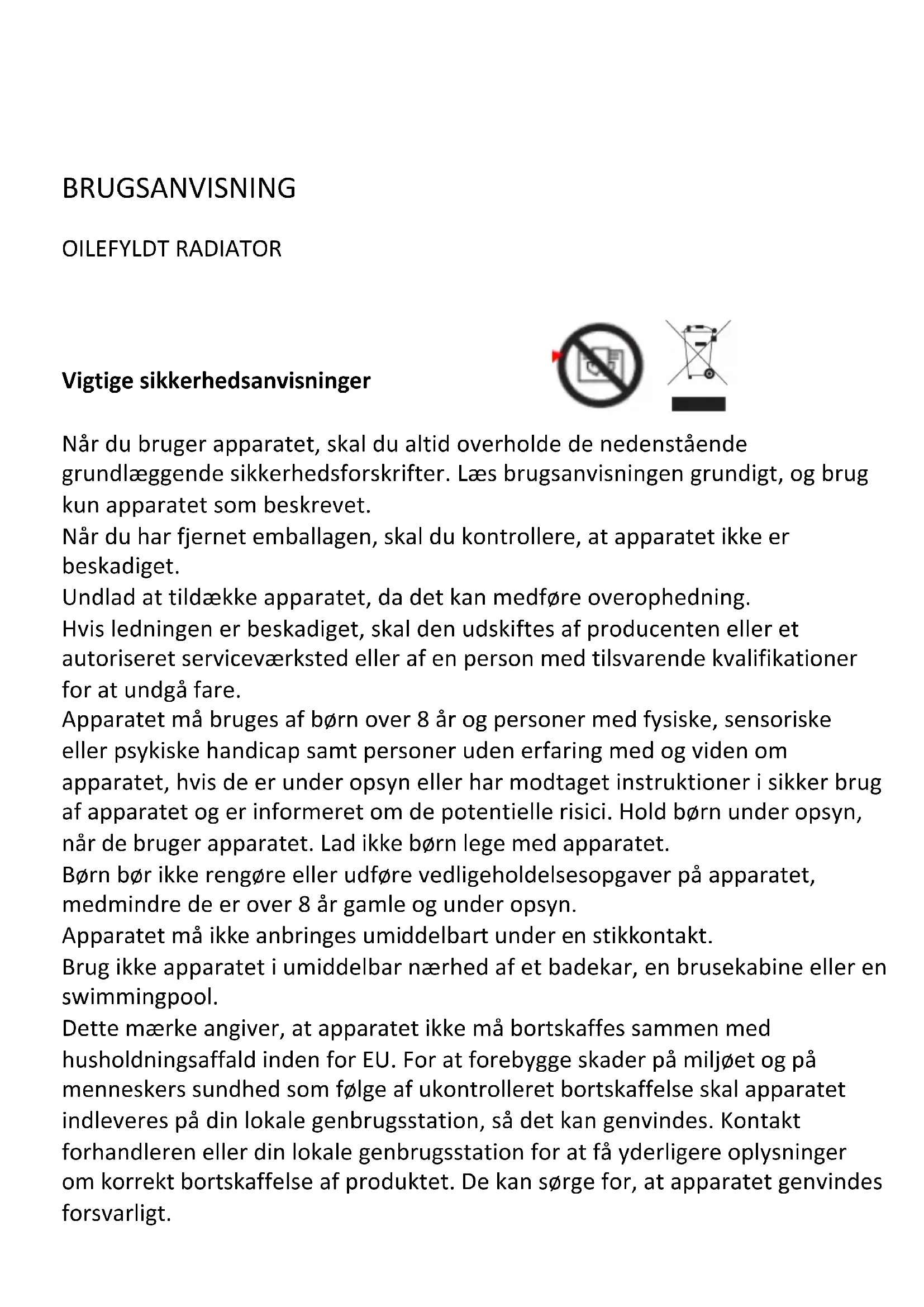 ORENJE ЖЕЛАЕТ, ЧТОБЫ ПОЛЬЗОВАНИЕ ПРИБОРОМ ДОСТАВИЛО ВАМ УДОВОЛЬСТВИЕ!BRUGSANVISNING OILEFYLDT RADIATOR Vigtige sikkerhedsanvisninger Når du bruger apparatet, skal du altid overholde de nedenstående grundlæggende sikkerhedsforskrifter. Læs brugsanvisningen grundigt, og brug kun apparatet som beskrevet. Når du har fjernet emballagen, skal du kontrollere, at apparatet ikke er beskadiget. Undlad at tildække apparatet, da det kan medføre overophedning. Hvis ledningen er beskadiget, skal den udskiftes af producenten eller et autoriseret serviceværksted eller af en person med tilsvarende kvalifikationer for at undgå fare. Apparatet må bruges af børn over 8 år og personer med fysiske, sensoriske eller psykiske handicap samt personer uden erfaring med og viden om apparatet, hvis de er under opsyn eller har modtaget instruktioner i sikker brug af apparatet og er informeret om de potentielle risici. Hold børn under opsyn, når de bruger apparatet. Lad ikke børn lege med apparatet. Børn bør ikke rengøre eller udføre vedligeholdelsesopgaver på apparatet, medmindre de er over 8 år gamle og under opsyn. Apparatet må ikke anbringes umiddelbart under en stikkontakt. Brug ikke apparatet i umiddelbar nærhed af et badekar, en brusekabine eller en swimmingpool. Dette mærke angiver, at apparatet ikke må bortskaffes sammen med husholdningsaffald inden for EU. For at forebygge skader på miljøet og på menneskers sundhed som følge af ukontrolleret bortskaffelse skal apparatet indleveres på din lokale genbrugsstation, så det kan genvindes. Kontakt forhandleren eller din lokale genbrugsstation for at få yderligere oplysninger om korrekt bortskaffelse af produktet. De kan sørge for, at apparatet genvindes forsvarligt.Apparatet kan ikke fuldstændigt styre den omgivende temperatur og er derfor ikke egnet som varmekilde til brug i lokaler med temperaturfølsomme genstande, dyr eller planter. Apparatet er påfyldt en nøjagtig mængde specialolie. Reparationer af oliekredsløbet må kun foretages af producenten eller dennes servicepartnere, som også skal kontaktes i forbindelse med eventuel olielækage. Apparatet skal bortskaffes i henhold til reglerne om bortskaffelse af olie. Apparatet kan ikke fuldstændigt styre den omgivende temperatur og er derfor ikke egnet som varmekilde til brug i lokaler med temperaturfølsomme genstande, dyr eller planter. Apparatet er udelukkende beregnet til brug i private husholdninger. Forsigtig Det kan medføre brandfare, hvis apparatet tildækkes eller anbringes tæt på gardiner eller andre brændbare genstande. Visse dele af apparatet kan blive meget varme og forårsage forbrænding ved berøring. Vær især påpasselig, hvis apparatet bruges i nærheden af børn eller svagelige personer.OVERSIGT (OR2000M) Ribber Tænd/sluk-knap Termostatknap Ledningsoprul Hjul BRUG (OR2000M)