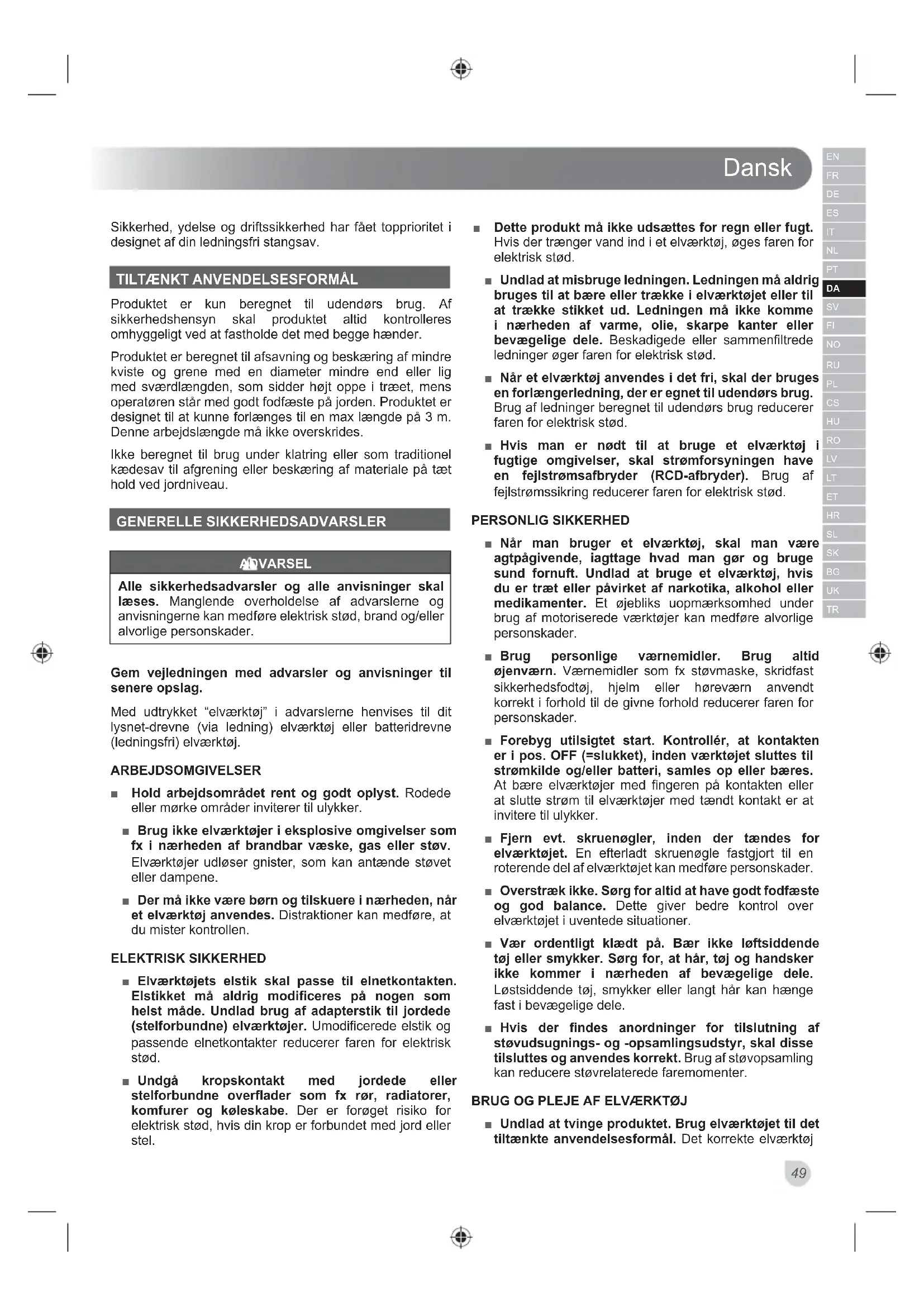 Produktet er kun beregnet til udendørs brug. Af sikkerhedshensyn skal produktet altid kontrolleres omhyggeligt ved at fastholde det med begge hænder. Produktet er beregnet til afsavning og beskæring af mindre kviste og grene med en diameter mindre end eller lig med sværdlængden, som sidder højt oppe i træet, mens operatøren står med godt fodfæste på jorden. Produktet er designet til at kunne forlænges til en max længde på 3 m. Denne arbejdslængde må ikke overskrides. Ikke beregnet til brug under klatring eller som traditionel kædesav til afgrening eller beskæring af materiale på tæt hold ved jordniveau. GENERELLE SIKKERHEDSADVARSLER ADVARSEL Alle sikkerhedsadvarsler og alle anvisninger skal læses. Manglende overholdelse af advarslerne og anvisningerne kan medføre elektrisk stød, brand og/eller alvorlige personskader. Gem vejledningen med advarsler og anvisninger til senere opslag. Med udtrykket “elværktøj” i advarslerne henvises til dit lysnet-drevne (via ledning) elværktøj eller batteridrevne (ledningsfri) elværktøj. ARBEJDSOMGIVELSER ■ Hold arbejdsområdet rent og godt oplyst. Rodede eller mørke områder inviterer til ulykker. ■ Brug ikke elværktøjer i eksplosive omgivelser som fx i nærheden af brandbar væske, gas eller støv. Elværktøjer udløser gnister, som kan antænde støvet eller dampene. ■ Der må ikke være børn og tilskuere i nærheden, når et elværktøj anvendes. Distraktioner kan medføre, at du mister kontrollen. ELEKTRISK SIKKERHED ■ Elværktøjets elstik skal passe til elnetkontakten. Elstikket må aldrig modificeres på nogen som helst måde. Undlad brug af adapterstik til jordede (stelforbundne) elværktøjer. Umodificerede elstik og passende elnetkontakter reducerer faren for elektrisk stød. ■ Undgå kropskontakt med jordede eller stelforbundne overflader som fx rør, radiatorer, komfurer og køleskabe. Der er forøget risiko for elektrisk stød, hvis din krop er forbundet med jord eller stel. ■ Dette produkt må ikke udsættes for regn eller fugt. Hvis der trænger vand ind i et elværktøj, øges faren for elektrisk stød. ■ Undlad at misbruge ledningen. Ledningen må aldrig bruges til at bære eller trække i elværktøjet eller til at trække stikket ud. Ledningen må ikke komme i nærheden af varme, olie, skarpe kanter eller bevægelige dele. Beskadigede eller sammenfiltrede ledninger øger faren for elektrisk stød. ■ Når et elværktøj anvendes i det fri, skal der bruges en forlængerledning, der er egnet til udendørs brug. Brug af ledninger beregnet til udendørs brug reducerer faren for elektrisk stød. ■ Hvis man er nødt til at bruge et elværktøj i fugtige omgivelser, skal strømforsyningen have en fejlstrømsafbryder (RCD-afbryder). Brug af fejlstrømssikring reducerer faren for elektrisk stød. PERSONLIG SIKKERHED ■ Når man bruger et elværktøj, skal man være agtpågivende, iagttage hvad man gør og bruge sund fornuft. Undlad at bruge et elværktøj, hvis du er træt eller påvirket af narkotika, alkohol eller medikamenter. Et øjebliks uopmærksomhed under brug af motoriserede værktøjer kan medføre alvorlige personskader. ■ Brug personlige værnemidler. Brug altid øjenværn. Værnemidler som fx støvmaske, skridfast sikkerhedsfodtøj, hjelm eller høreværn anvendt korrekt i forhold til de givne forhold reducerer faren for personskader. ■ Forebyg utilsigtet start. Kontrollér, at kontakten er i pos. OFF (=slukket), inden værktøjet sluttes til strømkilde og/eller batteri, samles op eller bæres. At bære elværktøjer med fingeren på kontakten eller at slutte strøm til elværktøjer med tændt kontakt er at invitere til ulykker. ■ Fjern evt. skruenøgler, inden der tændes for elværktøjet. En efterladt skruenøgle fastgjort til en roterende del af elværktøjet kan medføre personskader. ■ Overstræk ikke. Sørg for altid at have godt fodfæste og god balance. Dette giver bedre kontrol over elværktøjet i uventede situationer. ■ Vær ordentligt klædt på. Bær ikke løftsiddende tøj eller smykker. Sørg for, at hår, tøj og handsker ikke kommer i nærheden af bevægelige dele. Løstsiddende tøj, smykker eller langt hår kan hænge fast i bevægelige dele. ■ Hvis der findes anordninger for tilslutning af støvudsugnings- og -opsamlingsudstyr, skal disse tilsluttes og anvendes korrekt. Brug af støvopsamling kan reducere støvrelaterede faremomenter. BRUG OG PLEJE AF ELVÆRKTØJ ■ Undlad at tvinge produktet. Brug elværktøjet til det tiltænkte anvendelsesformål. Det korrekte elværktøjDansk