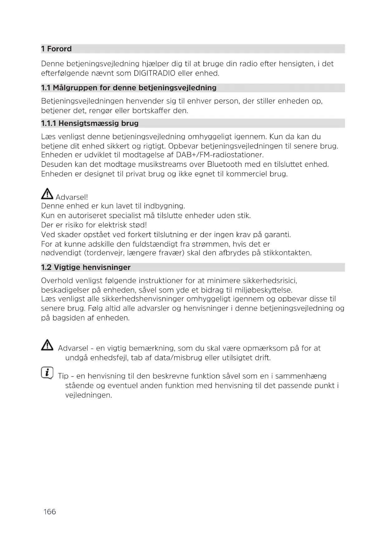 Overhold venligst følgende instruktioner for at minimere sikkerhedsrisici, beskadigelser på enheden, såvel som yde et bidrag til miljøbeskyelse. Læs venligst alle sikkerhedshenvisninger omhyggeligt igennem og opbevar disse til senere brug. Følg altid alle advarsler og henvisninger i denne betjeningsvejledning og påbagsiden af enheden. Advarsel - en vigtig bemærkning, som du skal være opmærksom på for at undgå enhedsfejl, tab af data/misbrug eller utilsigtet dri. Tip - en henvisning til den beskrevne funktion såvel som en i sammenhæng stående og eventuel anden funktion med henvisning til det passende punkt i vejledningen. 1661.2.1 Sikkerhed For din egen sikkerhed bør du læse sikkerhedsforanstaltningerne omhyggeligt igennem, inden du tager din DIGITRADIO UP1 i dri. Producenten fraskriver sig ethvert ansvar for skader, der måe opstå som følge afforkert håndtering eller tilsidesæelse af sikkerhedsanvisningerne. Denne enhed er kun lavet til indbygning. Kun en autoriseret specialist må tilslue enheder uden stik. Der er risiko for elektrisk stød! Ved skader opstået ved forkert tilslutning er der ingen krav på garanti. Åbn aldrig enheden! Det er livsfarligt at røre ved spændingsførende dele! Et eventuelt nødvendigt indgreb må kun udføres af faglærte personer. Enheden må kun betjenes i tempereret klima. Udsæt ikke enheden for dråbe- eller sprøjtevand. Hvis vand er trængt ind i enheden, skal du slukke for den og kontakte service Udsæt ikke enheden for varmekilder, der varmer enheden mere end ved normal brug. Ved synlige enhedsfejl, lugt- eller røgudvikling, fejlfunktioner eller beskadigelser på kabineet, så skal du slukke for enheden og kontakte service. Enheden må kun slues til en netspænding på 100V-240V~, 50/60Hz. Prøv aldrig at bruge enheden med en anden spænding. Hvis enheden udviser skader, må den ikke tages i brug.