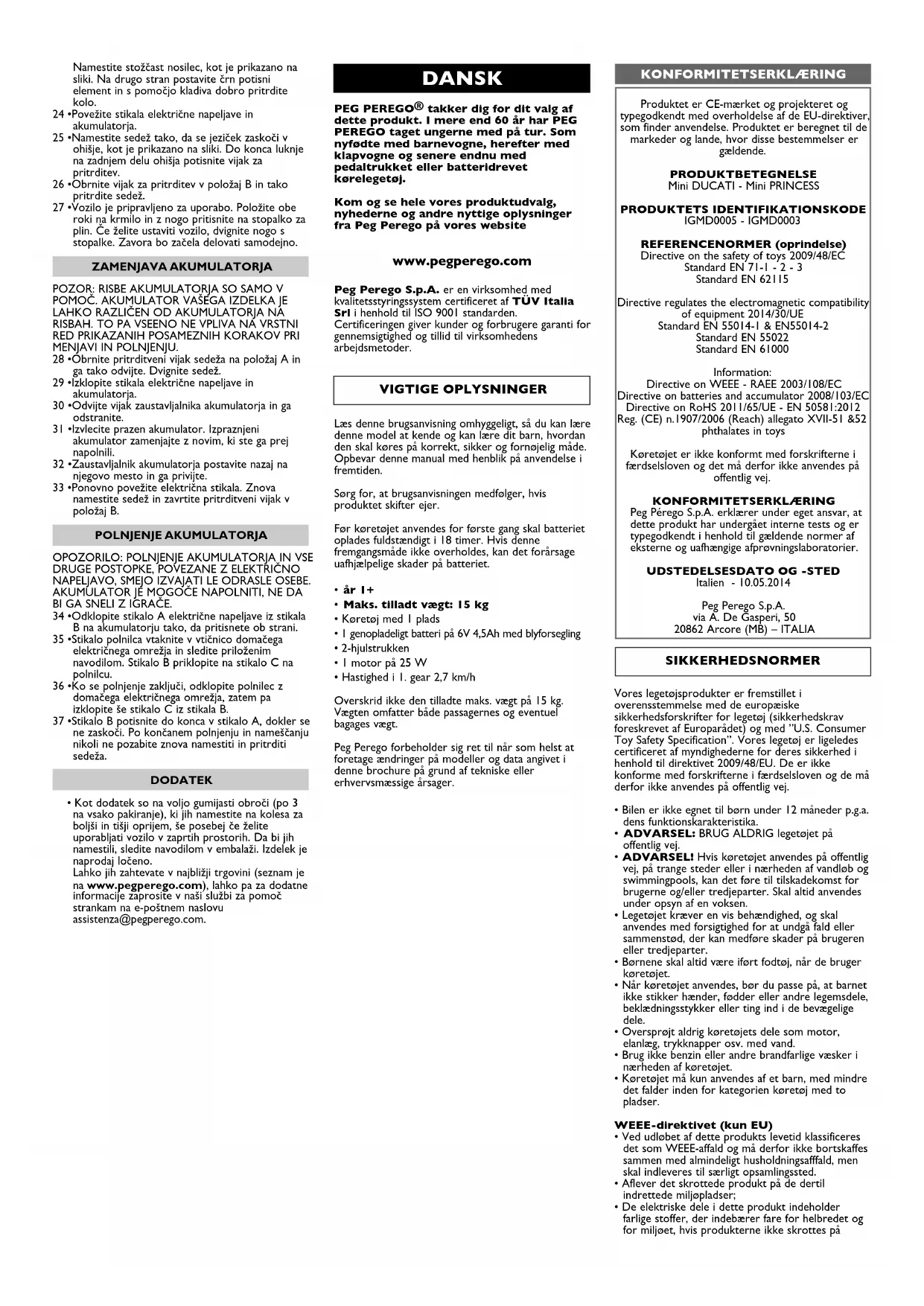 PEG PEREGO ponuja pomoč uporabnikom, ki so kupili izdelek, neposredno ali prek svoje mreže pooblaščenih centrov za pomoč uporabnikom, za morebitna popravila, zamenjave ali nakup originalnih rezervnih delov. Da bi lahko stopili v stik s centrom za pomoč uporabnikom, obiščite našo spletno stran http://www.pegperego.com Za vse pripombe morate imeti serijsko številko, ki ustreza izdelku. Da bi našli serijsko številko, glejte stran, na kateri so prikazani rezervni deli. POMOČ UPORABNIKOMLæs denne brugsanvisning omhyggeligt, så du kan lære denne model at kende og kan lære dit barn, hvordan den skal køres på korrekt, sikker og fornøjelig måde. Opbevar denne manual med henblik på anvendelse i fremtiden. Sørg for, at brugsanvisningen medfølger, hvis produktet skifter ejer. Før køretøjet anvendes for første gang skal batteriet oplades fuldstændigt i 18 timer. Hvis denne fremgangsmåde ikke overholdes, kan det forårsage uafhjælpelige skader på batteriet.