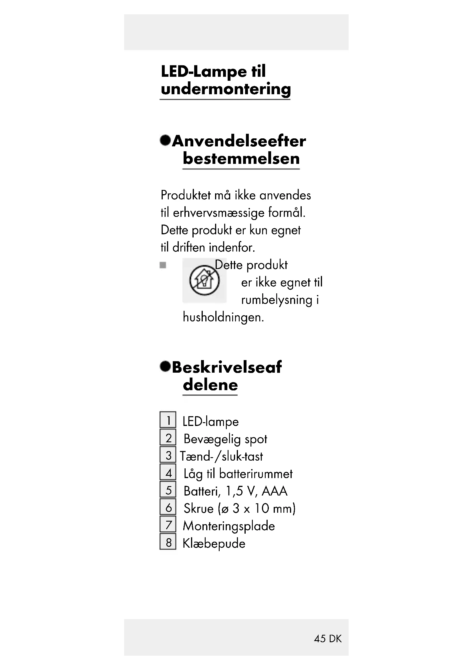 VENLIGST BRUGSANVIS- NINGEN OMHYGGELIGT! Kontroller produktet for beskadigelser, inden det tages i brug . Tag aldrig et beskadiget apparat i brug. Dette apparat kan bruges af børn fra 8 år og opad, samt af personer med forringede fysiske, følelses- mæssige eller mentale evner eller med mangel på erfa- ring og viden, når de er under opsyn eller iht. sikker brug af apparatet blev vej- ledt og forstod de derudaf resulterende farer. Børn må ikke lege med apparatet. Rengøring og vedligehol- delse må ikke gennemfø- res af børn uden opsyn. Anvend aldrig lampen, hvis der konstateres beska- digelser af enhver slags. LED kan ikke erstattes. Lampen er ude- lukkende egnet til indendørs brug i tørre og lukkede rum.48 DK Sikkerheds- anvisninger for batterier OBS! LIVS- FARE! Batterier bør opbevares utilgængeligt for børn. Lad ikke batterierne ligge fremme