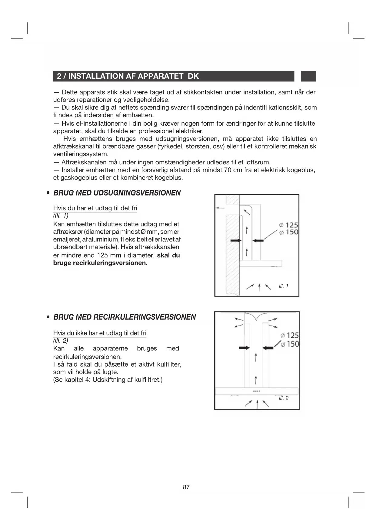 - BRUG MED RECIRKULERINGSVERSIONEN Hvis du har et udtag til det fri (Ill. 1) Kan emhætten tilsluttes dette udtag med et aftræksrør (diameter på mindst Ø mm, som er emaljeret, af aluminium, eksibelt eller lavet af ubrændbart materiale). Hvis aftrækskanalen er mindre end 125 mm i diameter, skal du bruge recirkuleringsversionen. Hvis du ikke har et udtag til det fri (ill. 2) Kan alle apparaterne bruges med recirkuleringsversionen. I så fald skal du påsætte et aktivt kul lter, som vil holde på lugte. (Se kapitel 4: Udskiftning af kul ltret.) — Dette apparats stik skal være taget ud af stikkontakten under installation, samt når der udføres reparationer og vedligeholdelse. — Du skal sikre dig at nettets spænding svarer til spændingen på indenti kationsskilt, som ndes på indersiden af emhætten. — Hvis el-installationerne i din bolig kræver nogen form for ændringer for at kunne tilslutte apparatet, skal du tilkalde en professionel elektriker. — Hvis emhættens bruges med udsugningsversionen, må apparatet ikke tilsluttes en afktrækskanal til brændbare gasser (fyrkedel, storsten, osv) eller til et kontrolleret mekanisk ventileringssystem. — Aftrækskanalen må under ingen omstændigheder udledes til et loftsrum. — Installer emhætten med en forsvarlig afstand på mindst 70 cm fra et elektrisk kogeblus, et gaskogeblus eller et kombineret kogeblus.