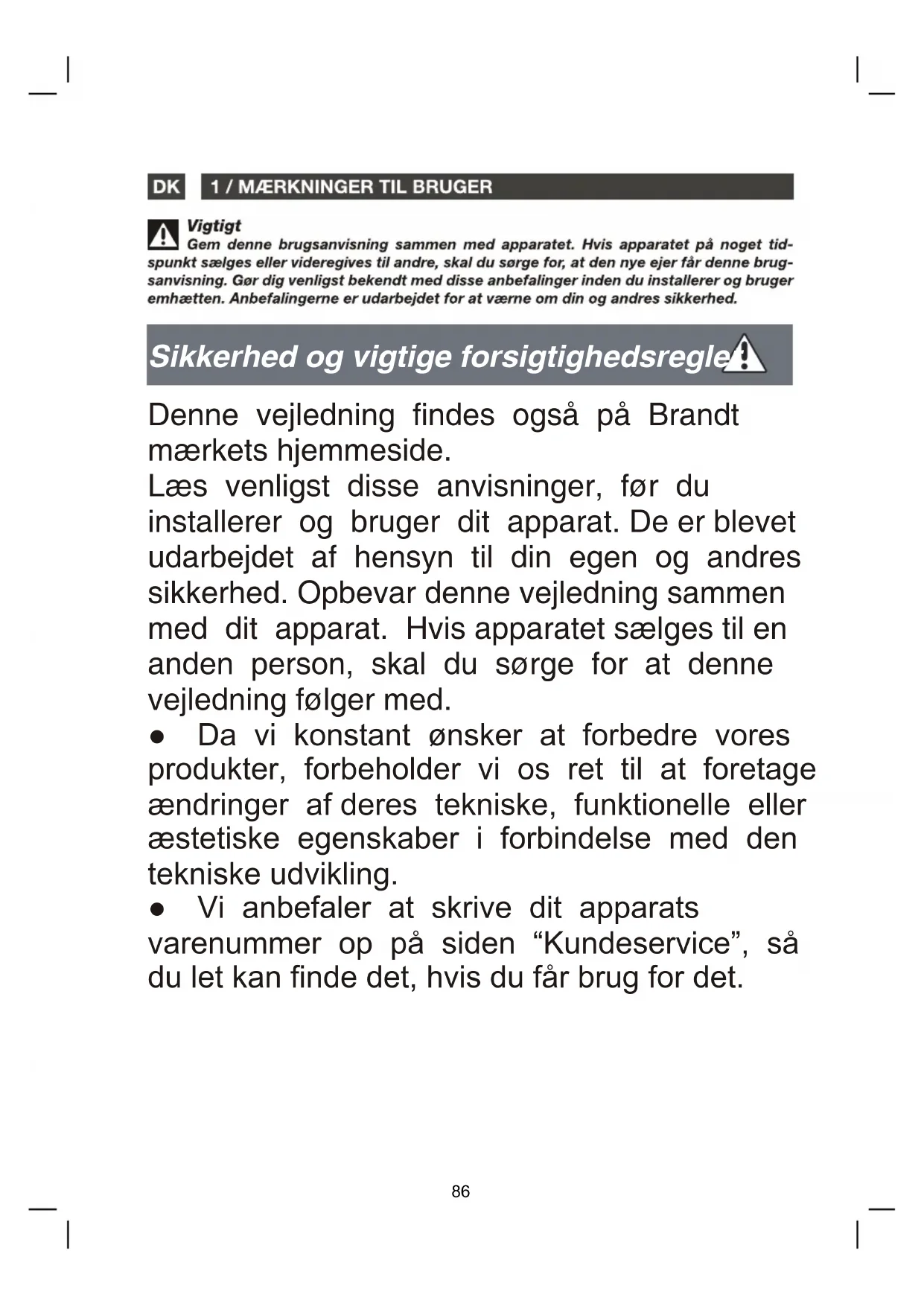 97Sikkerhed og vigtige forsigtighedsregler Denne vejledning findes også på Brandt mærkets hjemmeside. Læs venligst disse anvisninger, før du installerer og bruger dit apparat. De er blevet udarbejdet af hensyn til din egen og andres sikkerhed. Opbevar denne vejledning sammen med dit apparat. Hvis apparatet sælges til en anden person, skal du sørge for at denne vejledning følger med. ● Da vi konstant ønsker at forbedre vores produkter, forbeholder vi os ret til at foretage ændringer af deres tekniske, funktionelle eller æstetiske egenskaber i forbindelse med den tekniske udvikling. ● Vi anbefaler at skrive dit apparats varenummer op på siden “Kundeservice”, så du let kan finde det, hvis du får brug for det. 86Vigtige forsigtighedsregler Dette apparat er designet til at blive brugt i en almindelig husholdning. Det må ikke anvendes til en erhvervsmæssig eller industriel brug eller til andre formål end det, det er beregnet til. ● Når dette apparat modtages, skal det straks pakkes ud. Kontroller apparatets generelle fremtoning. Formuler eventuelle forbehold skriftligt på fragtsedlen og behold et eksemplar af den. ● Dette apparat kan bruges af børn på mindst 8 år og af personer med et fysisk, sensorisk eller mentalt handicap eller manglende kendskab, hvis de er under korrekt opsyn eller hvis de har modtaget instrukser om sikker brug af apparat og hvis der er taget højde for de risici, de udsætter sig for. Børn må ikke lege med apparatet. Brugerens rengøring og vedligeholdelse af apparatet må ikke udføres af børn uden opsyn. OBS: De dele, der er tilgængelige på denne emhætte, kan blive meget varme, når emhætten bruges over et komfur.